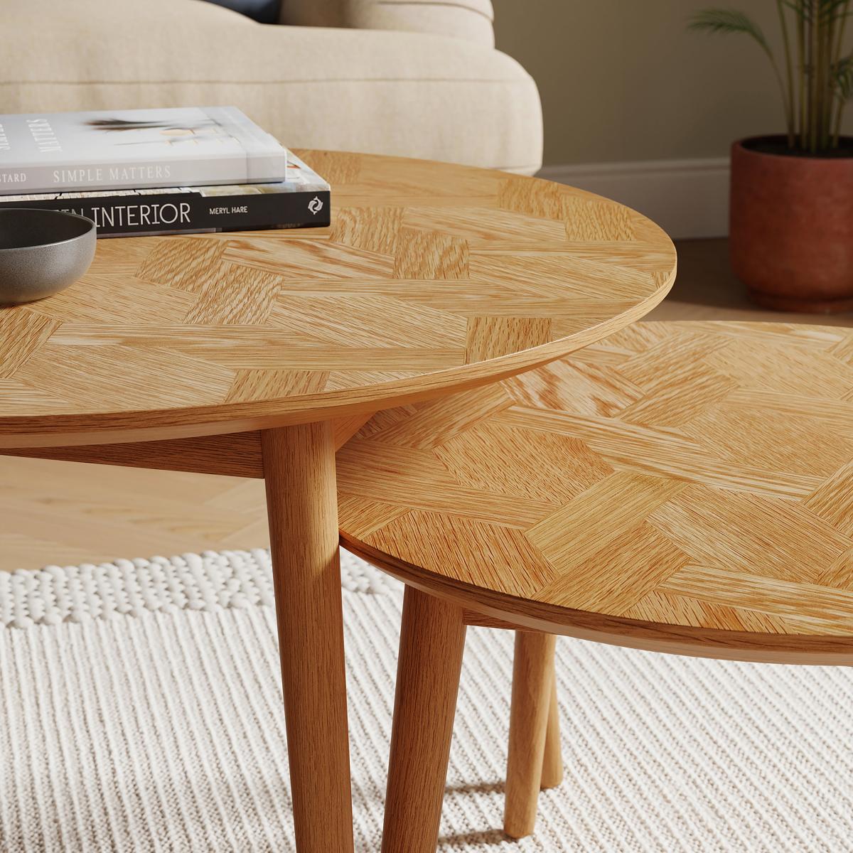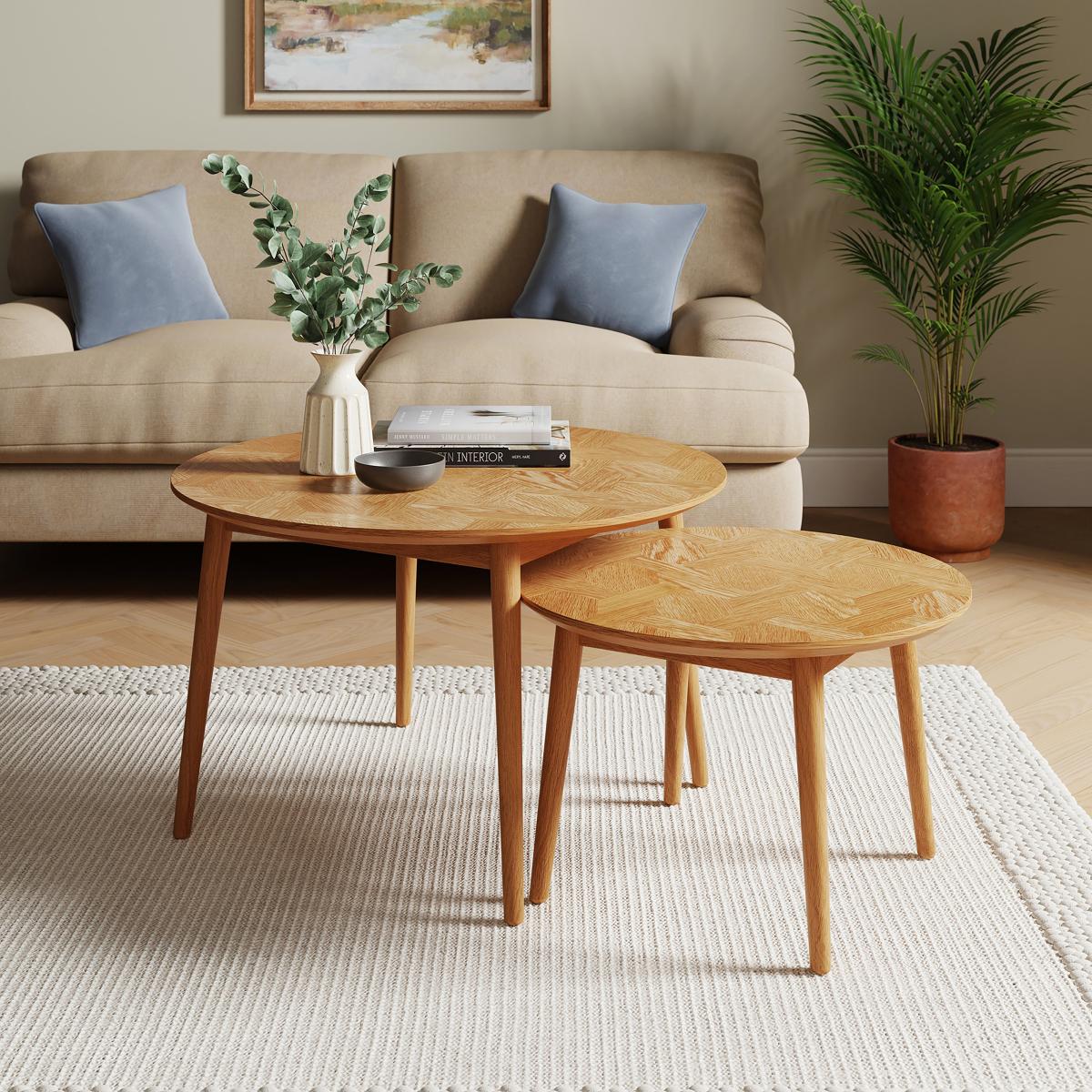 I love the Farris Nest of Coffee Tables for its warm, light oak finish, which adds a natural and versatile touch to various interiors. It works especially well in Scandi, modern, and mid-century inspired spaces, thanks to its clean lines and understated beauty. As a styling tip, consider layering the tables with a few well-chosen decorative pieces like a stack of books, candles, or a small plant to keep the look balanced and inviting. These tables are practical for creating a flexible setup - perfect for accommodating different groups of guests or changing your layout as needed, while bringing a touch of understated elegance to any living room.