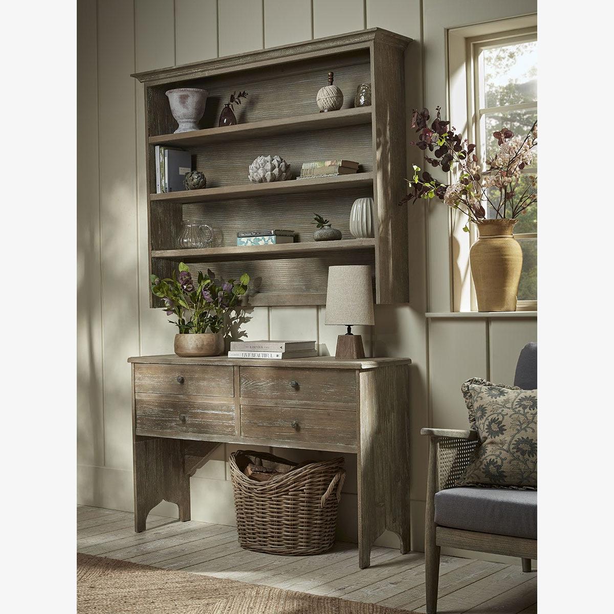 I love this sideboard and shelf combo for its rustic, versatile character, making it a great fit for both traditional and country-inspired interiors. It’s perfect for adding warmth and texture, while offering ample storage and display space. Practical styling tips include grouping books, vases, and decorative objects on the shelves for a curated look, and using the top surface to layer table lamps or plants to add height and visual interest. Its neutral tone also makes it easy to incorporate with a variety of colour schemes, whether you're going for a calm, understated vibe or something more eclectic. It's a reliable piece that brings both form and function to living or dining rooms, or even a bedroom or hallway.