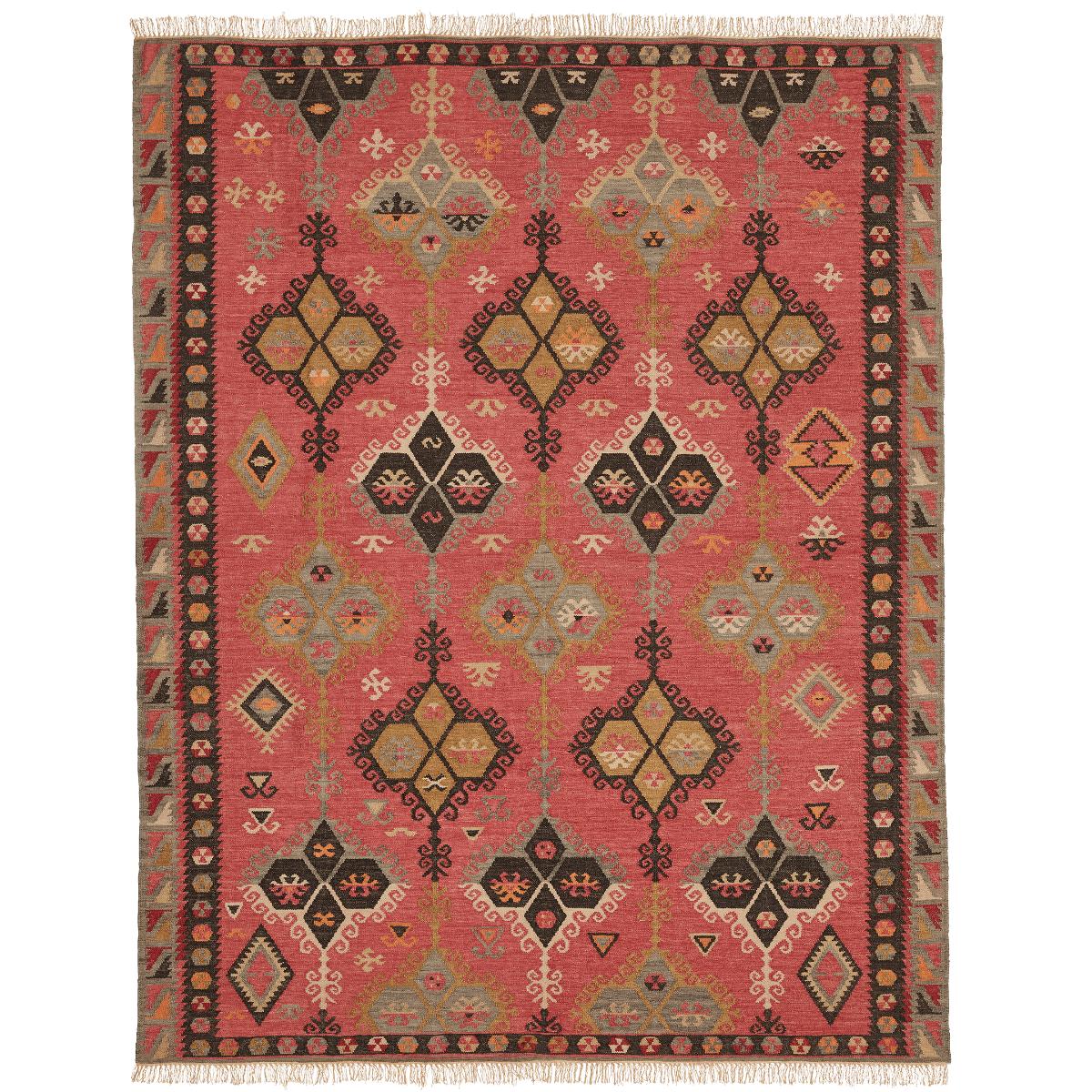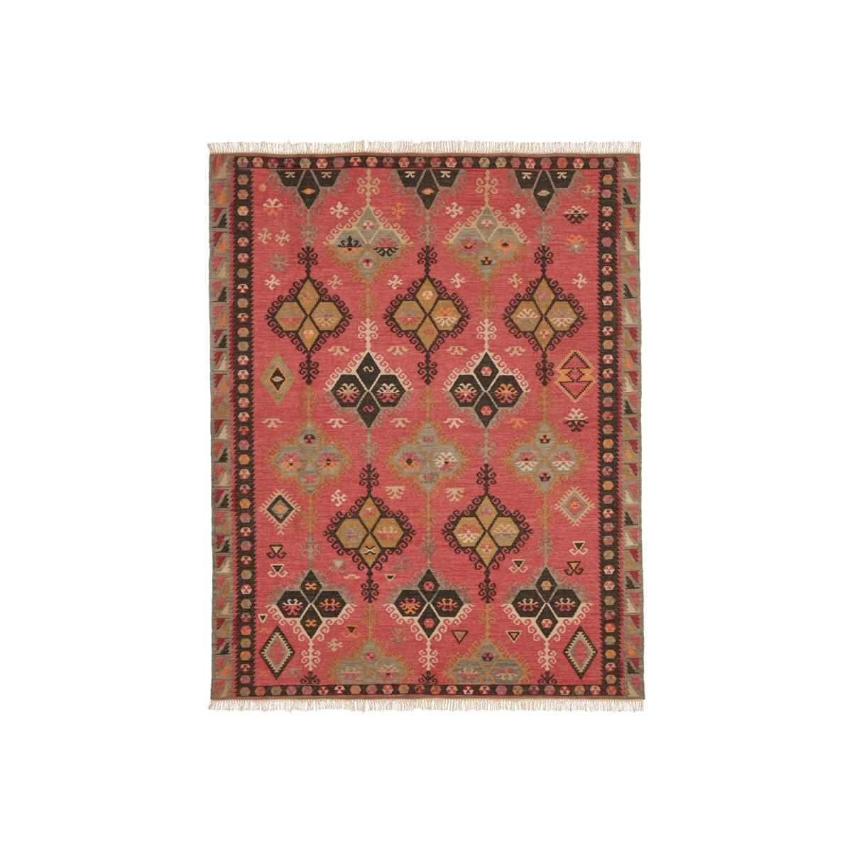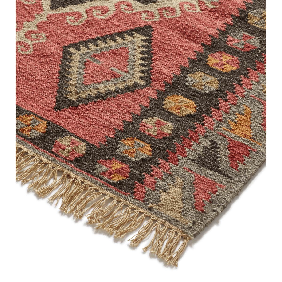 The vivid and colourful design of our Farva Rug is handwoven on an authentic and traditional Kilim loom, just like the designs that have inspired it. It features rich reds, pale blues and bright golds in bold motifs that are framed by a geometric border and a neutral fringe. The origins of kilims range from Balkan regions through to Northern Africa, which is what makes them complementary to so many design styles. They have been used for millennia to bring warmth, decoration and communication through their colourful symbolic motifs. Kilims differ from knotted rugs as they are interwoven from variously coloured wefts (horizontal yarns) and warps (vertical yarns) to create a flatwoven tapestry rug with no pile. They often have stepped, diagonal patterns which are formed through their distinct weaving technique in which the yarn turns around the warp where the colour changes, rather than running across the full width of the piece.