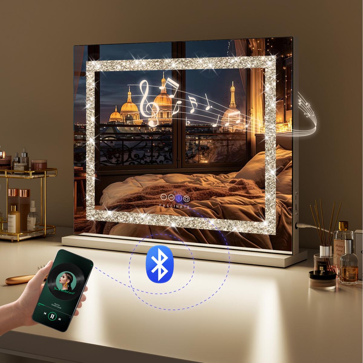 Elevate your daily routine with the FASCINATE Hollywood LED Vanity Mirror. Designed for flawless beauty application, this stunning mirror features bright, dimmable LED lights with three adjustable colour modes (warm, natural, cool) for perfect illumination. A built-in 10x magnifying mirror ensures precision, while integrated Bluetooth speakers allow you to enjoy music or calls. Keep your devices powered with the convenient USB charging port. Crafted with durable tempered glass and showcasing a dazzling crushed diamond design, it offers versatile freestanding or wall-mounted installation, making it ideal for any dressing table or modern bathroom.