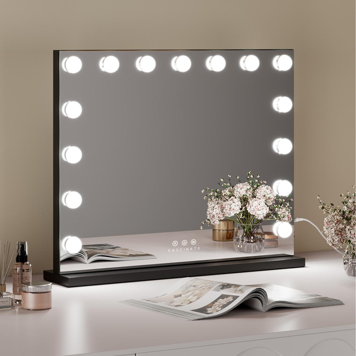 Unleash your inner star with the FASCINATE Hollywood Vanity Mirror. Designed for makeup aficionados, this stunning black-framed mirror features 15 bright, dimmable LED bulbs with three adjustable colour modes (cool, natural, warm) to flawlessly illuminate your face for any occasion. Its versatile design supports both elegant tabletop placement and secure wall mounting, easily controlled by a touch-sensitive panel. Stay connected while you glam up thanks to the built-in Type-C and USB charging ports. Achieve professional-level precision with the included detachable 10x magnifying glass, perfect for intricate detail work. Crafted from durable stainless steel, this modern rectangular mirror adds a touch of glamour and exceptional functionality to any bedroom or dressing area.