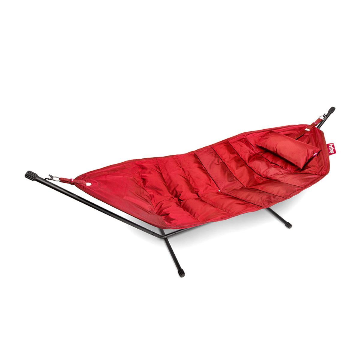 The Fatboy hammock, is the ultimate in relaxation, whether you're sipping cocktails in the shade or taking a well-earned nap. The red polyester hammock is filled with foam for ultimate comfort and is supported by a sturdy metal frame. You can fly solo or snuggle up with someone else; the Fatboy hammock can fit up to three people (maximum weight-150kg). With water and UV resistant fabric the colour never fades and with the dirt and moisture repellent fabric, it's easy to clean. Key features: * Material: polyester with PVC coating, metal stand * Dimensions: 330x100x110cm * Weight: 23.8kg * Red hammock * Metal support frame * Maximum weight: 150kg * Please note pillow not included but available separately * Dirt and moisture repellent * Easy cleaning with lukewarm water and neutral soap * Water and UV resistant * Please note colour may vary slightly due to batch material