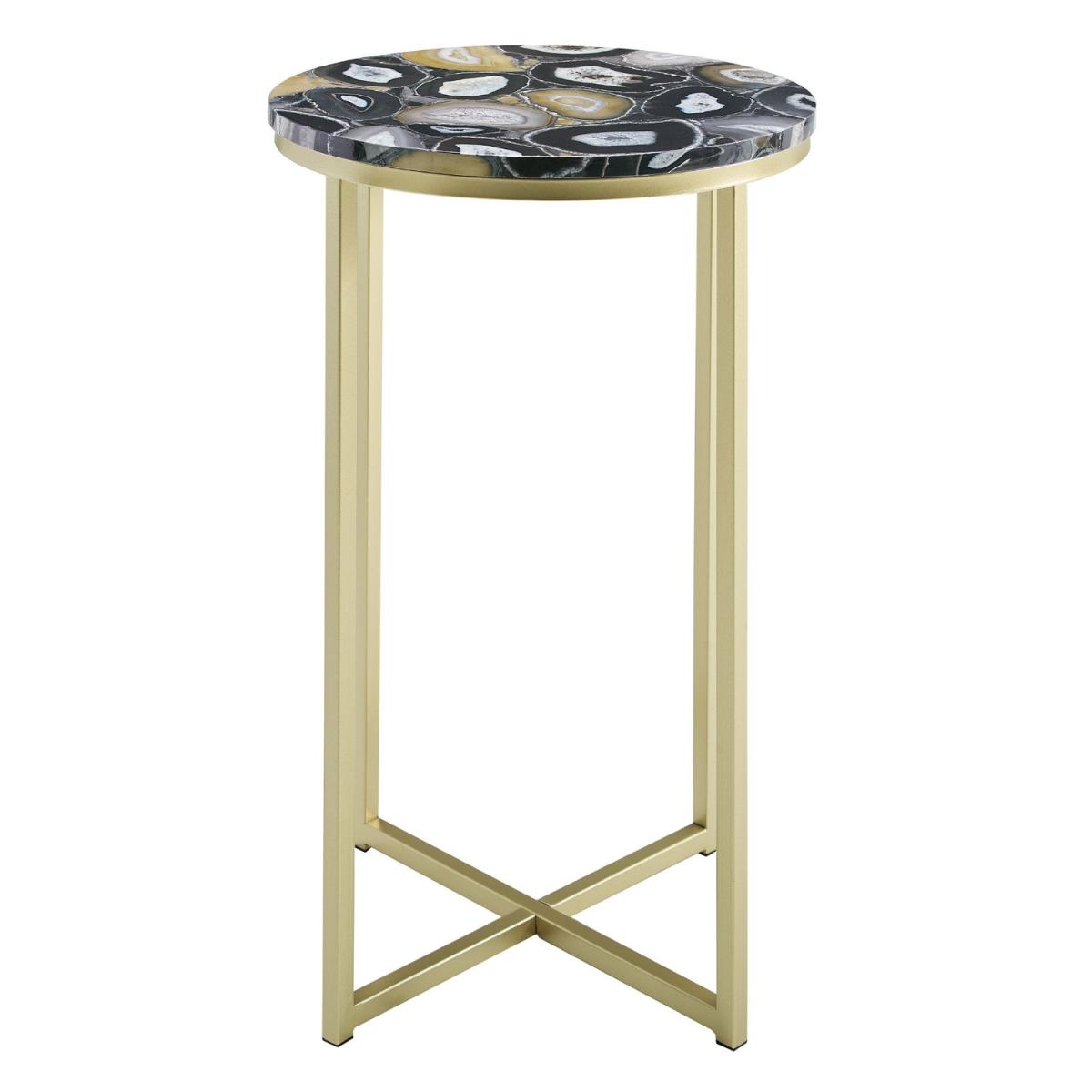 Dimensions H117 x W97 x D97 cm. Revitalise your living room with this stylish modern side table. Tapping into trends for stone tops it comes in a sliced agate or grey vein cut marble finish coated with UV gloss to provide a realistic and moisture-resistant surface for happy hour at home. The perfect companion to your luxe interior the gold metal accents add a touch of effortless glam. Its small dimensions make it ideal for squeezing into small spaces (like next to your sofa in the living room) or next to your bed as a striking contemporary bedside table. The crossed base provides extra stability for your lamps or other living room essentials and rubber capped feet keep the piece from sliding or scratching your floor. Features. Modern glam side table Faux agate or marble finishes. Painted metal X-legs. Rubber capped feet to protect flooring and prevent slidingUV gloss coating for a polished moisture-resistant finish. Made from warp-resistant MDF and durable laminate..