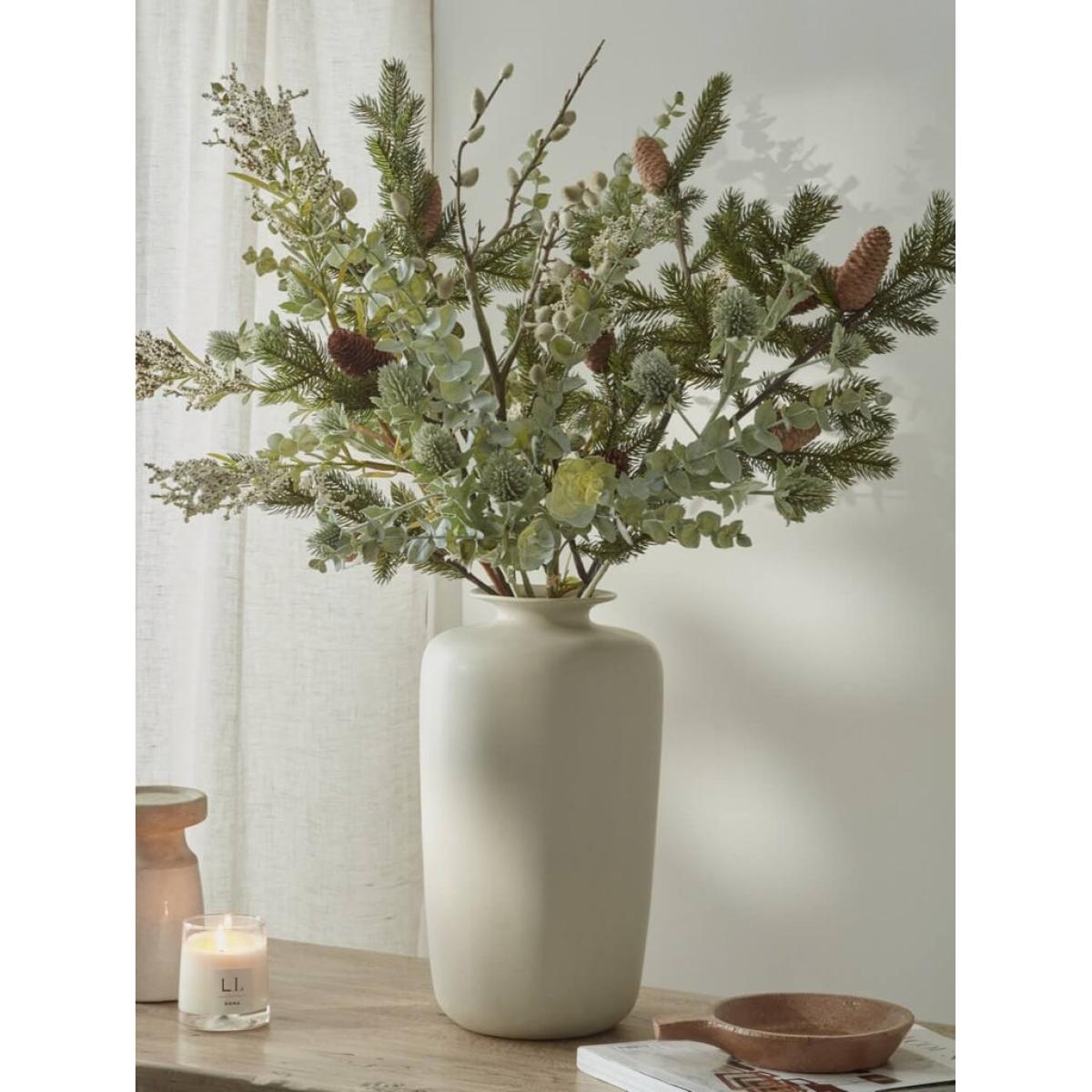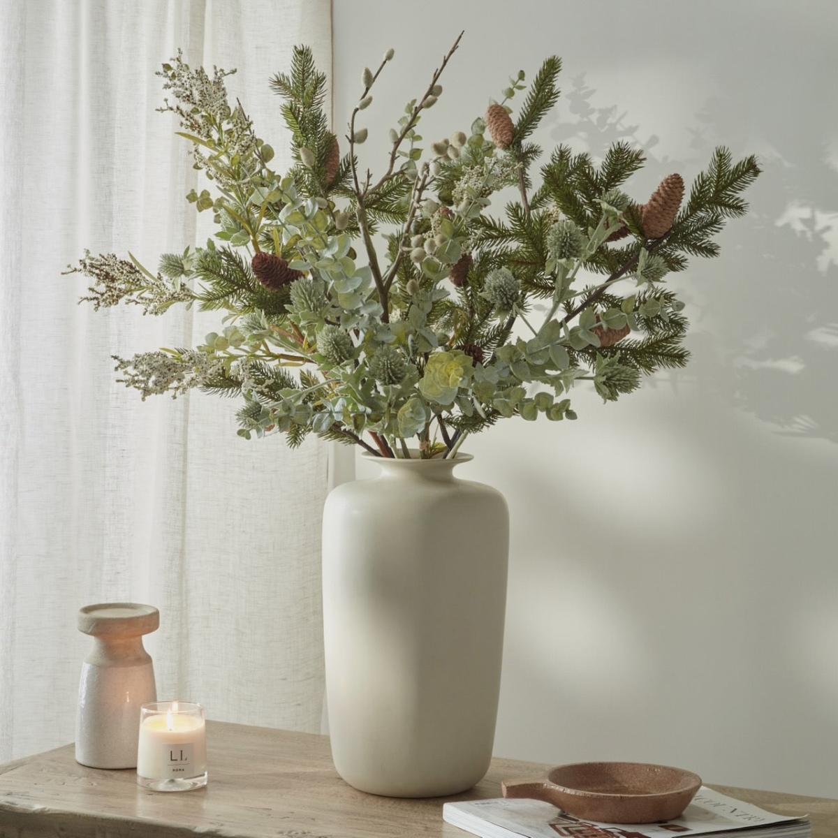 I love this faux winter bouquet because it offers a lush, seasonal touch without the maintenance of fresh flowers. It works well in both modern and more traditional interiors, especially in neutral or muted colour schemes where it can add a subtle, natural element. To style it effectively, consider placing it in a simple, contemporary vase like this one-its understated shape allows the foliage to take centre stage. For added visual interest, pair it with other textures or natural materials, such as wooden or ceramic accessories, and keep it as a focal point on sideboards or consoles. A tip would be to keep the foliage looking fresh by occasionally gently fluffing the arrangement-faux flowers benefit from movement and irregularity to feel authentic.