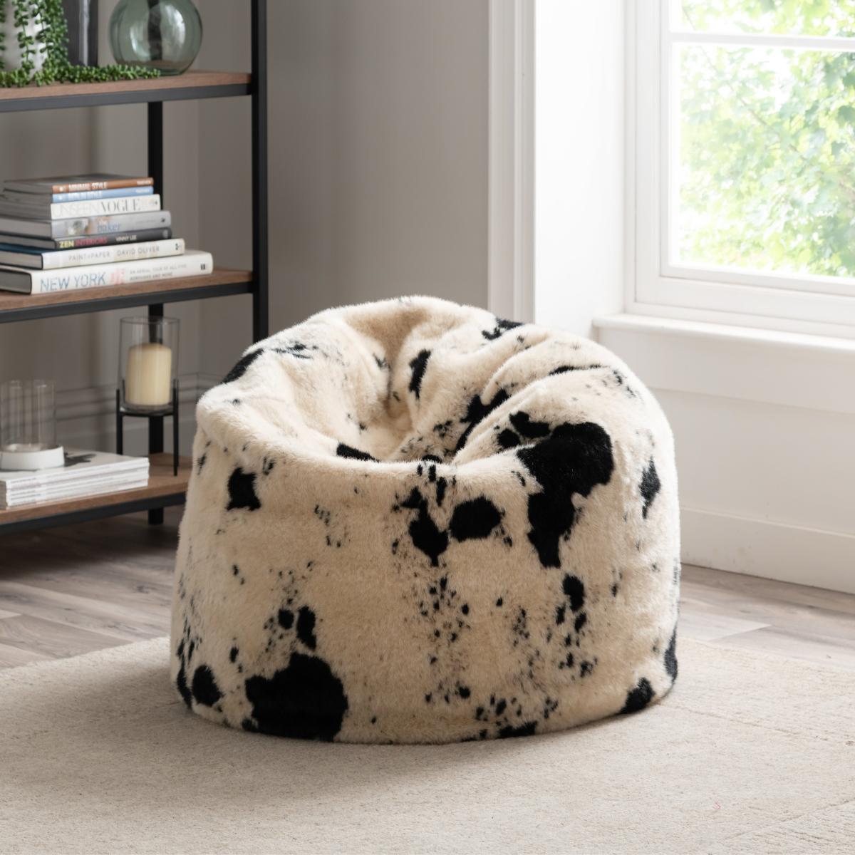 I love this faux fur cow hide beanbag for its cosy, tactile appeal and versatile styling potential. It works exceptionally well in casual or contemporary interiors, adding a punch of texture and a relaxed vibe. The mix of black and beige tones makes it easy to incorporate into neutral palettes or to contrast with bold colours. Practical styling tips include pairing it with sleek, minimalist furniture for a balanced look or using it as a statement piece in a texturally layered scheme. It’s perfect for creating a relaxed reading nook or adding a touch of comfort to living rooms and bedrooms, offering both style and functional comfort.