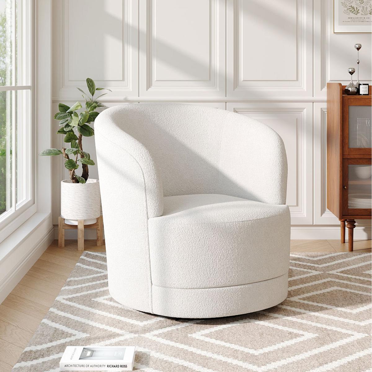 I love the cosy yet sophisticated vibe of this faux fur swivel chair. It works brilliantly in contemporary or Scandinavian-inspired interiors, adding a touch of luxe and softness to living rooms, bedrooms, or even home offices. To style it effectively, consider pairing it with minimalist furniture in neutral tones for a sleek look, or with bold coloured accessories to create a striking focal point. Practical tips include positioning it near natural light to highlight the texture of the faux fur or layering it with textured cushions for added visual interest and comfort. Its versatility makes it a real winner for creating inviting, chic spaces.