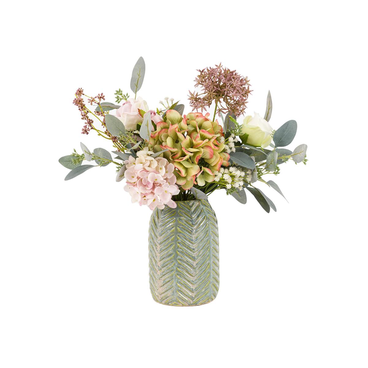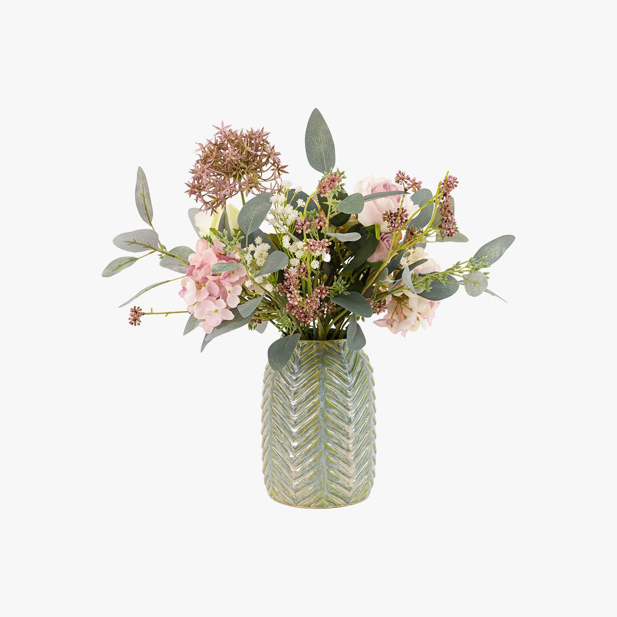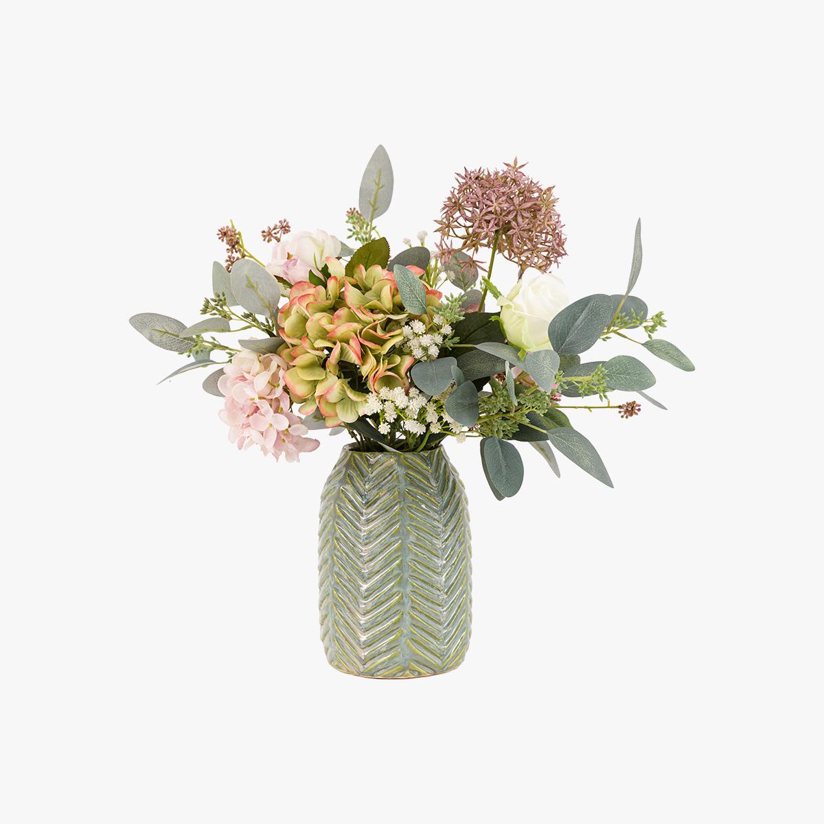 I love this faux hydrangea arrangement for its versatility and low-maintenance appeal. As a stylist, I find it works wonderfully in a variety of settings, from modern minimalist spaces to more traditional interiors, adding a soft, natural touch without the upkeep of fresh blooms. It’s particularly effective in neutral or muted colour palettes, where it can subtly enhance the overall decor. Practical styling tips include placing it on a side table or shelf to add visual interest, or grouping it with other faux plants to create a curated, relaxed vignette. The ceramic vase complements both contemporary and classic interiors, making it an easy yet stylish addition to any room.