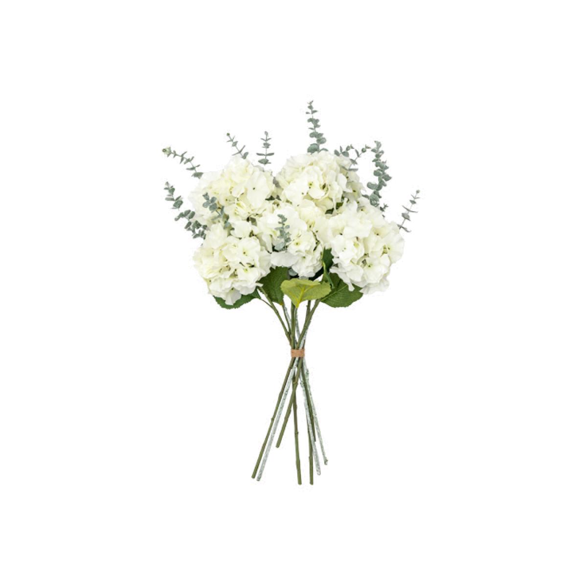 Everlasting blooms featuring soft white hydrangea flowers and sprigs of fresh looking greenery are brought together to create a beautifully romantic bouquet that will never fade or wilt.