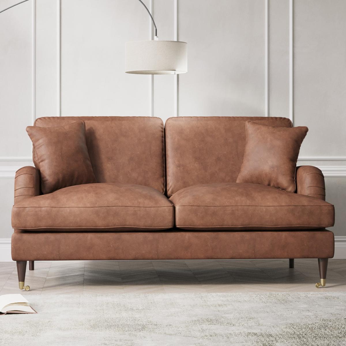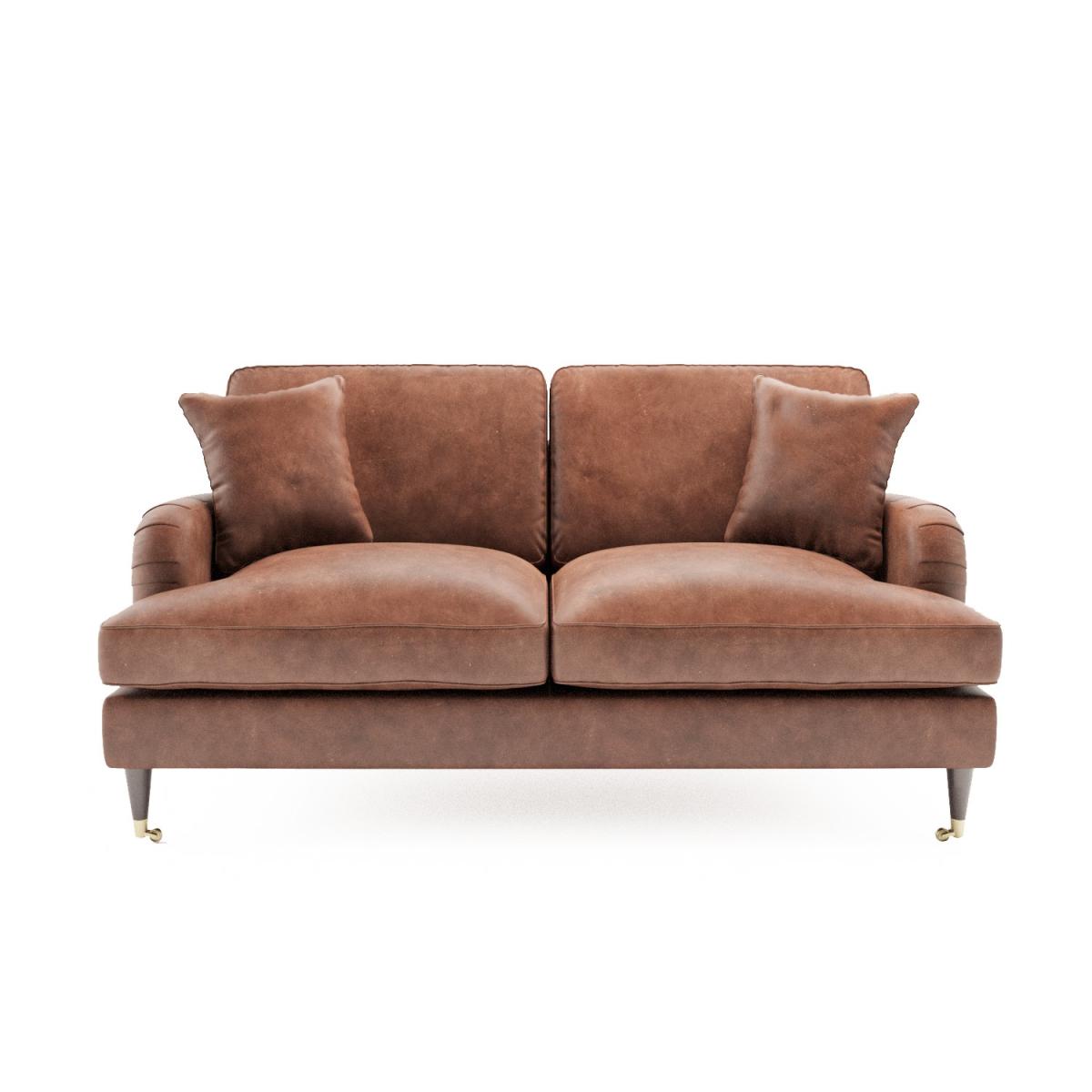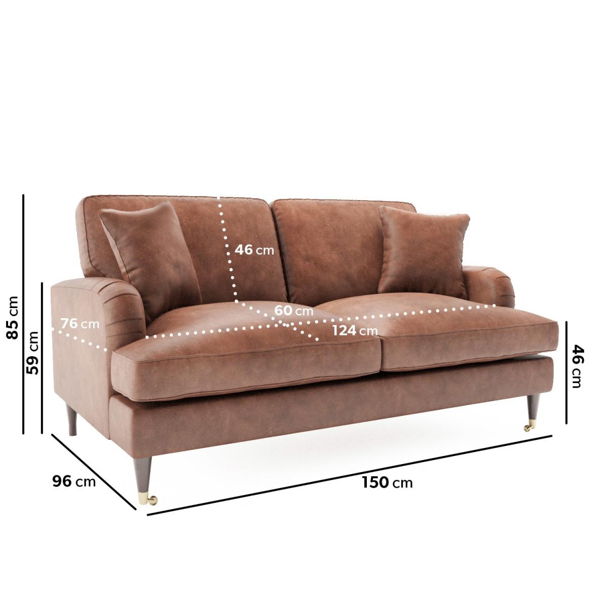 Features we love Beautifully upholstered 2 seater sofa in a tan faux leather Saddle arms, tailored piping and deep, plump, seating gives it a modern silhouette Accompanied by two matching throw cushions for added style and comfort Both the seat and back cushions are filled with comfortable and spongey foam Minimum assembly; it's just a case of fixing the legs into position Cushion covers are removeable - to clean, we recommend using a damp cloth All about me Discover maximum comfort and minimum maintenance with this gorgeous2 seater sofa. This plush Payton sofa offers traditional styling with a modern twist thanks to its dark wooden legs with gold accent front castors and classic ruched saddle arms. Beautifully tailored and upholstered in a tan faux leather, it brings a splash of natural warmth to your living space, making it the perfect statement piece. It comfortably seats two and comes accompanied with two matching throw cushions which add a final flourish of elegance. Adding this trend-setting piece to your home is easy. There's minimum assembly; it's just a case of fixing the legs into position. The castor wheels can't be removed from the legs. Need to know Overall dimensions: H85 x W150 x D96 cm Seating dimensions: W124 x D60 cm Packed dimensions:H61 x W152 x D98 cm Packed weight: 50 kg Colour: Tan Finish: Faux leather upholstery and wooden legs Material: Wooden frame and legs and metal castors Filling: Foam Assembly required: Minimal - just screw in the legs! Removable castor wheels: No