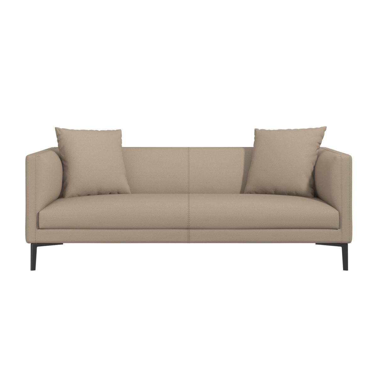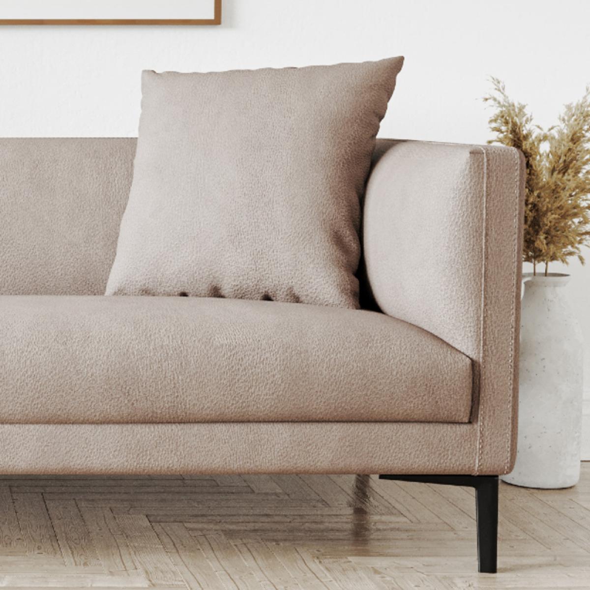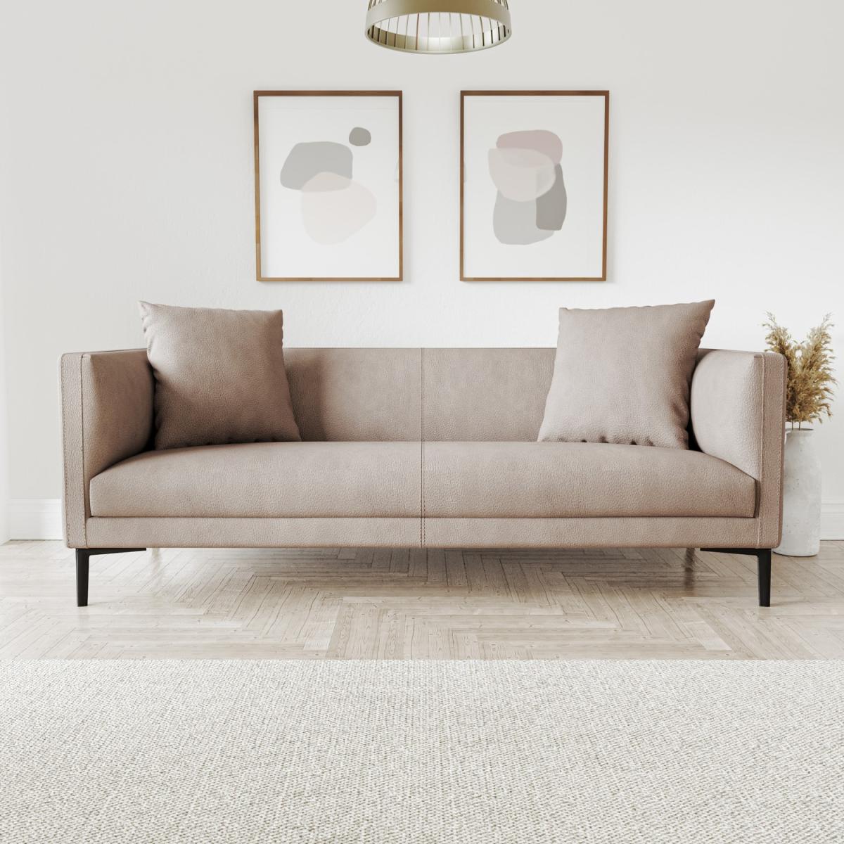Features we love Beige three-seater sofa with contrasting metal legs. Upholstered in soft faux leather with stitch detailing. Simple Nordic inspired design with curved padded arms. Foam-filled seat and back cushions for added comfort Minimal assembly required just attach the legs. All about me Discover maximum comfort and minimum maintenance with this 3-seater sofa. Upholstered is a gorgeous soft faux-leather upkeep could not be easier simply wipe clean to get rid of any accidental spills. This plush beige sofa is sure to add interest to any natural colour scheme and bring some warmth into your space. It has a high build quality with a eucalyptus and plywood frame finished with sturdy black powder-coated metal legs. It comfortably seats three and comes accompanied with two matching throw cushions which add a final flourish of elegance. Need to know. Dimensions. H72 x W200 x D85cm Weight. 46kg Max supported weight. 110kg per seat Colour. Beige Finish. Upholstered Material. Faux leather with eucalyptus and plywood frame with metal legs Filling type. Foam Cushions included. Yes Assembly required. Yes - just the legs..