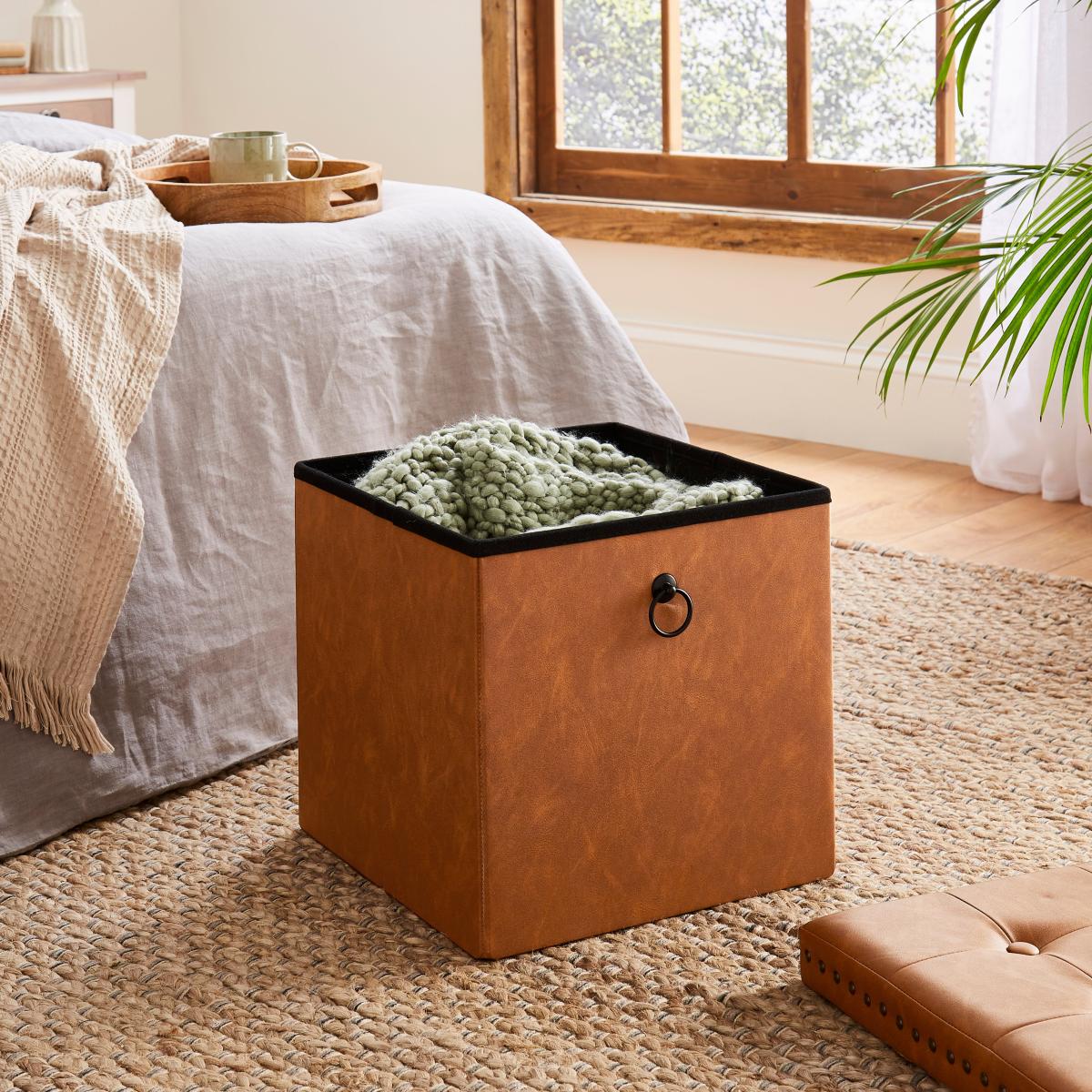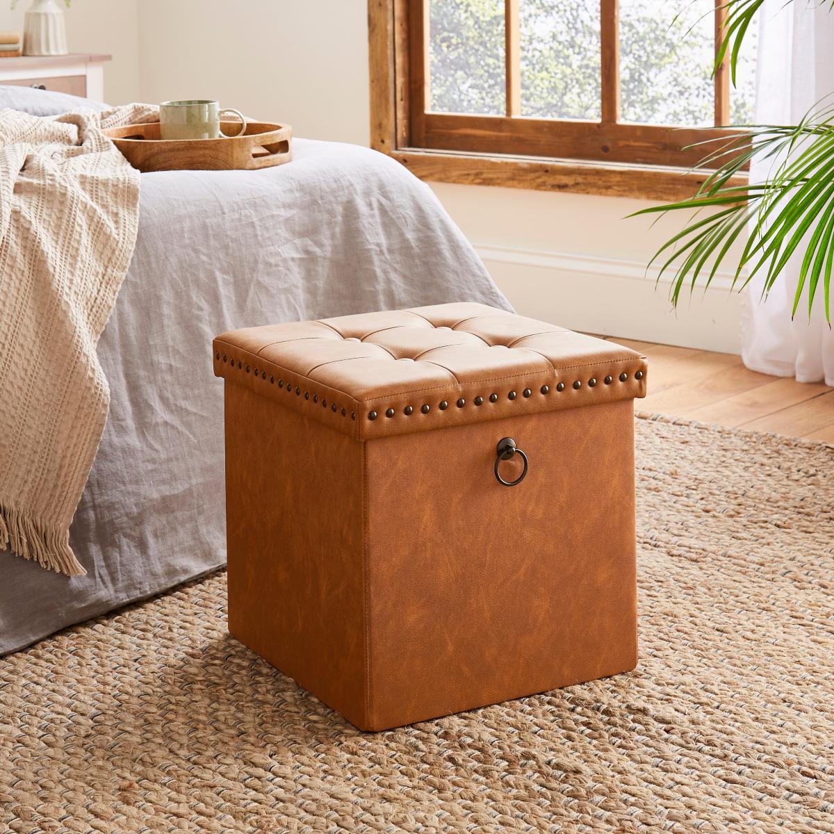 Welcoming the Faux Leather Cube Ottoman in Tan, a stylish and versatile addition to any room. Designed with attention to detail, this exceptional piece seamlessly combines functionality and sophistication. Experience the convenience of easy assembly as our Faux Leather Cube Ottoman can be set up in seconds. No need for complicated instructions or frustrating tool usage – simply unfold and enjoy the benefits right away. Immerse yourself in the comfort of our ottoman, designed to provide a cosy seating option: whether you're entertaining guests or enjoying a quiet moment alone, its sleek faux leather upholstery creates a comfortable and stylish place to sit. Maximise your storage possibilities with our versatile ottoman. Its spacious interior allows you to conveniently store blankets, pillows, or any other essentials, keeping your living area organised and clutter-free. Indulge in the luxury of a footrest as our ottoman provides the perfect spot to rest your feet after a long day: sink into its soft surface and experience ultimate relaxation and comfort. Get yours now!.