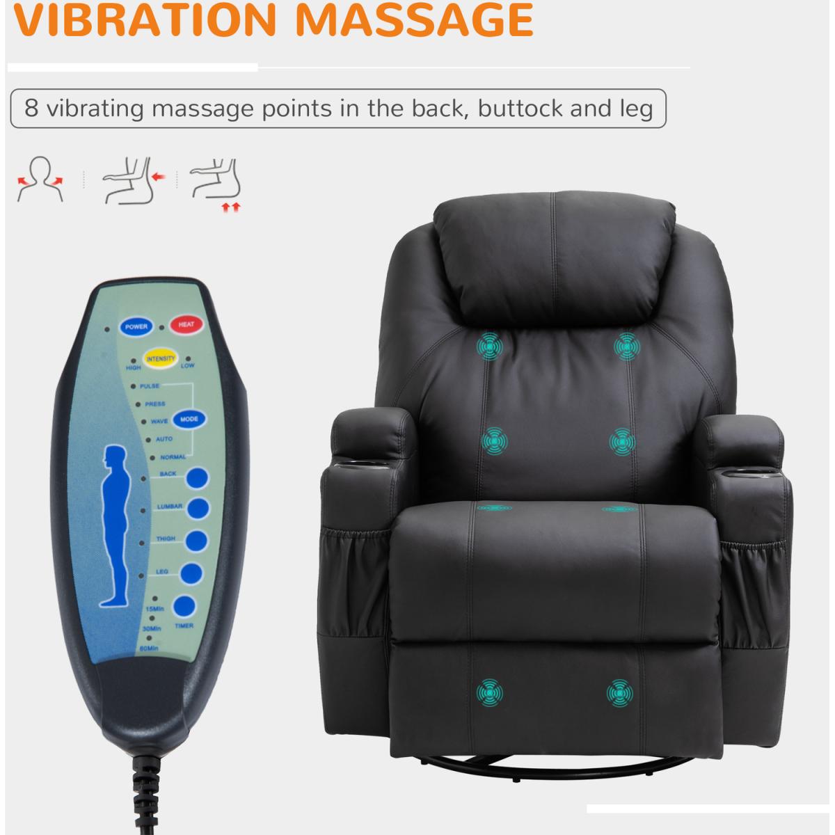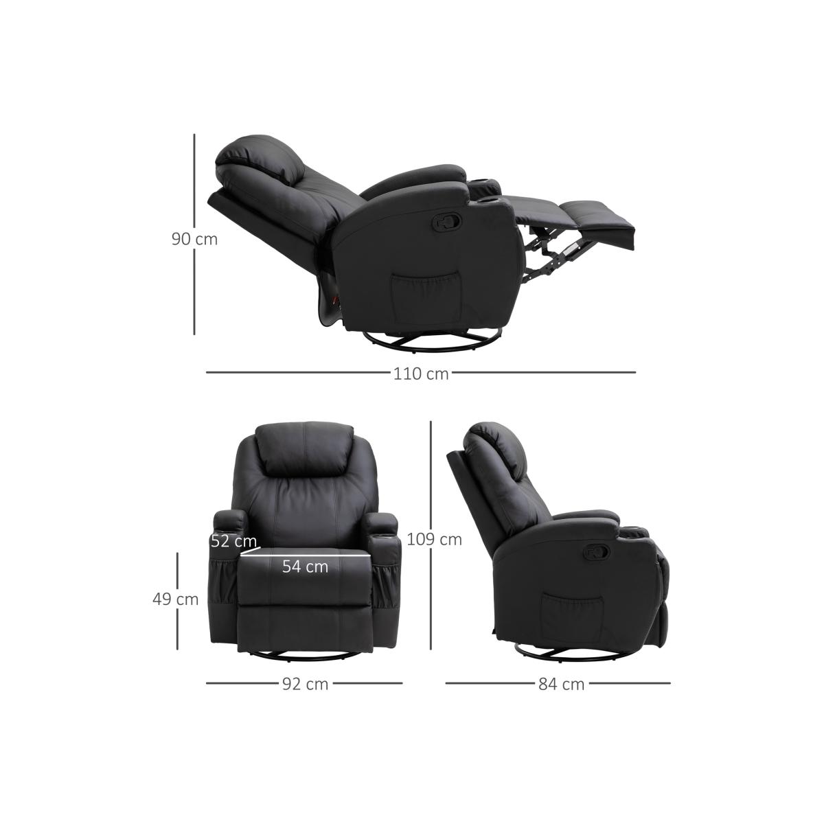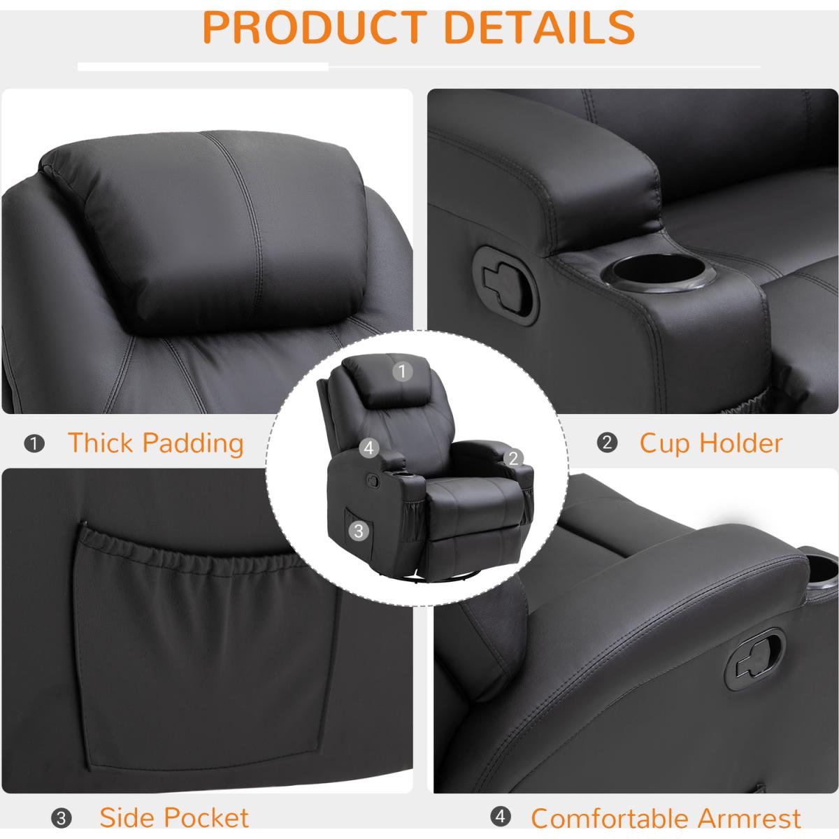 Sink into supreme comfort - with sleek style to match: get this recliner chair from HOMCOM. Its overstuffed upholstery is 22 cm thick, which features a high back and armrests to support your body too. Eight massage points, controlled by the remote, are fitted on the back, lumbar, thighs and calves to soothe your body all over. Finished with sleek PU leather upholstery. Release the stress of a long day, anytime, with this impressive and bold chair.