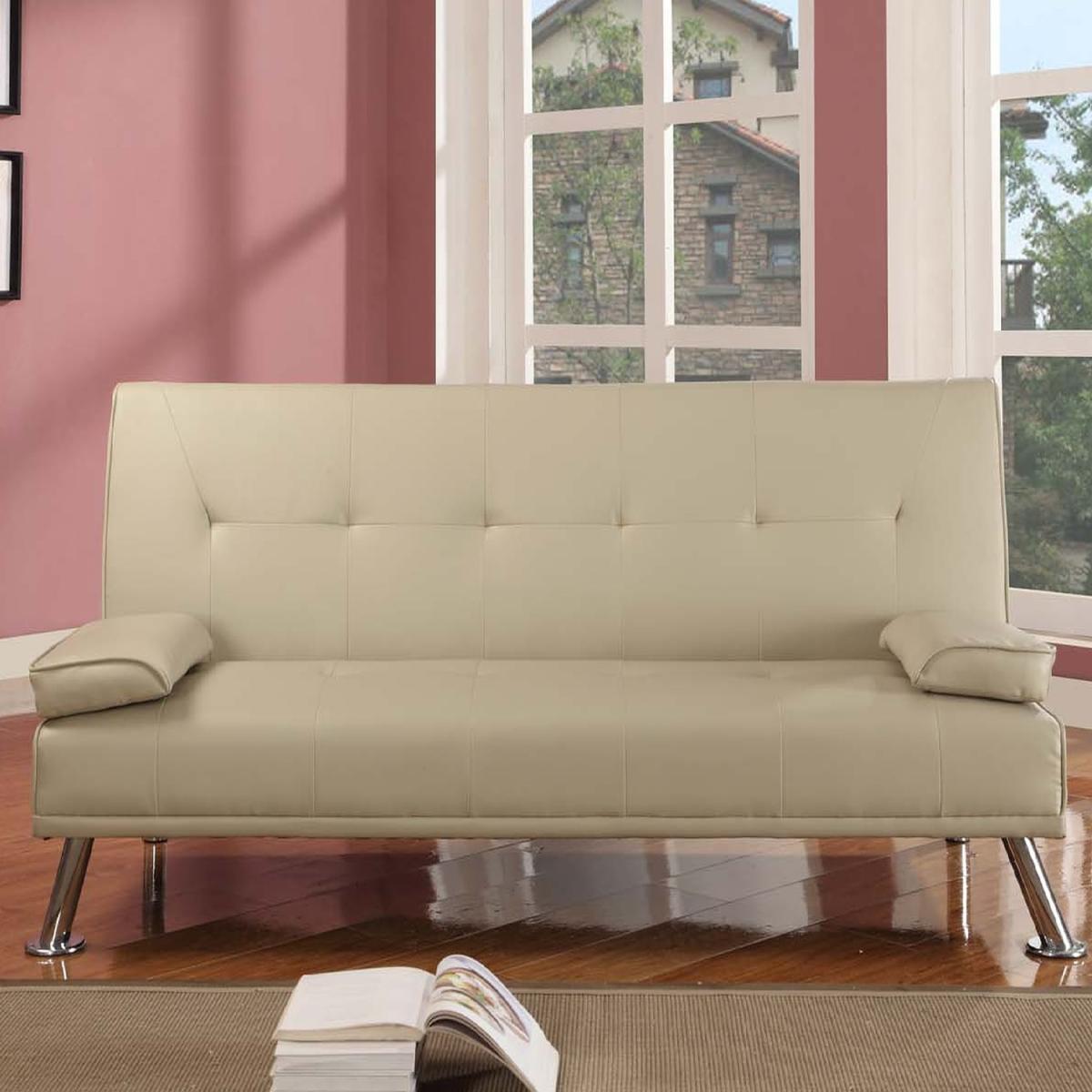 This Sofa Bed is a stunning piece of furniture and would be a great new addition to your home. It can be used in a bedroom or in the living room, bringing a contemporary touch to the room. This sofa uses the ingenious, faultless 'click-clack' mechanism, allowing you to have the sofa positioned in one of 3 ways - Sitting, Reclining or Sleeping. Converting in seconds. This Italian Style Sofa bed is stylish and highly functional. Made of high quality faux leather, this multi-functional sofa bed offers great durability and stain resistant properties. The polished chrome legs gives it that extra addition of designer glamour. This sofa comes with two arm rests (not attaches), that double up as pillows when in bed mode