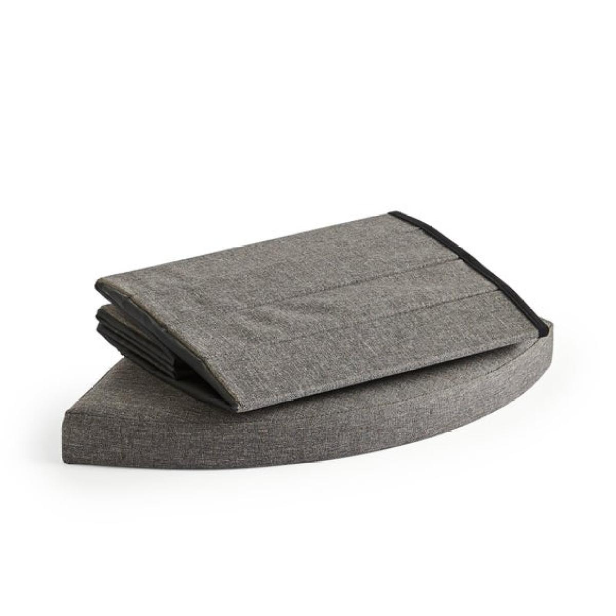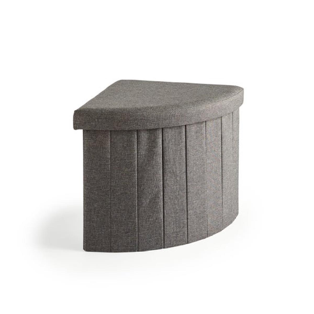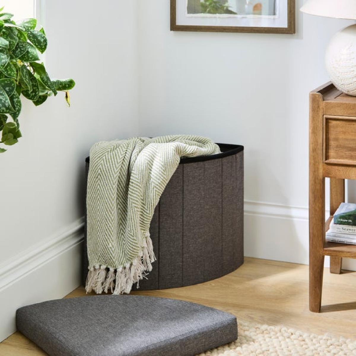 * Faux linen material * Corner design * Available in multiple colours * Made from polyester A seat, a footrest, and a storage box—all in one sleek corner design! This faux linen ottoman assembles in seconds. Perfect for maximising space in small rooms, it tucks neatly into any corner while offering hidden storage for blankets, books, or anything you need.