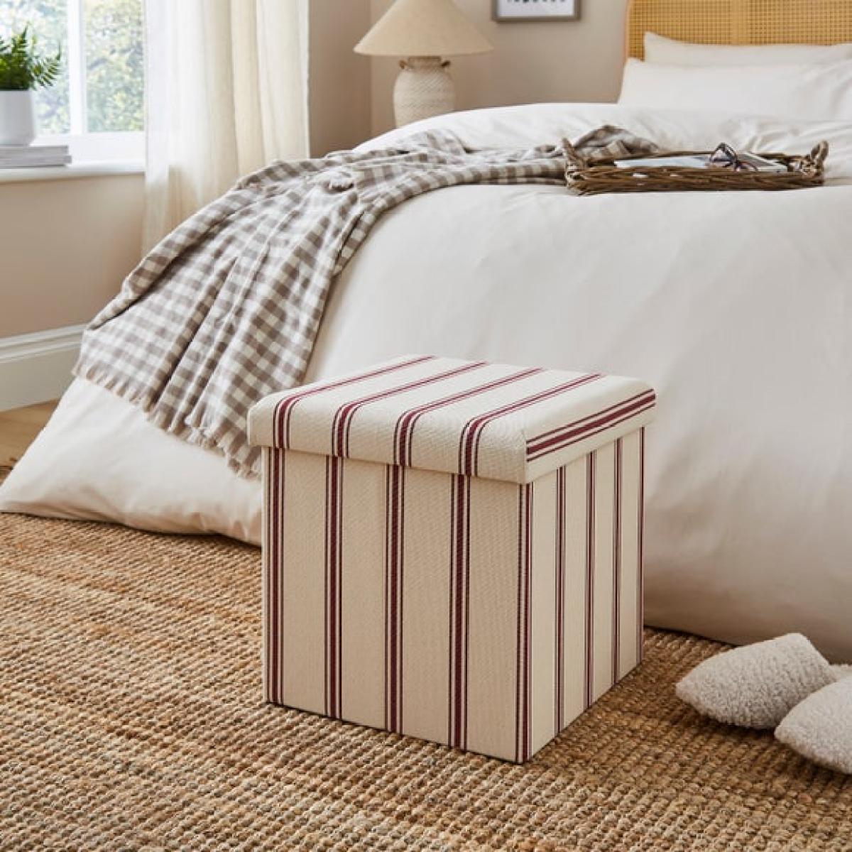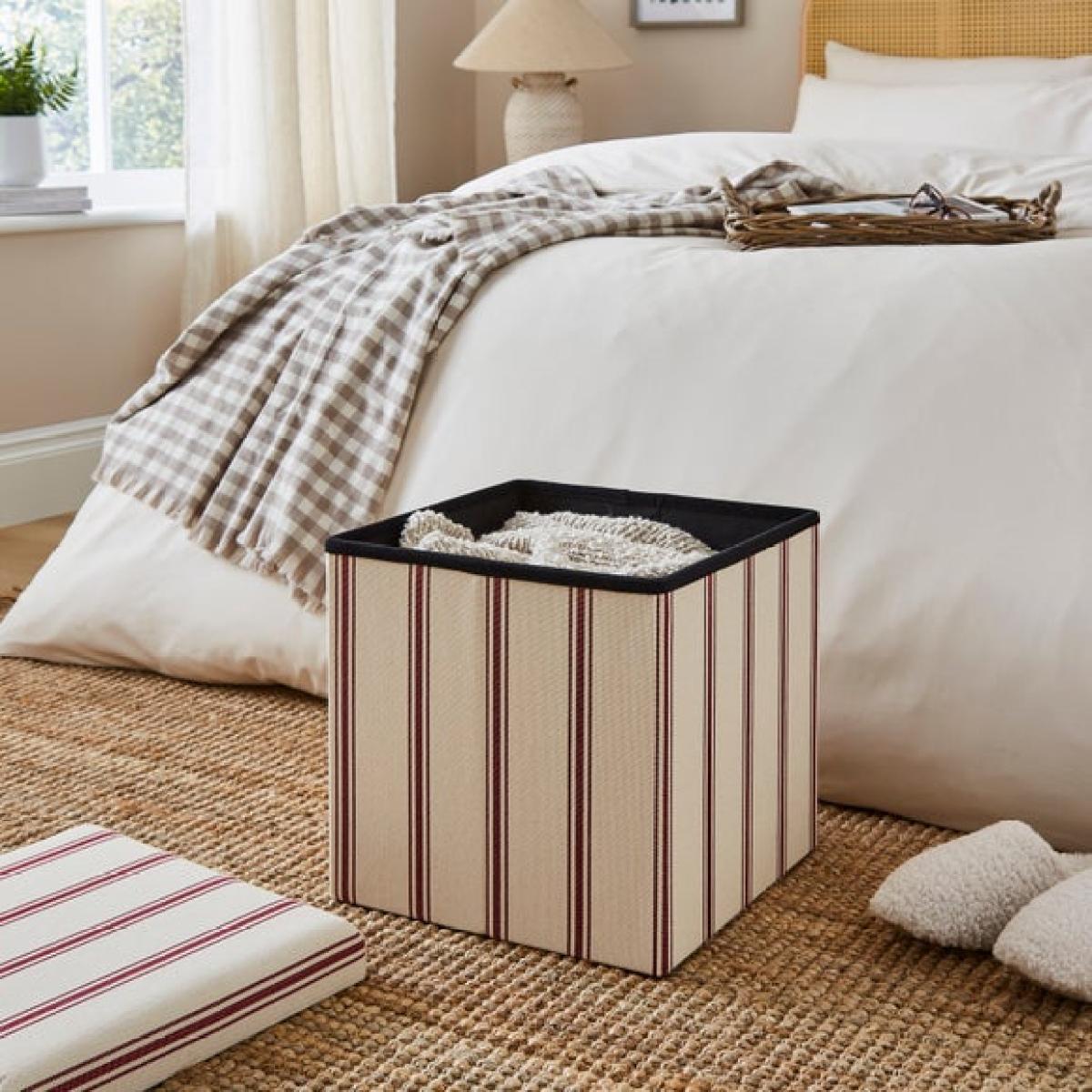 * Large capacity storage * Foldable * Striped design * Multi-use ottoman - use as a storage box or footrest or seat * No tools needed to assemble Bring effortless style and handy storage to your space with our Faux Linen Folkstone Stripe Cube Ottoman. Featuring a chic striped design and generous capacity, it’s perfect for keeping clutter neatly hidden. The clever foldable build means it’s quick to assemble with no tools required, and just as easy to tuck away when not in use. Versatile and functional, this ottoman doubles as a storage box, a comfy footrest, or an extra seat, making it a smart addition to any room.