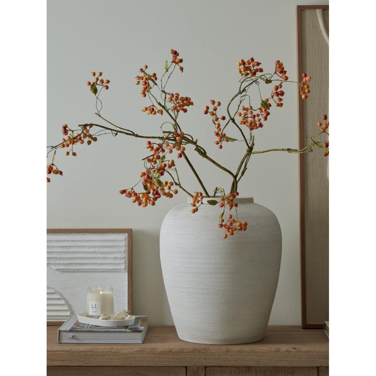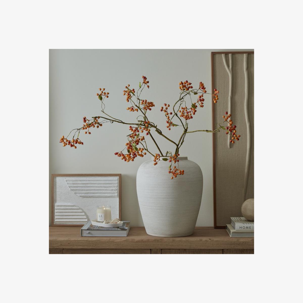 Such a pretty tall faux stem, this faux orange berry is ideal for adding some Autumnal tones to your decor this season. Create a beautiful bouquet by adding them to a foliage based bouquet or style alone for a modern, whimsical look.  Styled here is a set of 3 stems in our Textured Cream Vase.