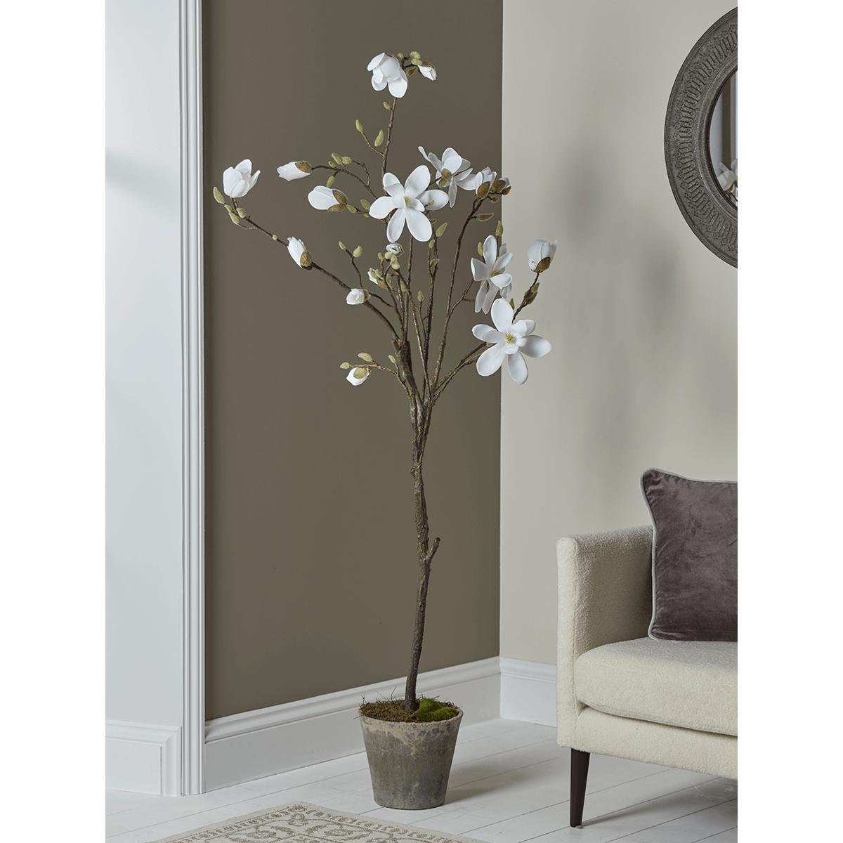 With delicate snow white flowers, some in full bloom and others just on the brink, and wonderfully realistic touches such as new buds, an intricately detailed trunk and moss in the pot, our Faux Potted Magnolia Tree will add beauty and poise to any room. Pair with one of our fabulous. Indoor Planters. Or leave the rustic pot visible and simply let the flowers steal the show.