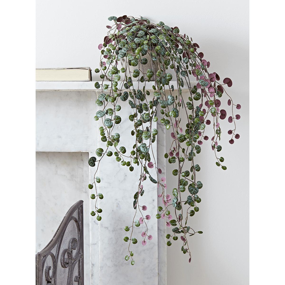 Each potted string of hearts features an abundance of stems with realistic dark green and burgundy leaves, presented in an aged effect pot. Display delicately draped from a kitchen shelf, or hang in your living space for a statement botanical look.