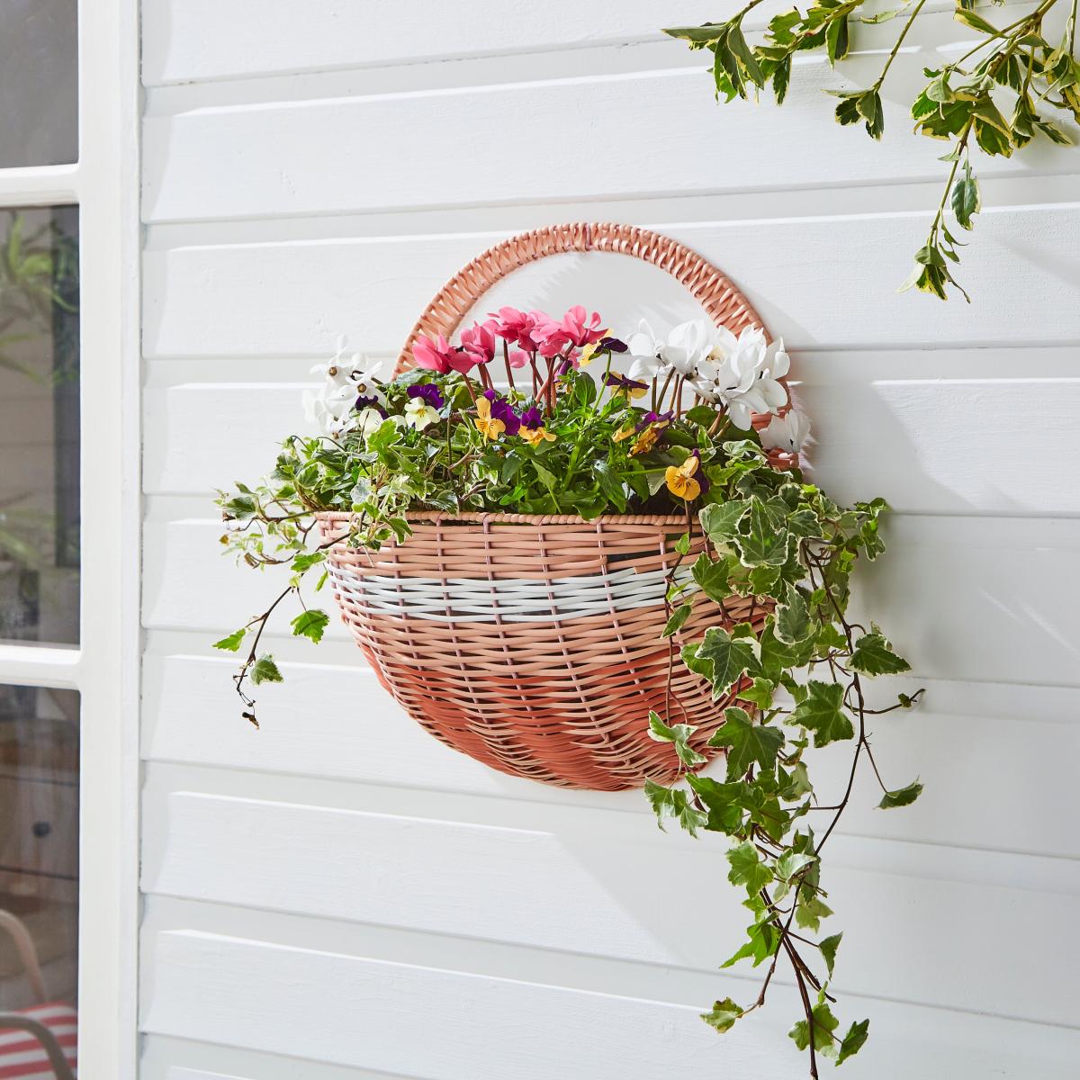 * Half circle design * Wall mountable * Hand-woven faux rattan * Soft coral and white colourway Make the most of your vertical space with this half circle wall mounted hanging basket. Made from hand-woven faux rattan, this hanging basket has a stylish striped design in soft coral and white - the perfect way to bring freshness and vibrant colour to your outdoor space. Simply pop in your favourite plants, either real or artificial, and enjoy. It's easily sponge cleaned to keep it looking fresh.