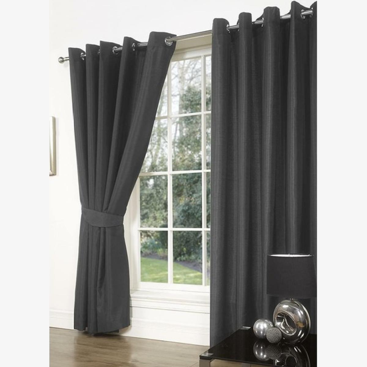 SW Living Luxury Faux Silk Pair Curtains Eyelet Ring Top Heading Lined With Tiebacks. This is a pair of luxury contemporary faux silk (100% polyester) curtains. Faux silk fabric has a soft silky character, which drapes beautifully creating a modern and stylish look. The curtains are fully lined and are finished with chrome ring eyelets. These curtains would hang beautifully in your living room, bedroom or any other room and come complemented with a pair of tiebacks.