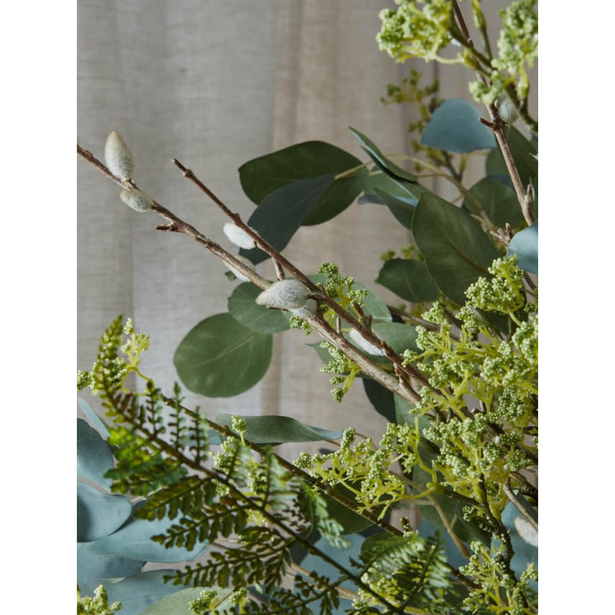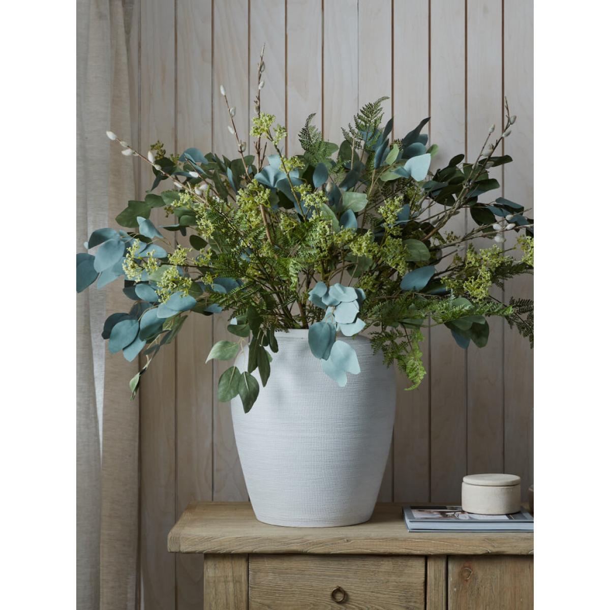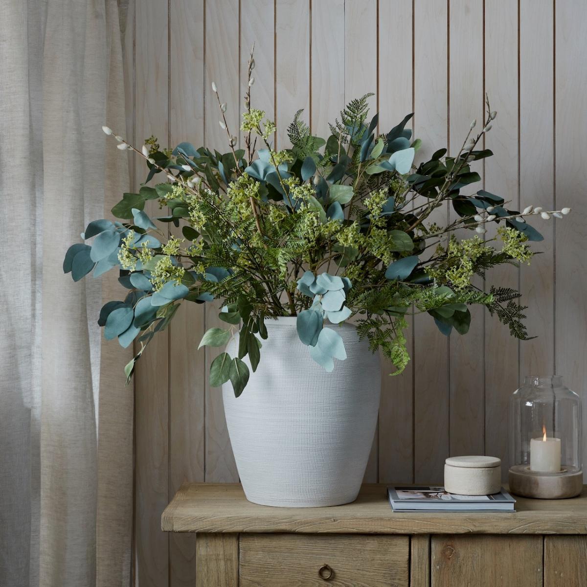 A stylish display which combines silvery green tones of the silver dollar eucalyptus with lime green shades of the buddleia and fern. The finishing touch of pussy willow branches adds a striking dimension to the overall look, breaking it up and keeping it light and airy yet full of volume. Shown styled in our large textured cream vase.