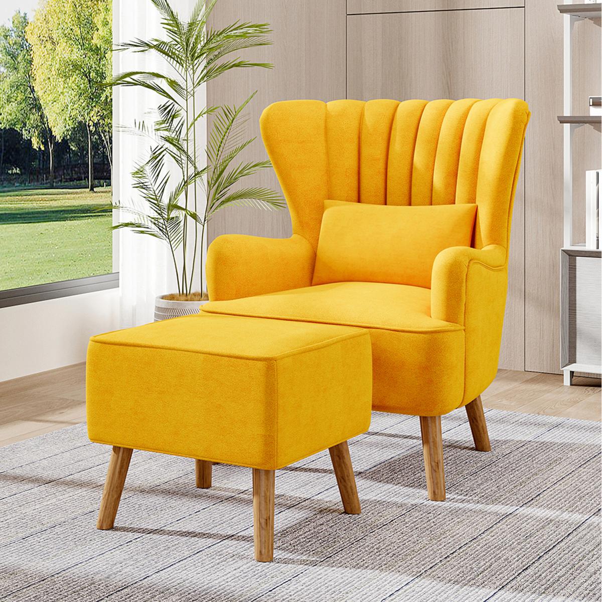 Faux Wool Upholstered Armchair with Cushion and Footrest - Yellow