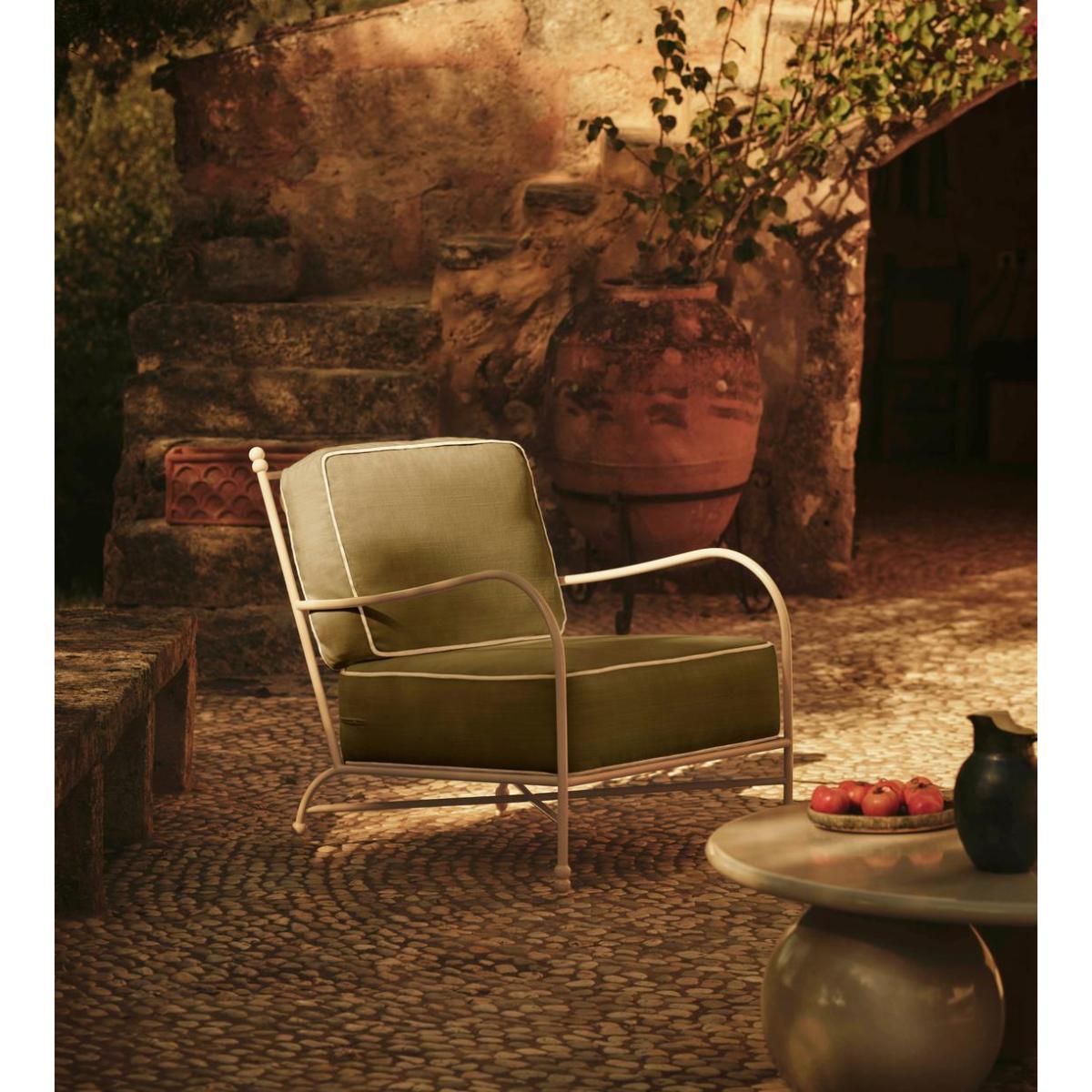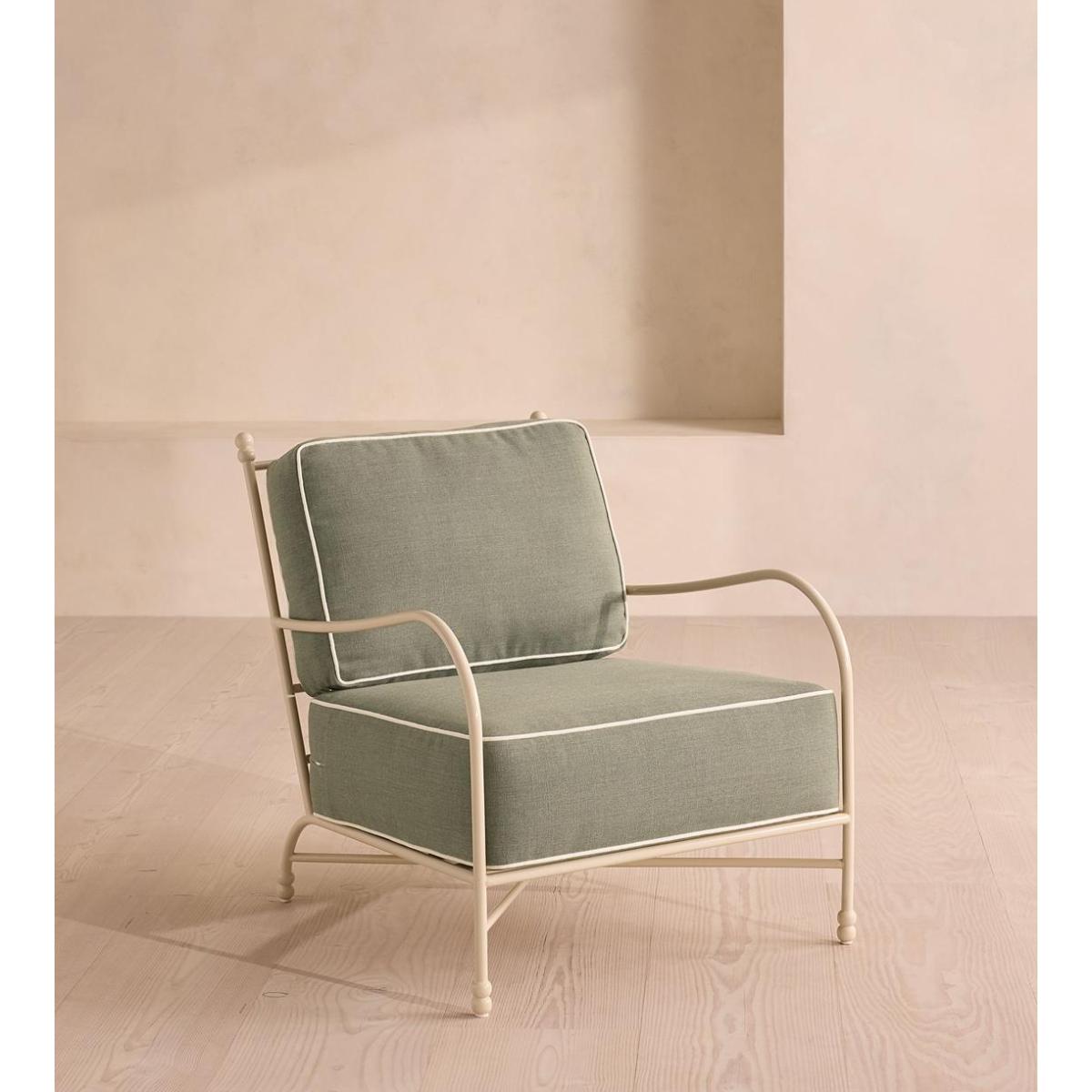 Stainless steel framework creates a distinctive wave-patterned backrest and curved arms that surround removable, upholstered cushions. Designed for outdoor use, the Fawn armchair is crafted from cream metalwork complemented by the off-white piping that surrounds its sage upholstery. Curved arms extend to form two of the chair's four legs, all of which are detailed with double ball feet at the base.