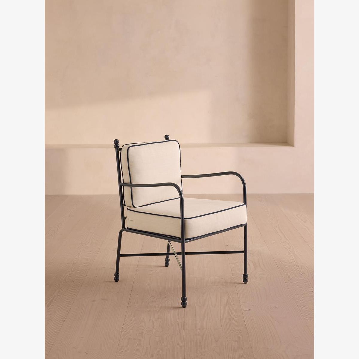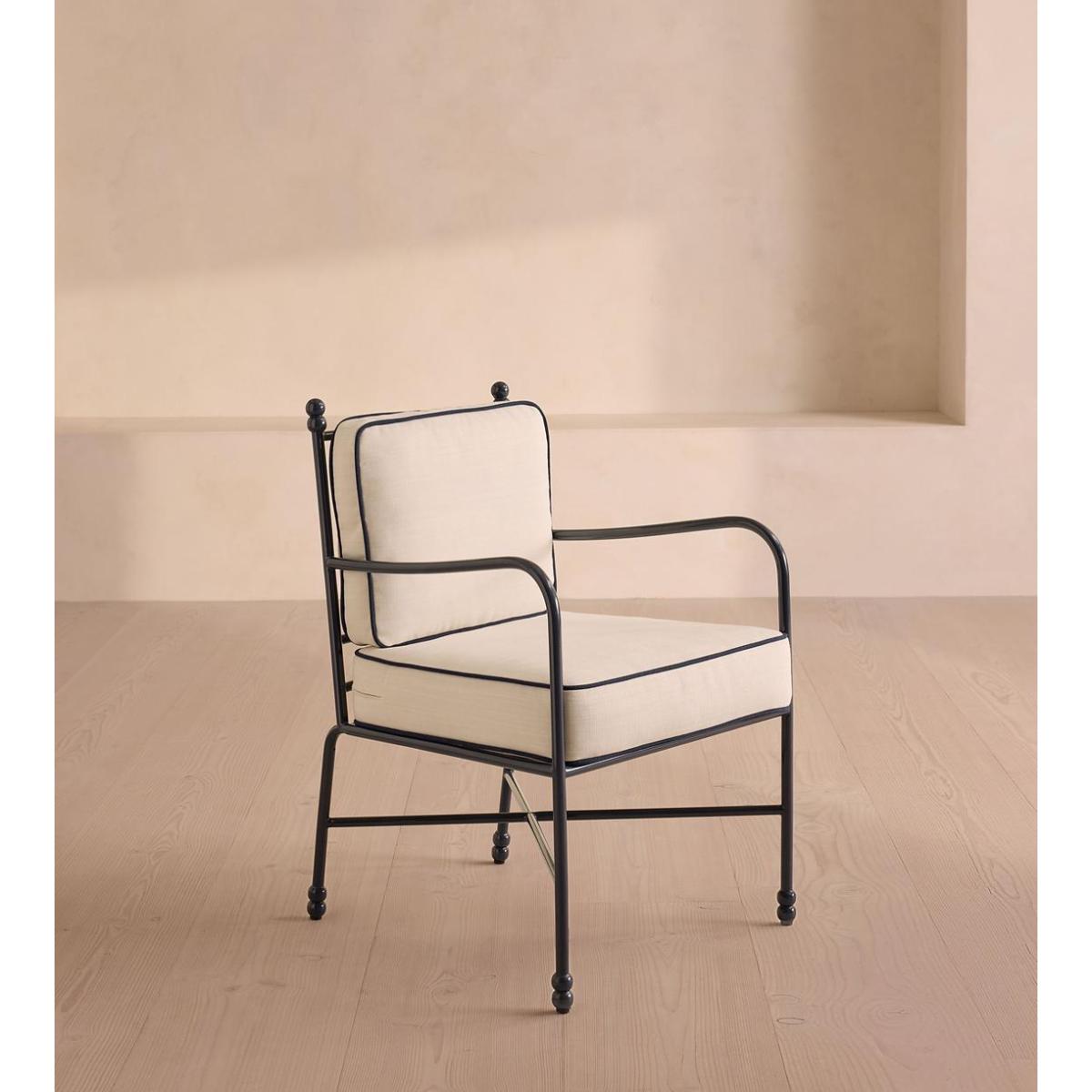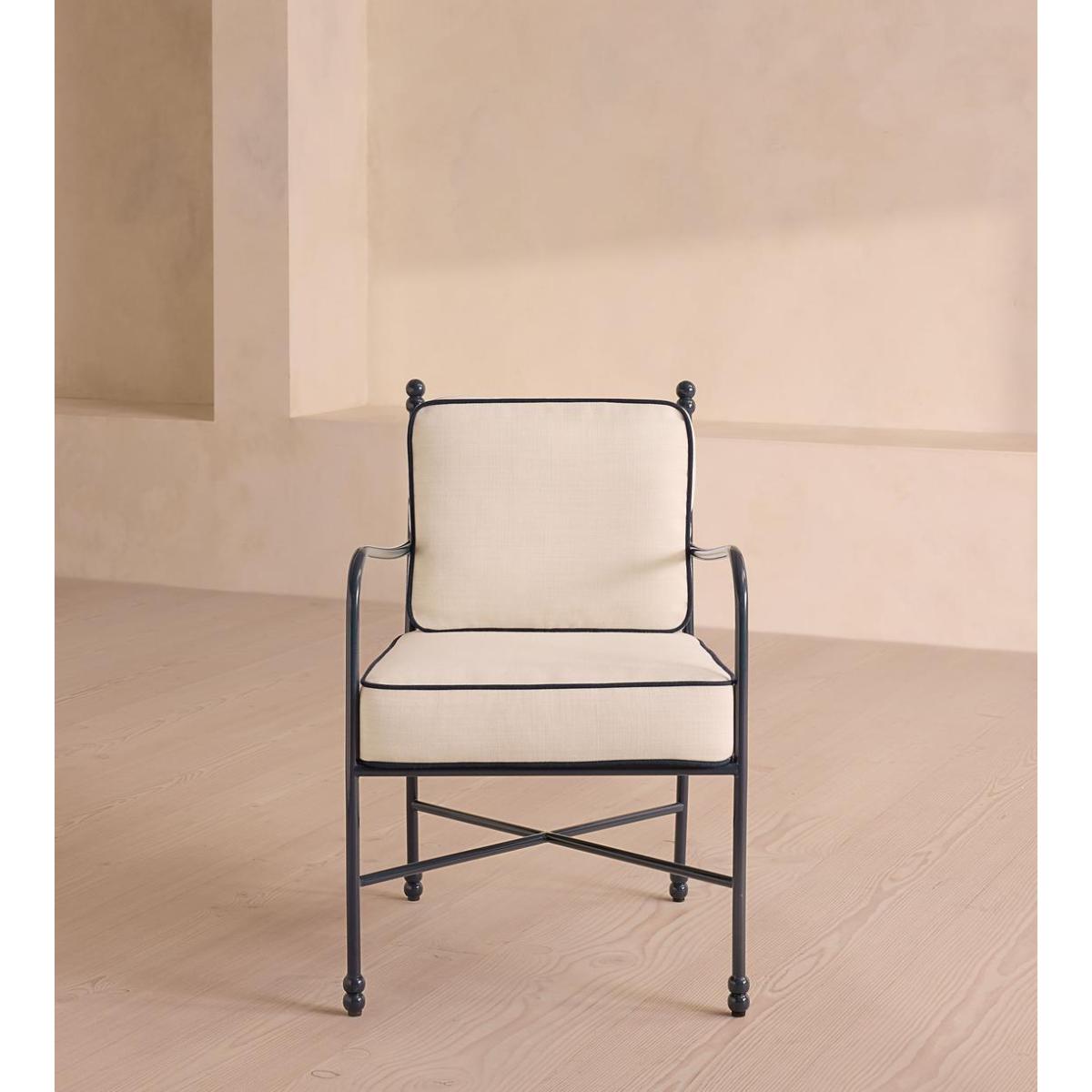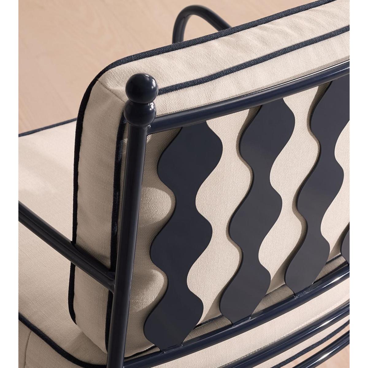 Stainless steel framework creates a distinctive wave-patterned backrest and curved arms that surround removable, upholstered cushions. Designed for outdoor use, the Fawn armchair is crafted from dark navy metalwork complemented by the piping that surrounds its off-white upholstery. Curved arms extend to form two of the chair's four legs, all of which are detailed with double ball feet at the base.