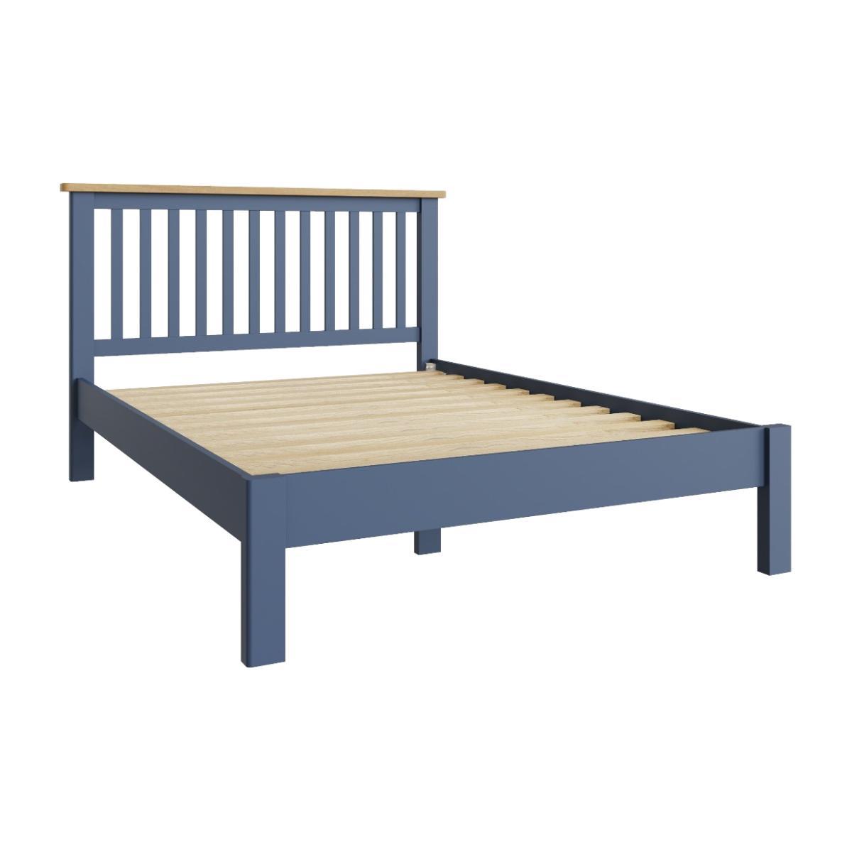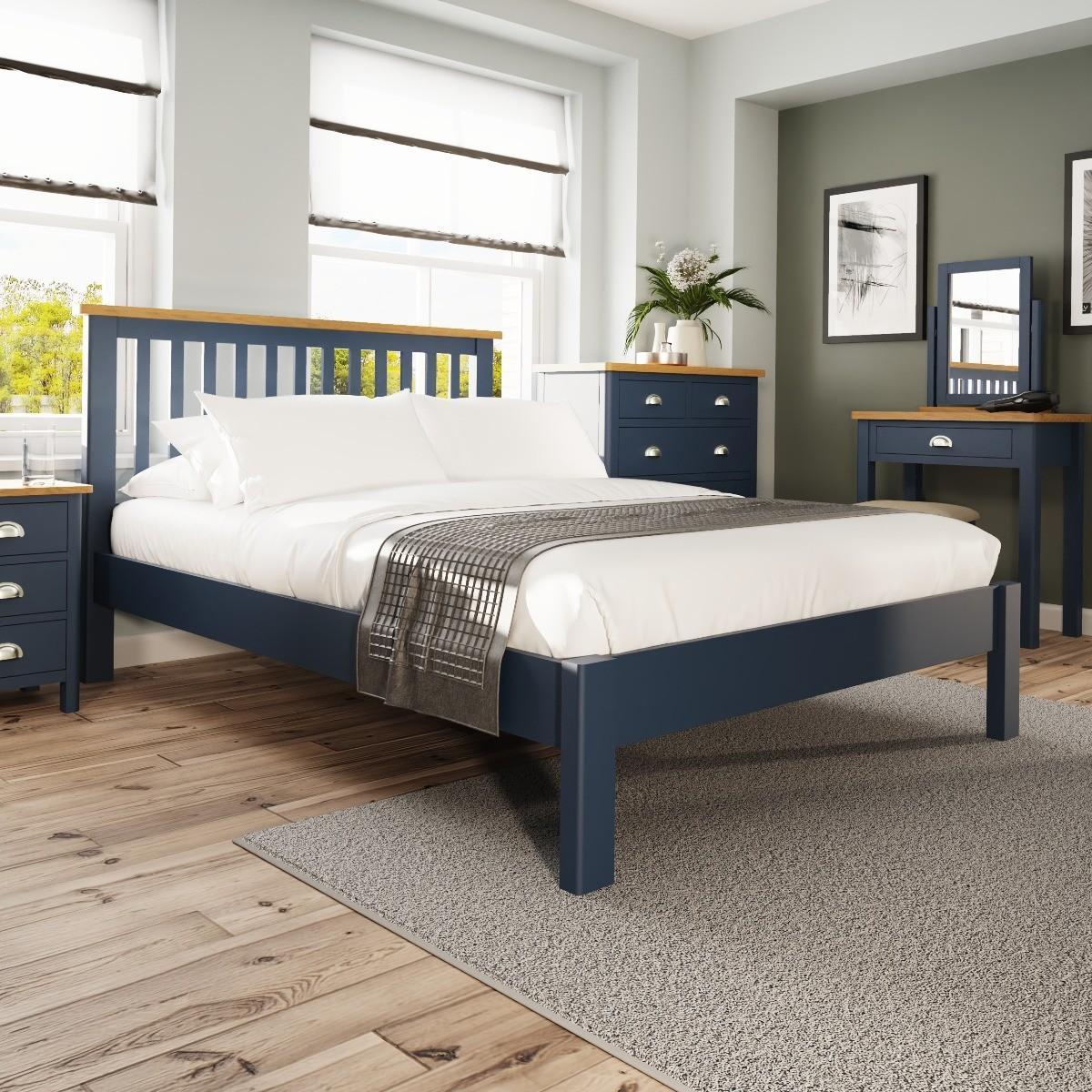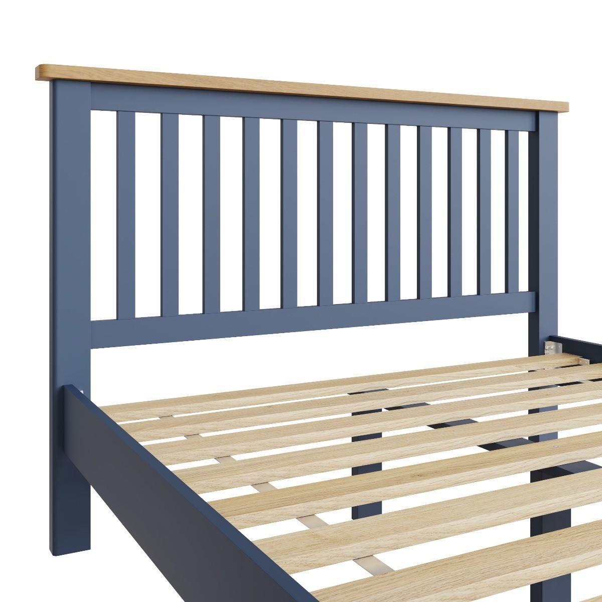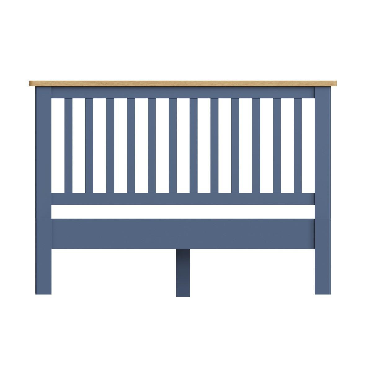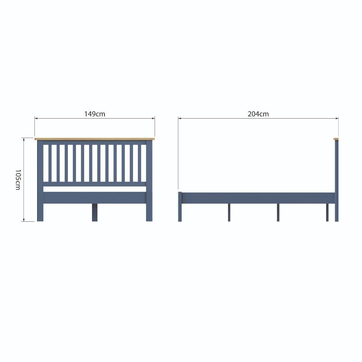 The Fay Oak and Blue Double Bed makes a stylish statement in any bedroom. This spacious double bed features a stunning two-toned blue painted and oak finish, with a classic slatted headboard. Stylish double bed with a durable frame. Blue painted finish for a unique look. Sturdy solid wood legs that provide firm stability and support. Classic wooden headboard with a traditional slatted design. Sturdy solid wood slats. Easy and quick to assemble. A model with a grey and medium oak finish also available. Single and King Size beds also available. Complete the look with more from this collection.