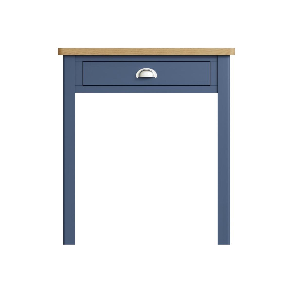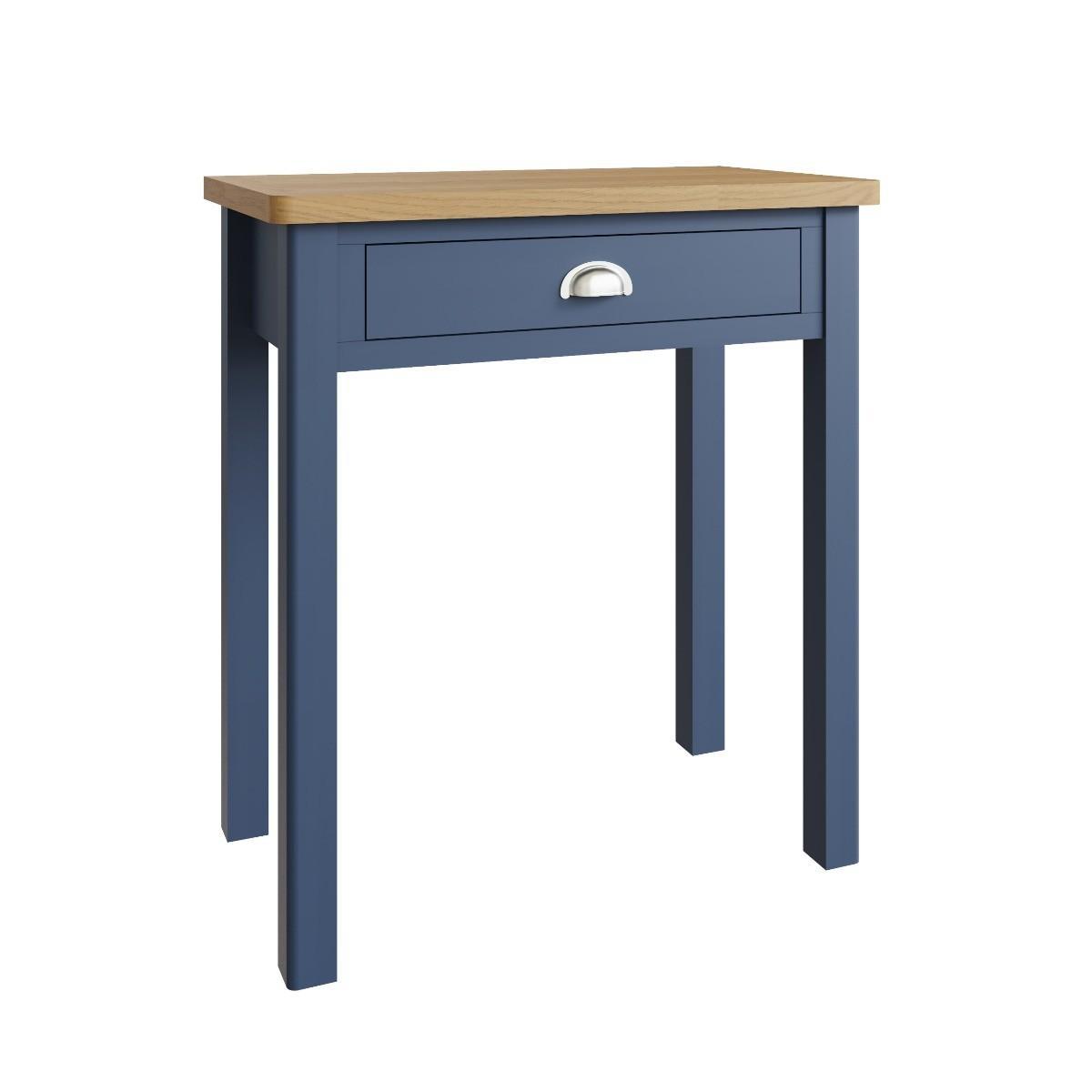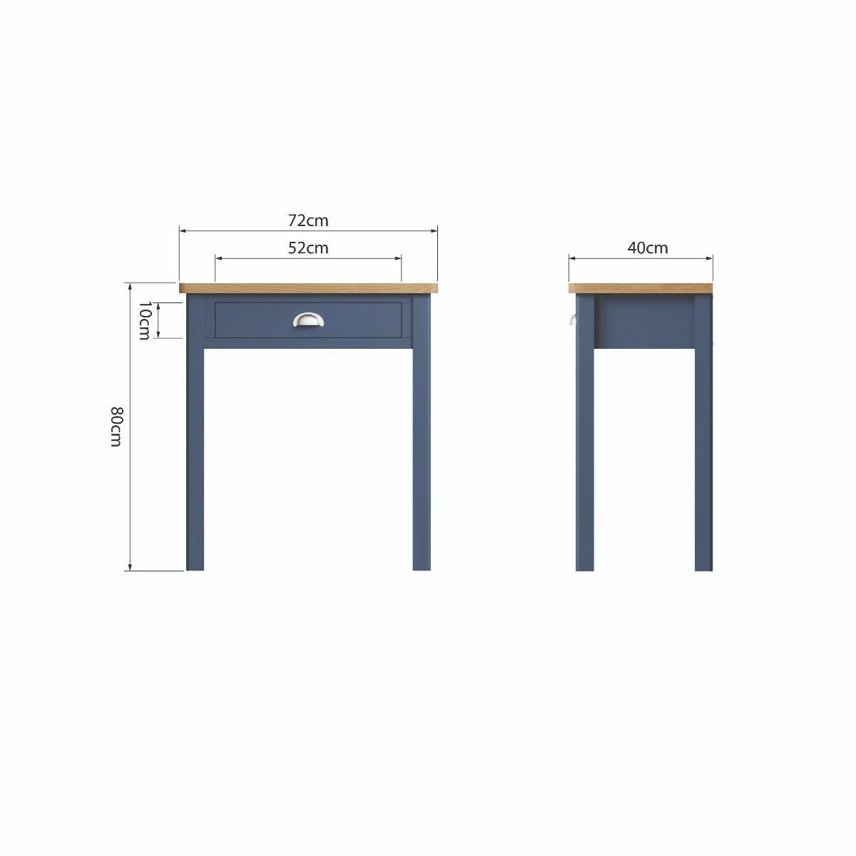 The Fay oak and blue dressing table is stylish and sturdy. Featuring a solid wood frame, the dressing table features a blue painted finish, with an oak top for a two-toned look. Stylish and sturdy dressing table. Two-tone blue and oak finish. Chunky solid oak tabletop with a radiant rustic oak finish and smooth rounded edges. Striking blue painted finish. Sturdy solid wood legs provide firm stability and support. Matching stool and trinket mirror available. A model with a painted grey and rustic oak finish also available. Look out for more items from this collection.
