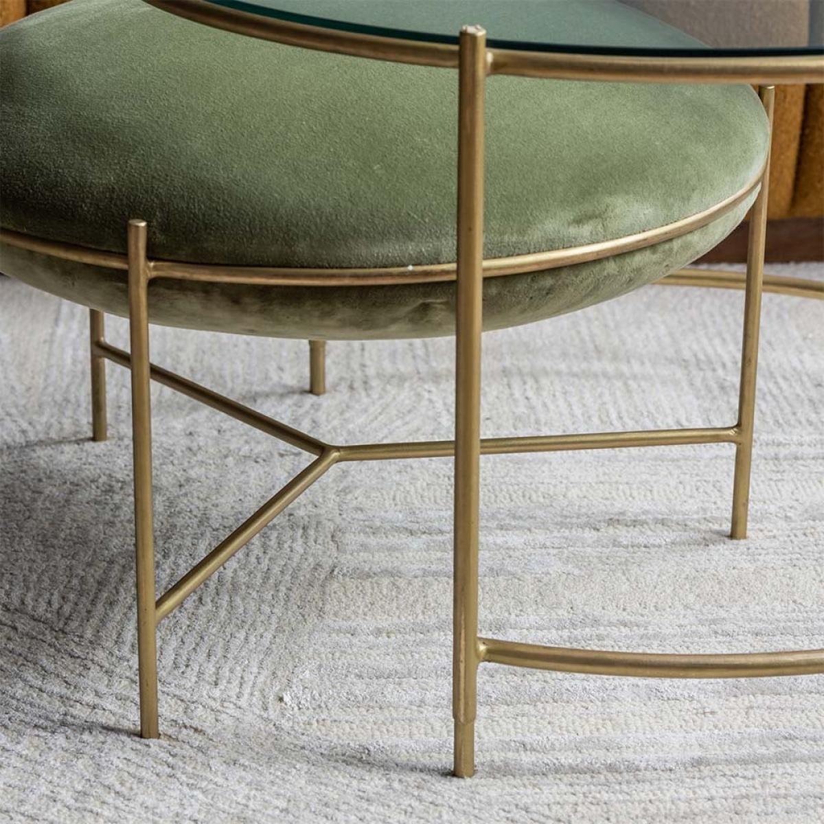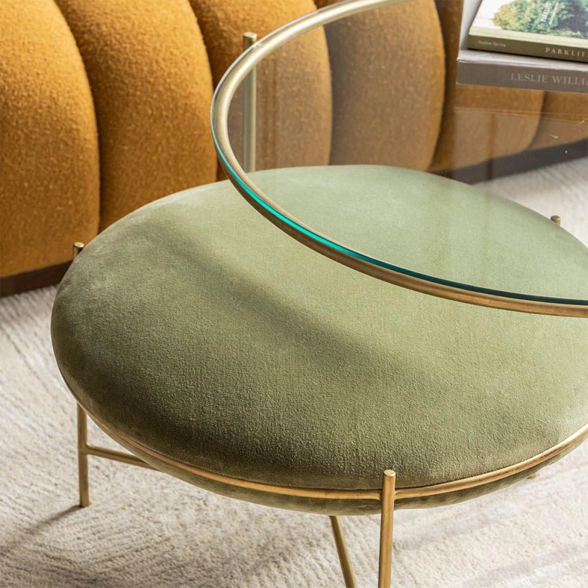 Faye is a glamorous metal and glass coffee table that comes with a stool upholstered in velvet to complete the look. Featuring a sturdy iron frame in a brass finish topped with a shimmering glass surface, it’s sure to make a stylish centrepiece in your living room, while the upholstered round footstool in olive-coloured cotton velvet is an irresistibly comfortable place to rest your feet. Simply pop the pouffe stool beneath the modern glass coffee table when not in use to save on valuable floorspace.