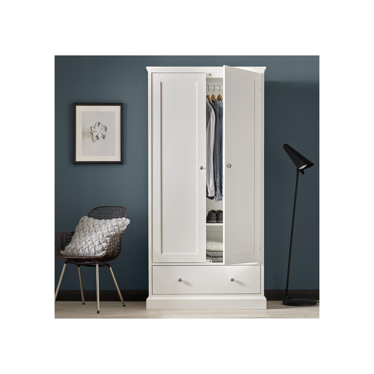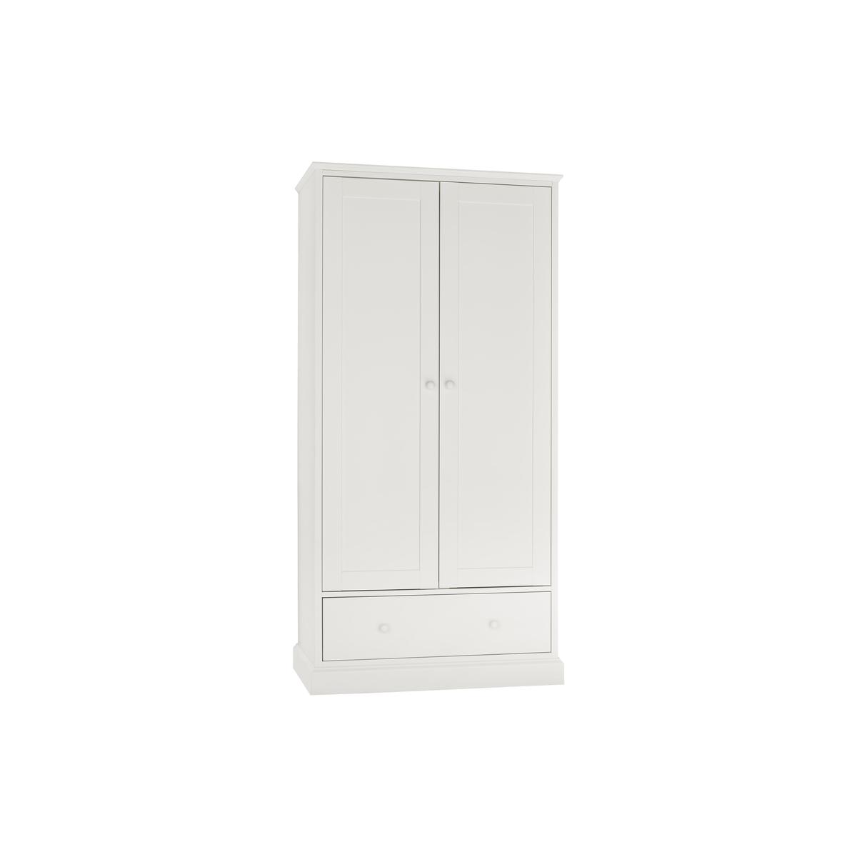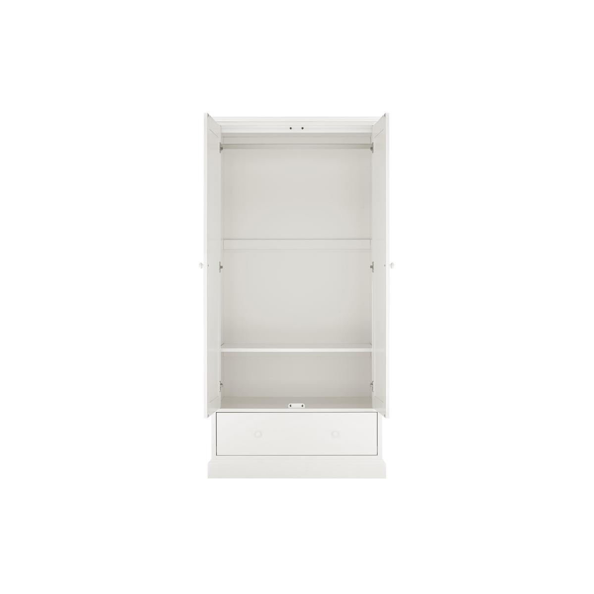 Fresh, clean and the perfect blend of classic and contemporary, the Faye bedroom collection is as practical as it is stylish – and all for a great value price. Each elegant piece is beautifully proportioned, while the compact design with plenty of storage suits smaller spaces. From the spacious triple wardrobe to the stylish bedframe with slatted headboard, this elegant bedroom furniture is finished in a crisply fresh, hard-wearing white coloured paint. Overhanging tops and pedestal bases are a timeless, classic touch yet there are convenient modern touches, such as the smooth Blum drawer runners. Both wooden and brushed stainless steel handles are provided on delivery, so you can try out both and decide which you prefer. The Faye double wardrobe is elegant, with a classic ‘gentleman’s wardrobe’ design. Yet thanks to its fresh, durable painted finish it has a contemporary feel and will suit a modern bedroom. Choose clean and crisp white or on trend cotton, a lovely light grey. This neatly sized wardrobe has an overhanging top, panelled doors and a pedestal base. Wooden and brushed stainless steel handles are provided on delivery, so you can try out both and decide which you prefer. Inside you’ll find one fixed double shelf and one fixed double hanging rail. Below there is a deep and spacious drawer. The Faye double or gentleman’s wardrobe is part of the great value Faye bedroom collection, and is a Furniture Village online exclusive. WARNING!. Furniture can tip over unexpectedly and cause injury. This item shall be fixed to a wall using the anti-tip kit provided with the furniture. Be sure to use the correct wall fixings suitable for the walls in your home.