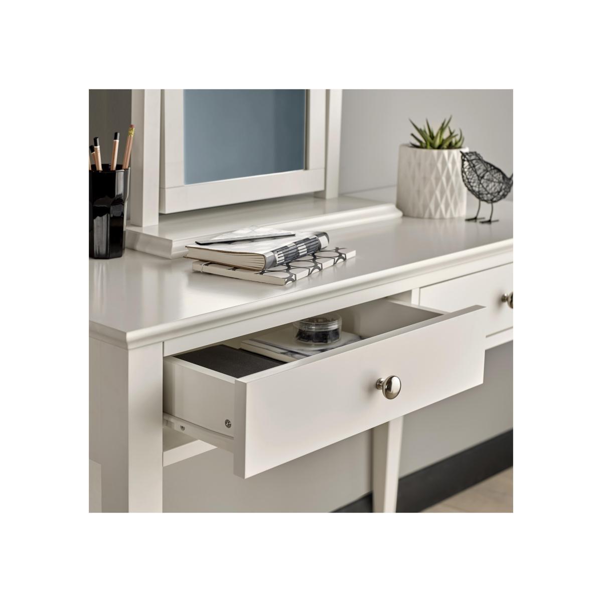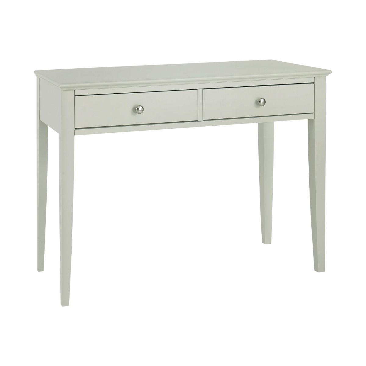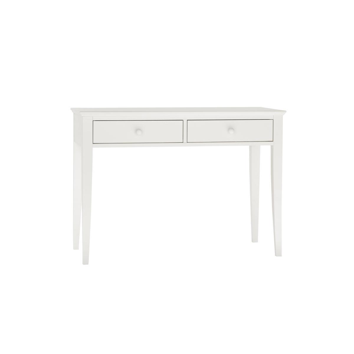 The Faye dressing table has a simple, classic design with an overhanging top, two drawers and subtly tapered legs. The fresh, durable painted finish available in crisp white and cotton, a light grey gives it a contemporary feel, so it suits both traditional and modern bedrooms. You could even use this versatile table elsewhere in your home, as a console table or desk. The two drawers have self- close drawer runners. Wooden and brushed stainless steel drawer handles are provided on delivery, so you can try out both and decide which you prefer. This neatly sized dressing table is perfect paired with the Faye dressing table stool and vanity mirror. The Faye dressing table is part of the great value, beautifully elegant Faye bedroom collection, and is a Furniture Village online exclusive.