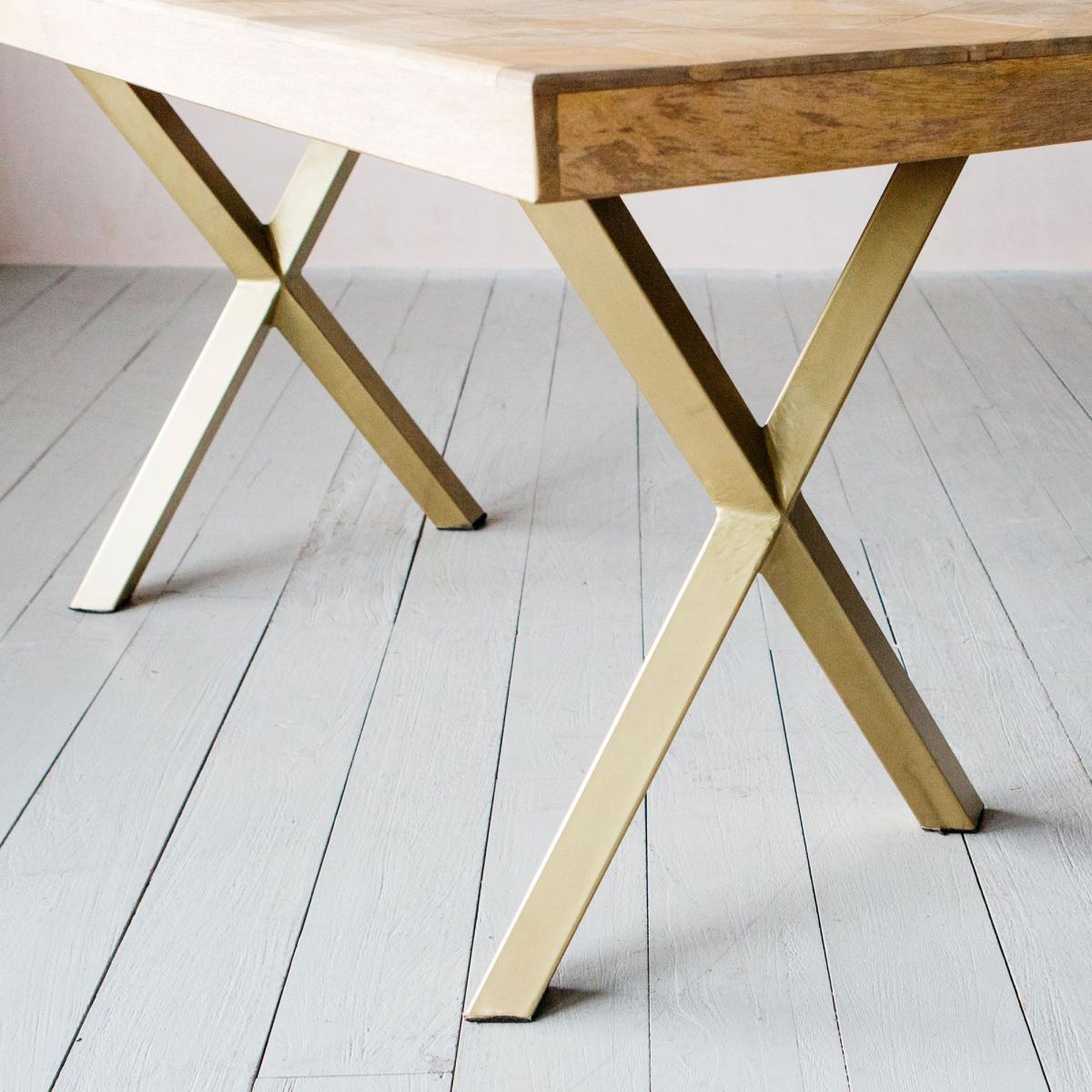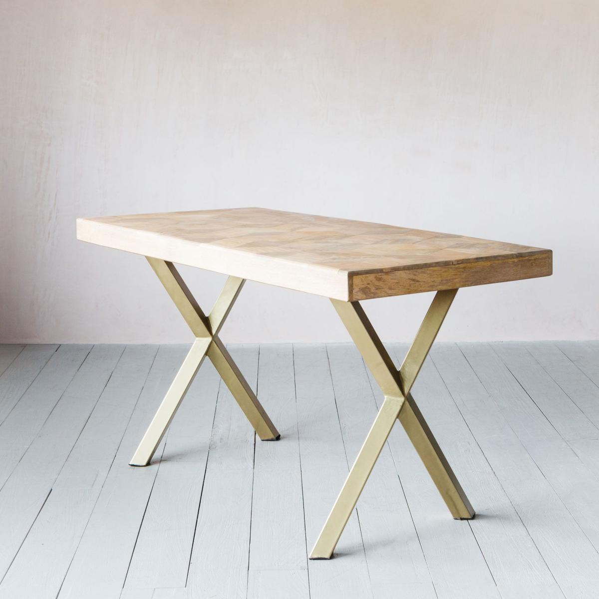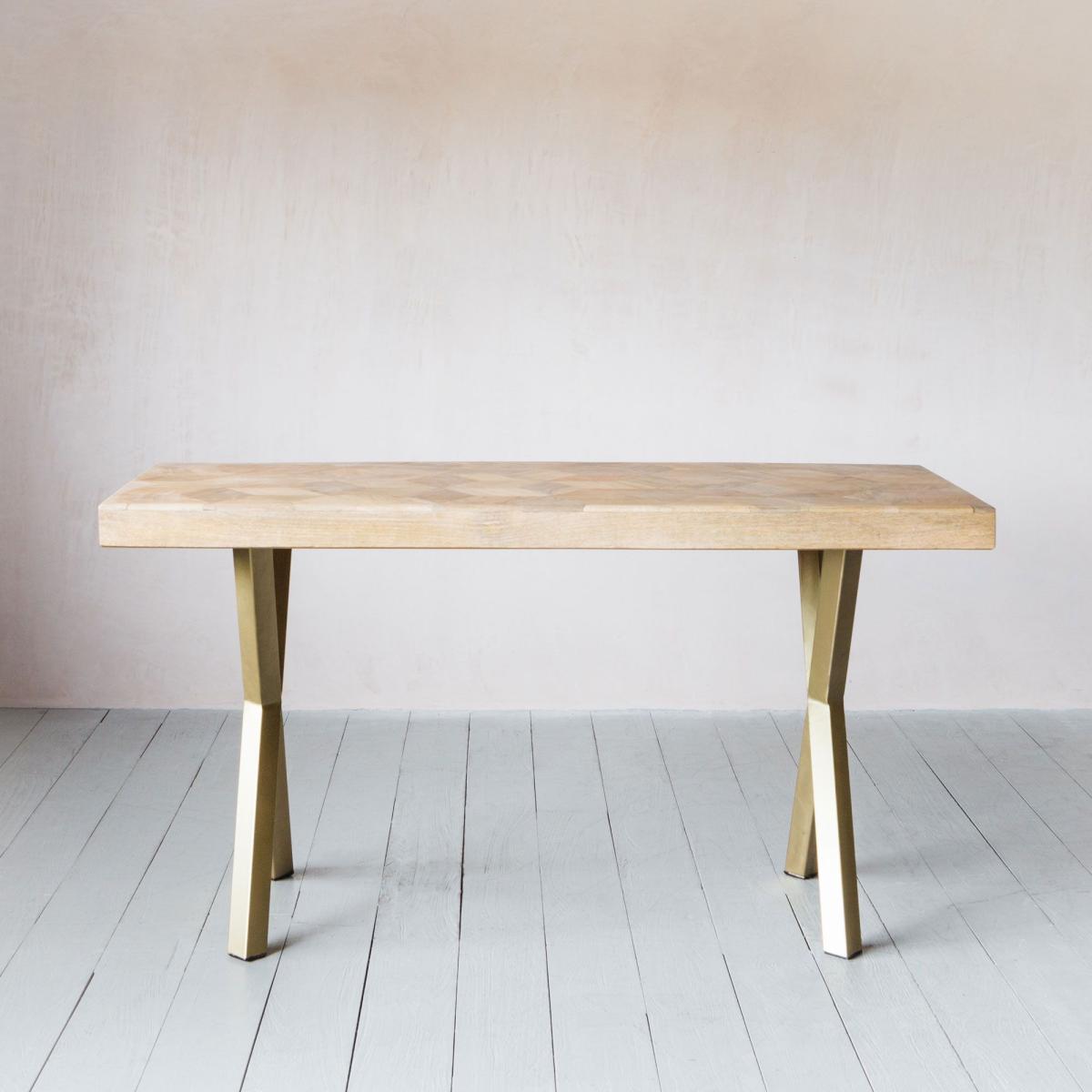 A modern take on a classic design, this substantial desk features a smooth and natural parquetry top. Complete with contrasting lacquered brass-plated legs for added elegance.