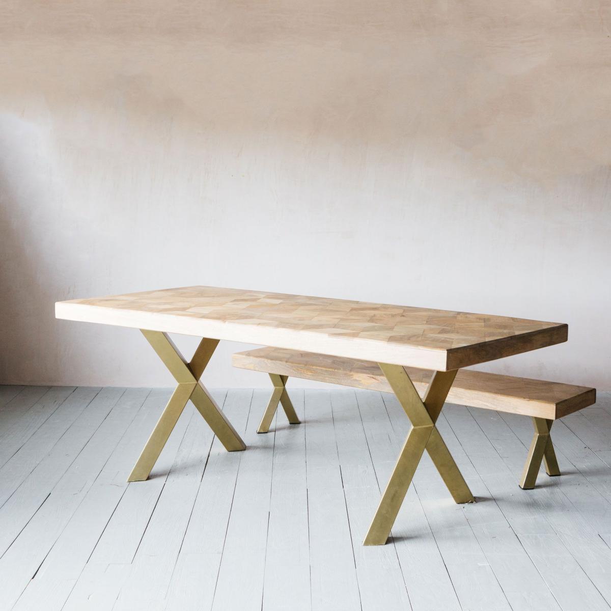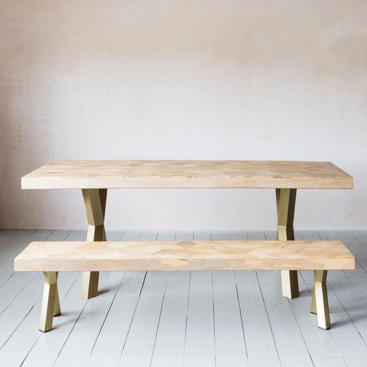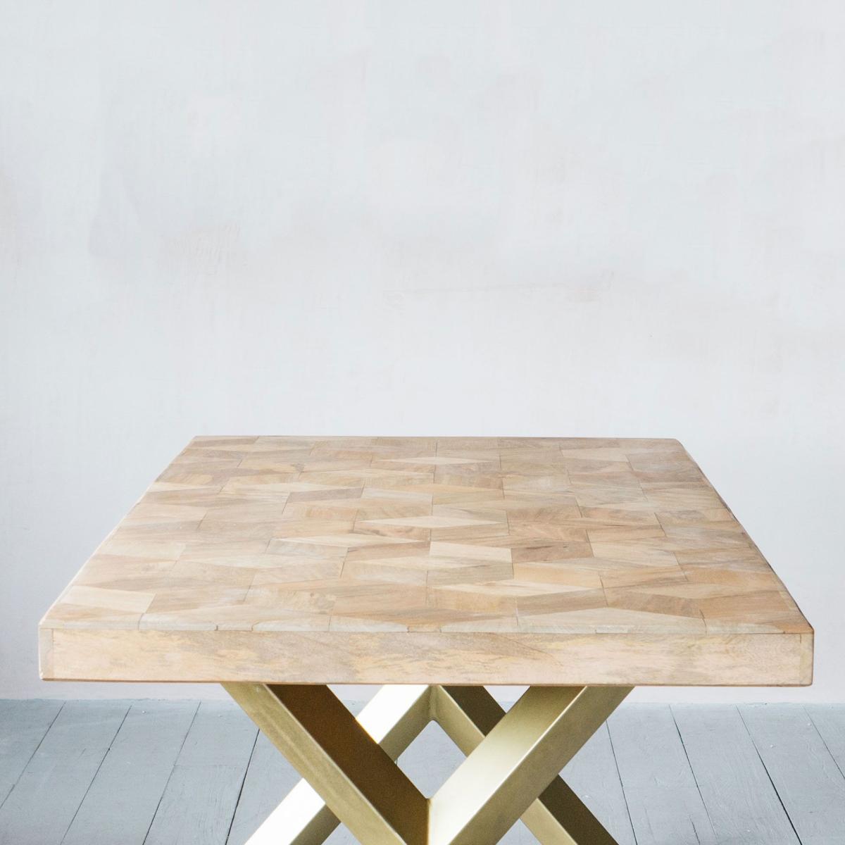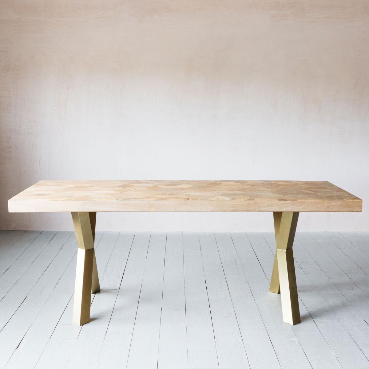 A perfectly formed Parquetry table with a geometric top and bold lacquered brass-plated legs with an angular shape. Designed to be centre stage and surrounded by friends and family.