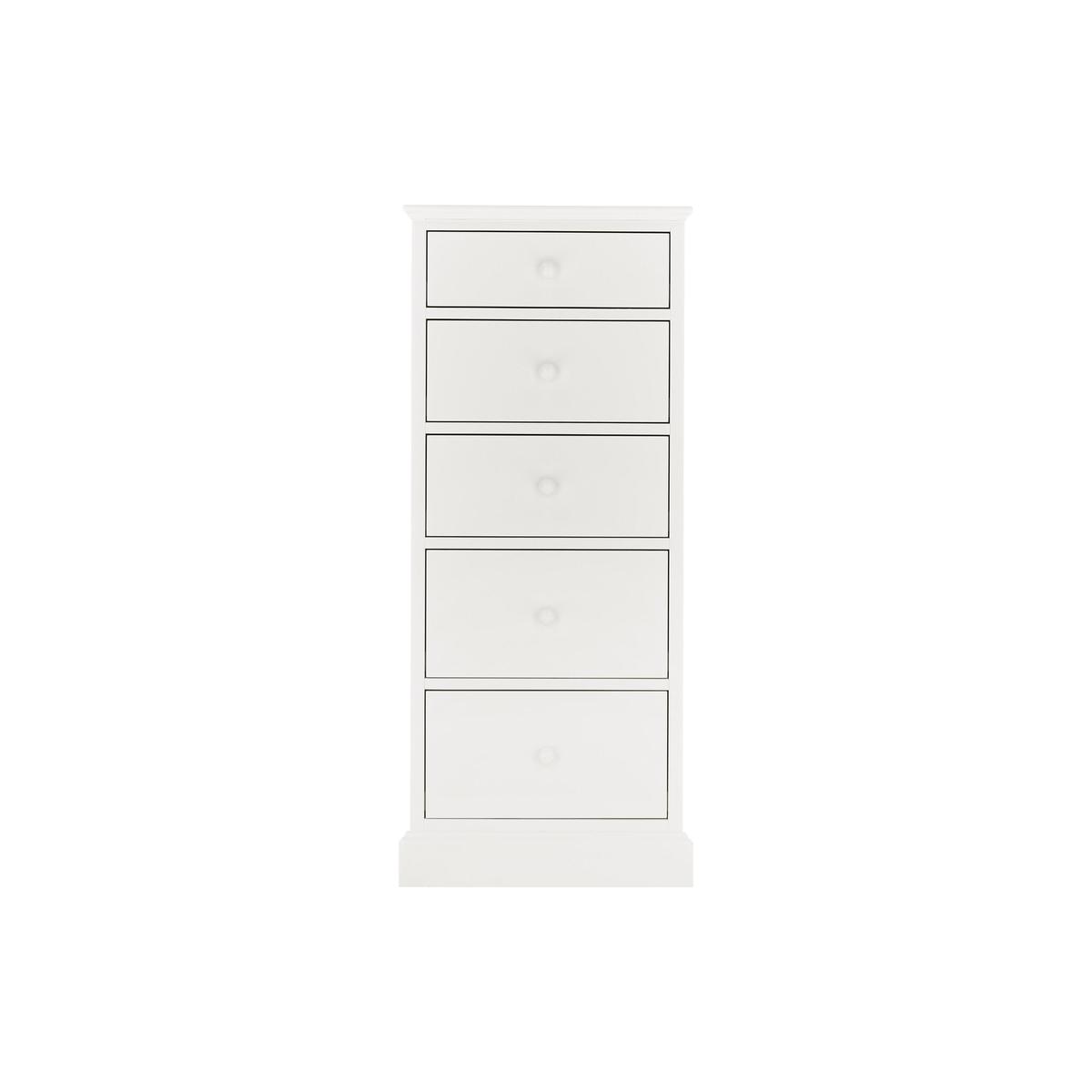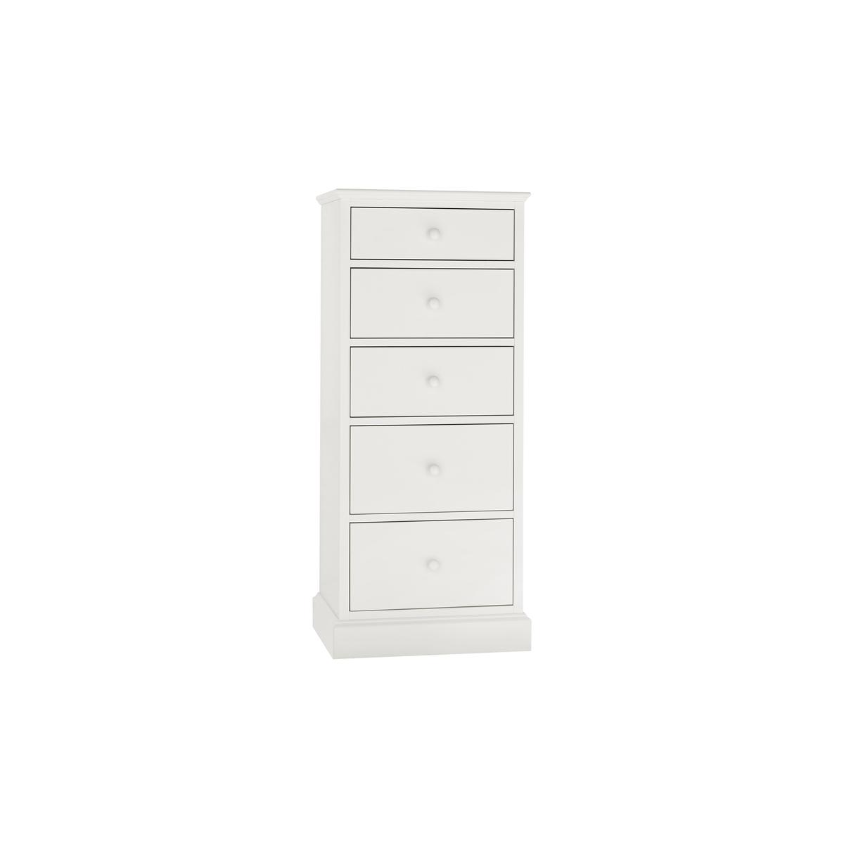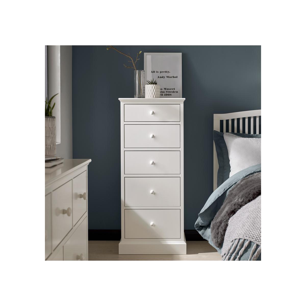 Fresh, clean and the perfect blend of classic and contemporary, the Faye bedroom collection is as practical as it is stylish – and all for a great value price. Each elegant piece is beautifully proportioned, while the compact design with plenty of storage suits smaller spaces. From the spacious triple wardrobe to the stylish bedframe with slatted headboard, this elegant bedroom furniture is finished in a crisply fresh, hard-wearing white coloured paint. Overhanging tops and pedestal bases are a timeless, classic touch yet there are convenient modern touches, such as the smooth Blum drawer runners. Both wooden and brushed stainless steel handles are provided on delivery, so you can try out both and decide which you prefer. Perfectly proportioned to suit narrower spaces, the Faye tall five drawer chest combines classic style with a fresh, contemporary feel – thanks to its durable painted finish in your choice of crisp white or cotton, a stylish light grey. It has five drawers, gradually increasing in depth from a shallow top drawer to a deep, roomy lower drawer. Lovely features include clean lines, an overhanging top and a neat pedestal base. The smooth, soft close Blum drawer runners are a luxurious finishing touch. Wooden and brushed stainless steel handles are provided on delivery, so you can try out both and decide which you prefer. The Faye tall five drawer chest is part of the elegant, great value Faye bedroom collection, and is a Furniture Village online exclusive. WARNING!. Furniture can tip over unexpectedly and cause injury. This item shall be fixed to a wall using the anti-tip kit provided with the furniture. Be sure to use the correct wall fixings suitable for the walls in your home.
