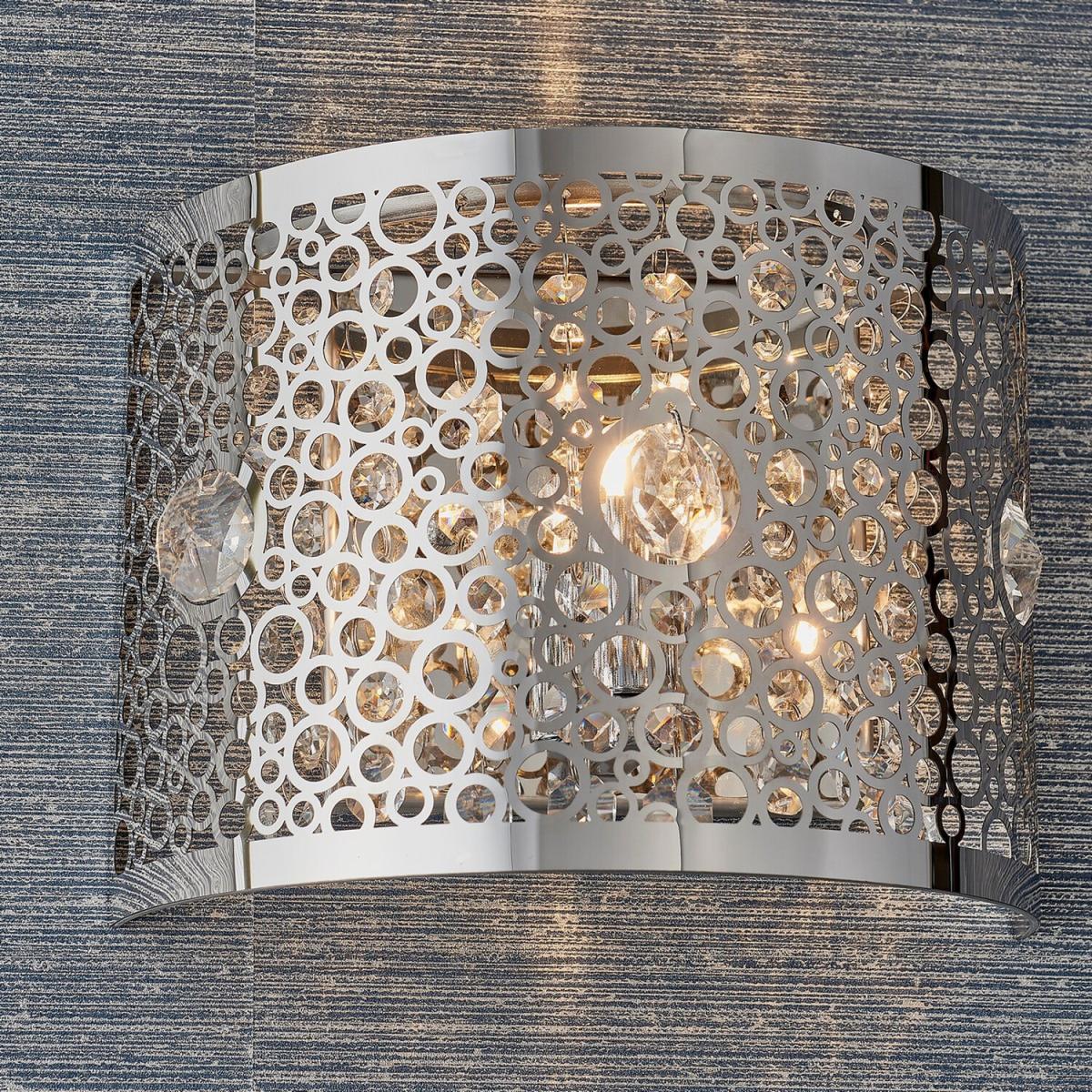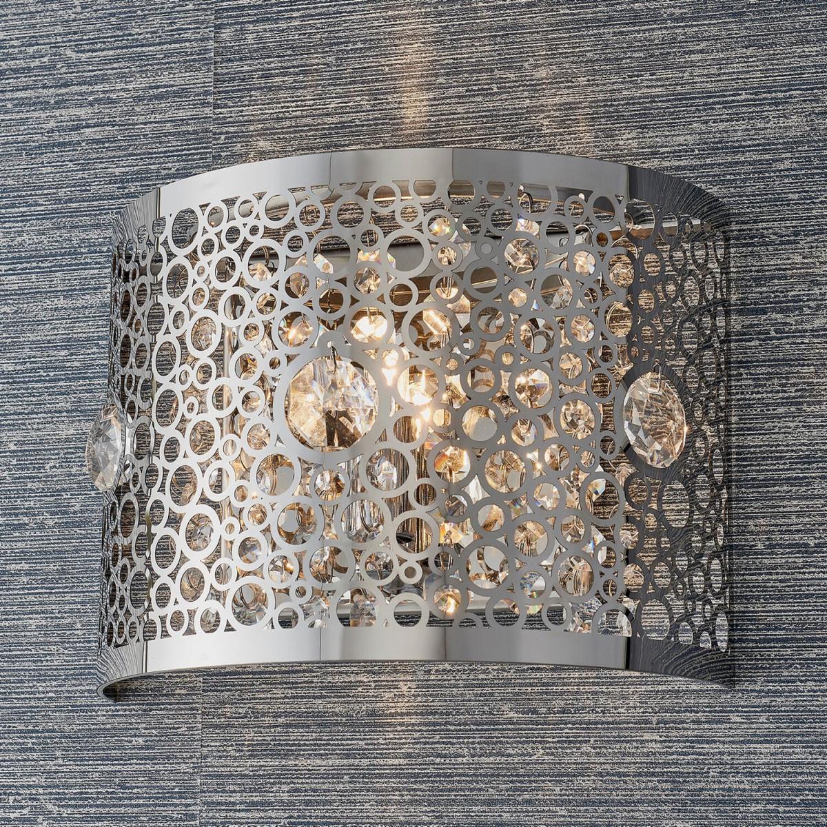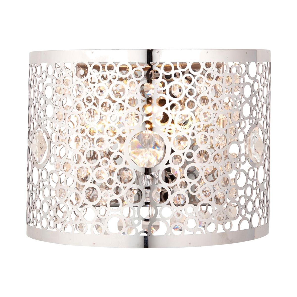 This stunning fitting is a modern and striking wall light with laser cut shade and premium crystal bejewelled detailing.