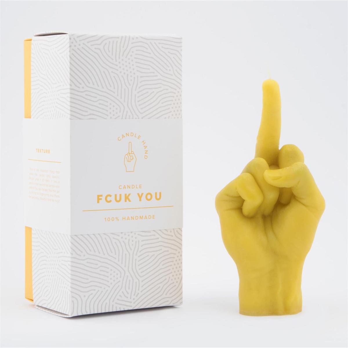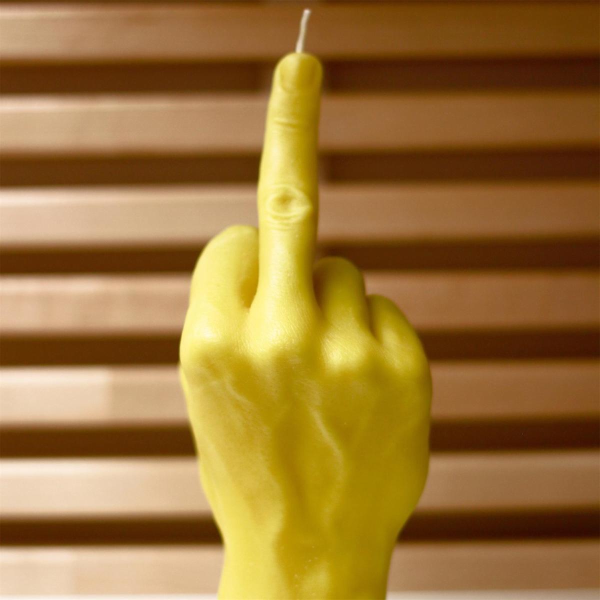 The 'FCUK you candle' is a bold, tongue-in-cheek piece that works well as a statement accessory in modern, eclectic, or minimal interiors where humour and personality are key. Its bright yellow colour adds a pop of vibrant colour, making it suitable for contemporary spaces, playful home offices, or as an eye-catching accent on mantelpieces or side tables. Practical styling tips include pairing it with sleek, neutral surroundings to let it stand out or grouping it with other quirky decor for added impact. Keep it on a tidy surface with other unexpected objects or as a standalone piece under a glass cloche-this will enhance its fun, rebellious vibe without overwhelming the space.