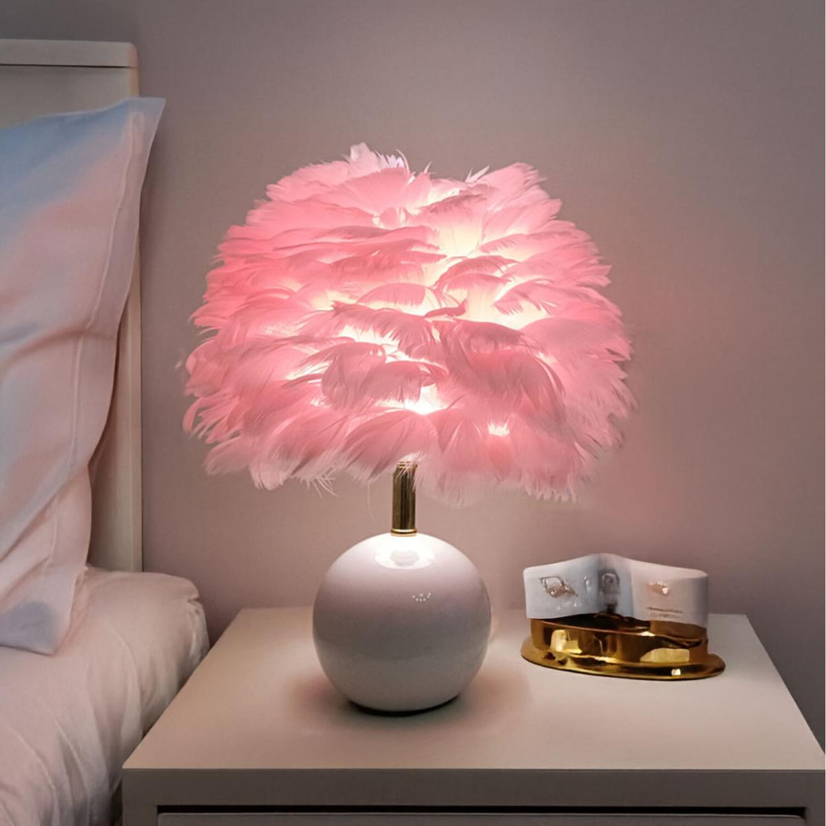 This elegant table lamp combines functional lighting with a soothing atmosphere. Featuring a soft feather lampshade made from goose feathers, it casts a romantic, soft glow at night, creating a warm, relaxing environment. During the day, the lamp serves as a stunning decorative piece, adding artistic charm to any space. The ceramic base provides stability, while the warm light enhances the coziness of your bedroom, making it perfect for relaxation, reading, or creating a peaceful sleep environment. With its comfortable and romantic style, this table lamp is a beautiful addition to any home, offering both style and functionality.