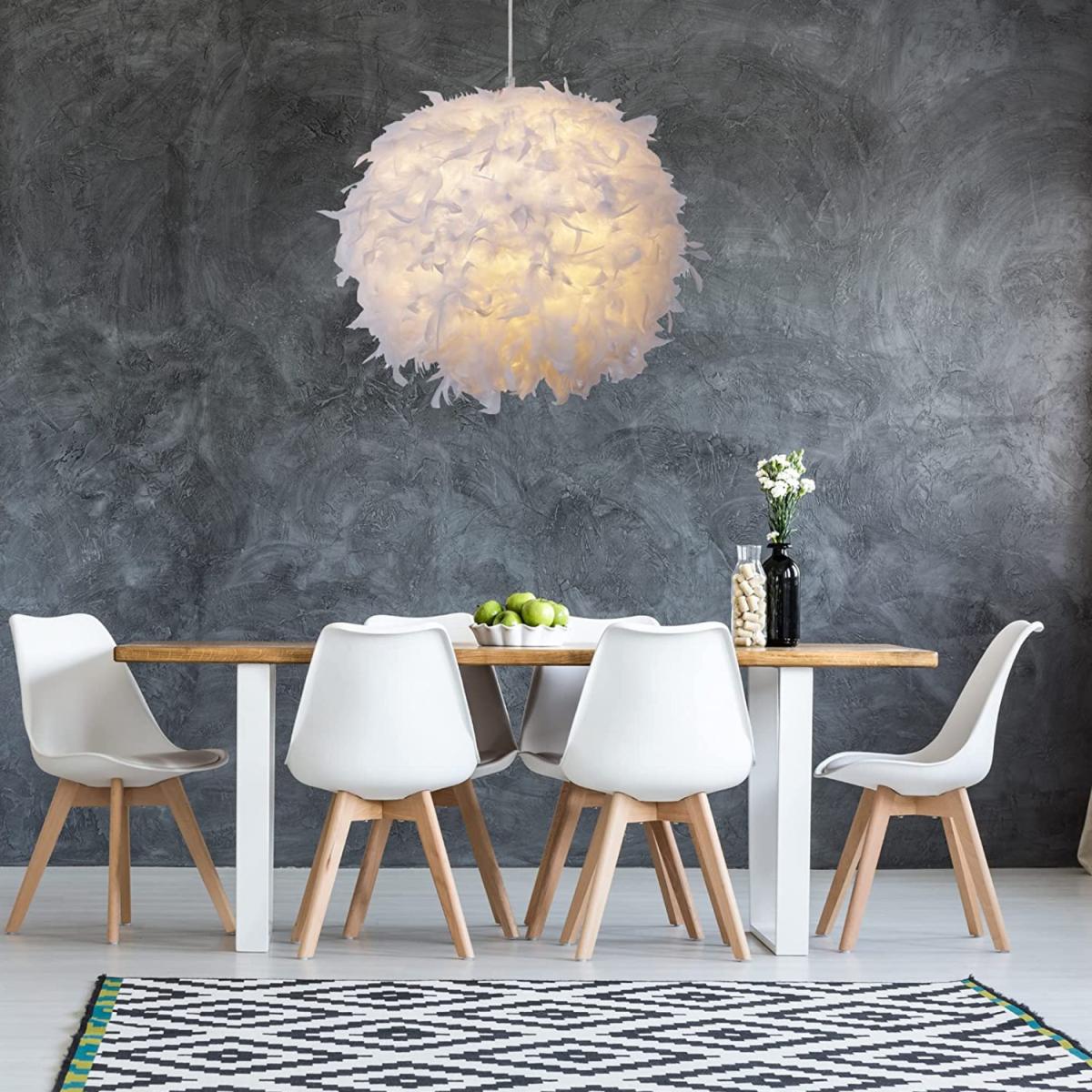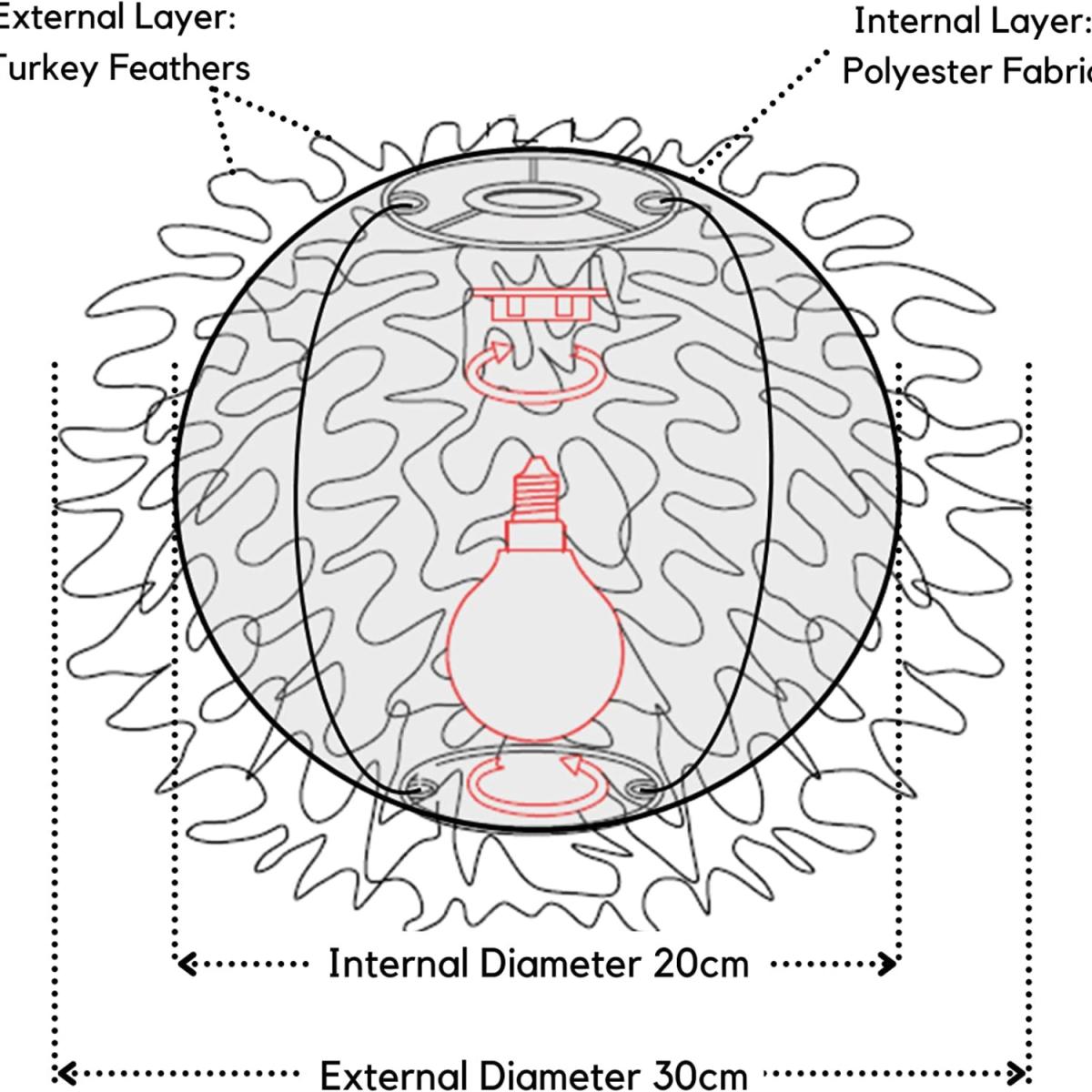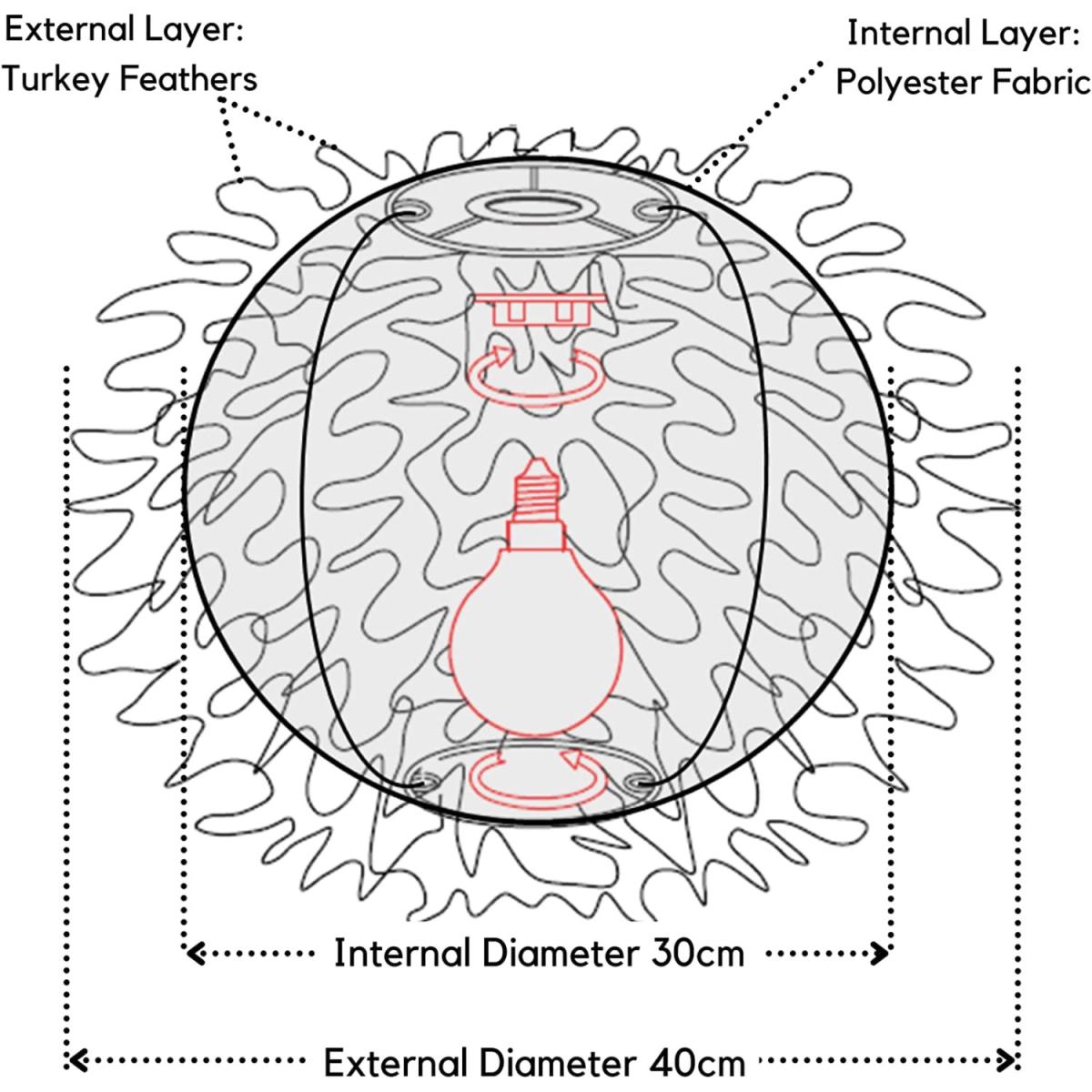 Giggi's modern Feather Light/Lamp shade is manufactured with real turkey feathers. Our finest artisans have hand-woven plenty of these premium feathers onto polyester fabric giving a fuller and patch-free fluffy look. In the presence of light, this lampshade produces a stunning soft diffused glow and creates a magical focal point in your room. The fluffy light shade can be hung onto an existing light fitting, while Its unique design allows options for up and down lighting. These ceiling lampshades will add elegance and style to your Living Room, Kitchen, Bedroom, Hallway, Lounge, Office etc. This is Lampshade Only, Light Fitting & Bulbs are NOT included. Bulbs Compatibility: LED, Energy Saver or Smart bulbs with Maximum Bulb Width of 5.5cm and max power rating of 40. W. Gigg's Ceiling Light Shades / Light Shade Ceiling is designed in Britain & handcrafted in the lighting district of China (Zhongshan). If the product doesn't live up to your expectations, don't hesitate to get in touch with us for an immediate resolution. Buy with confidence as the ceiling lampshade comes with a 30-day money-back guarantee & 3-month structural warranty.