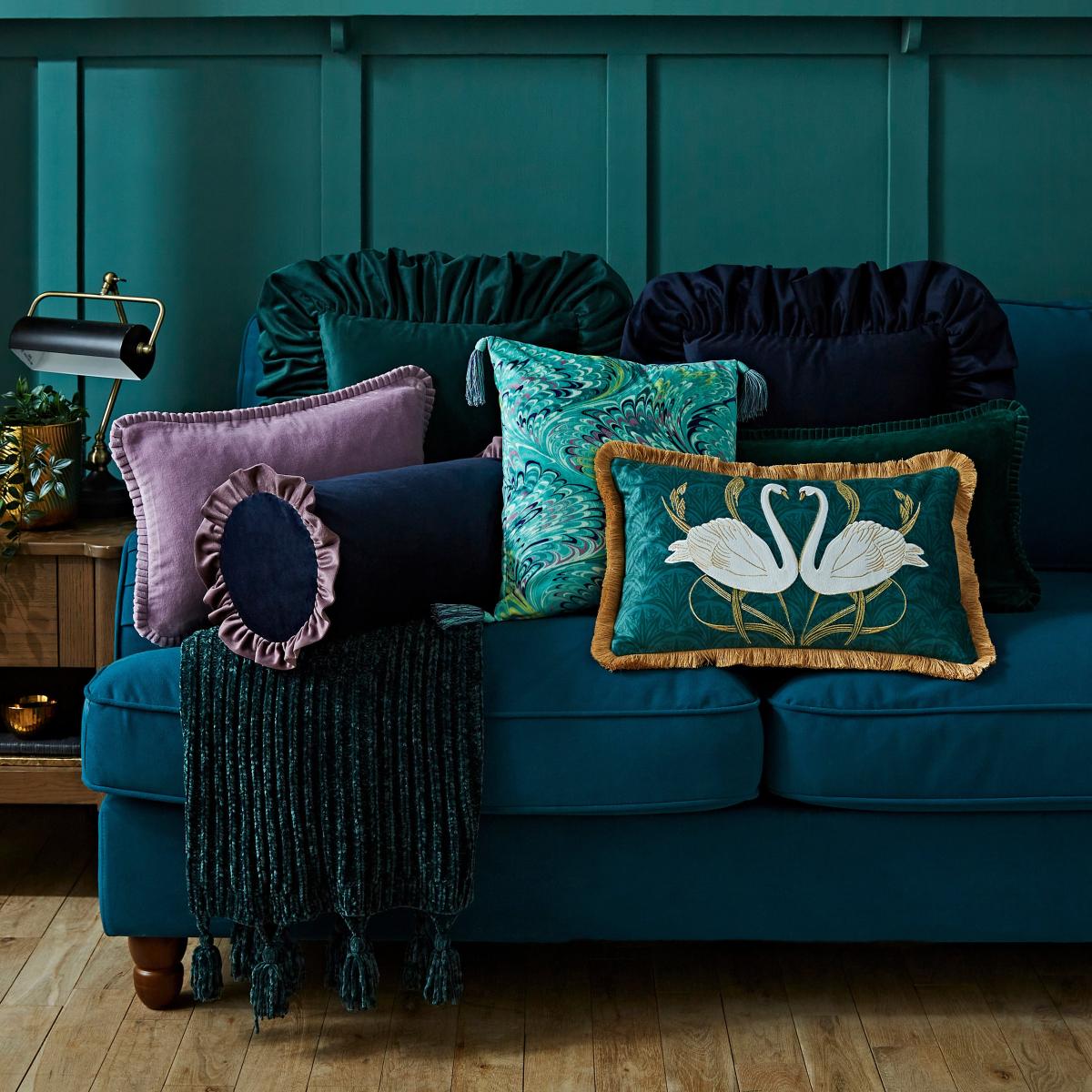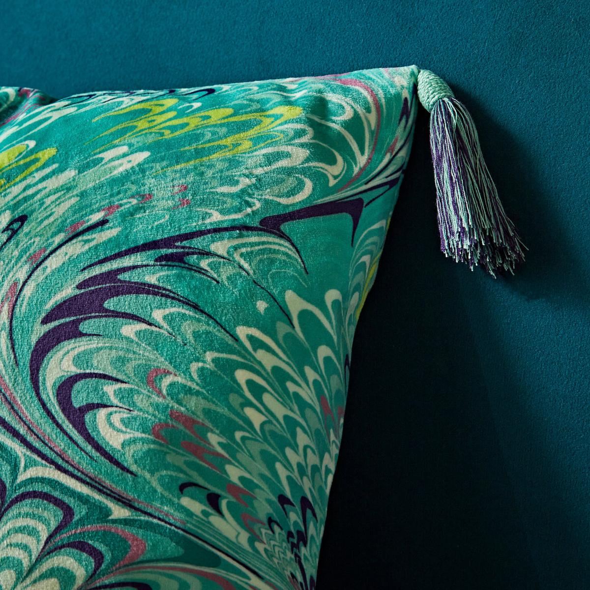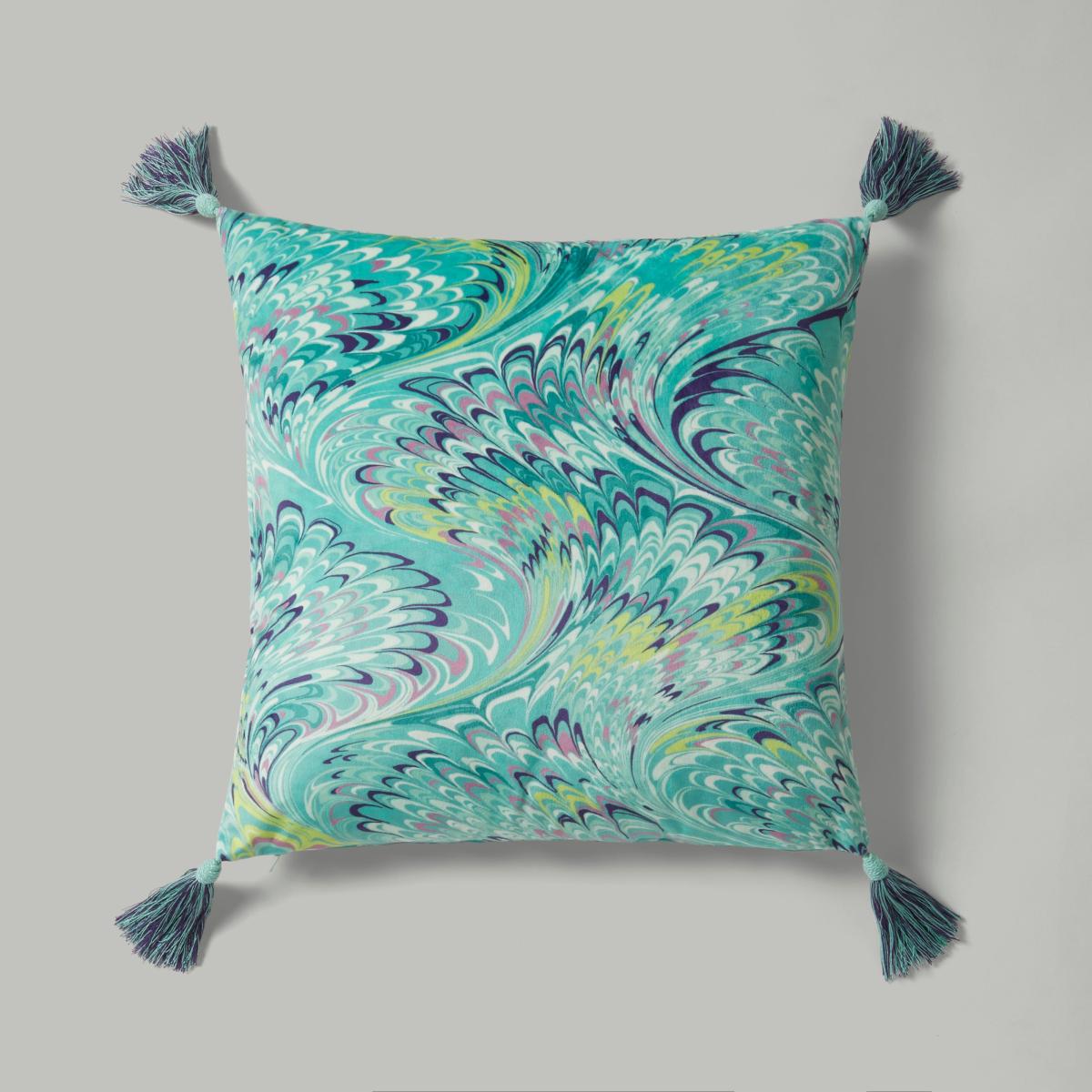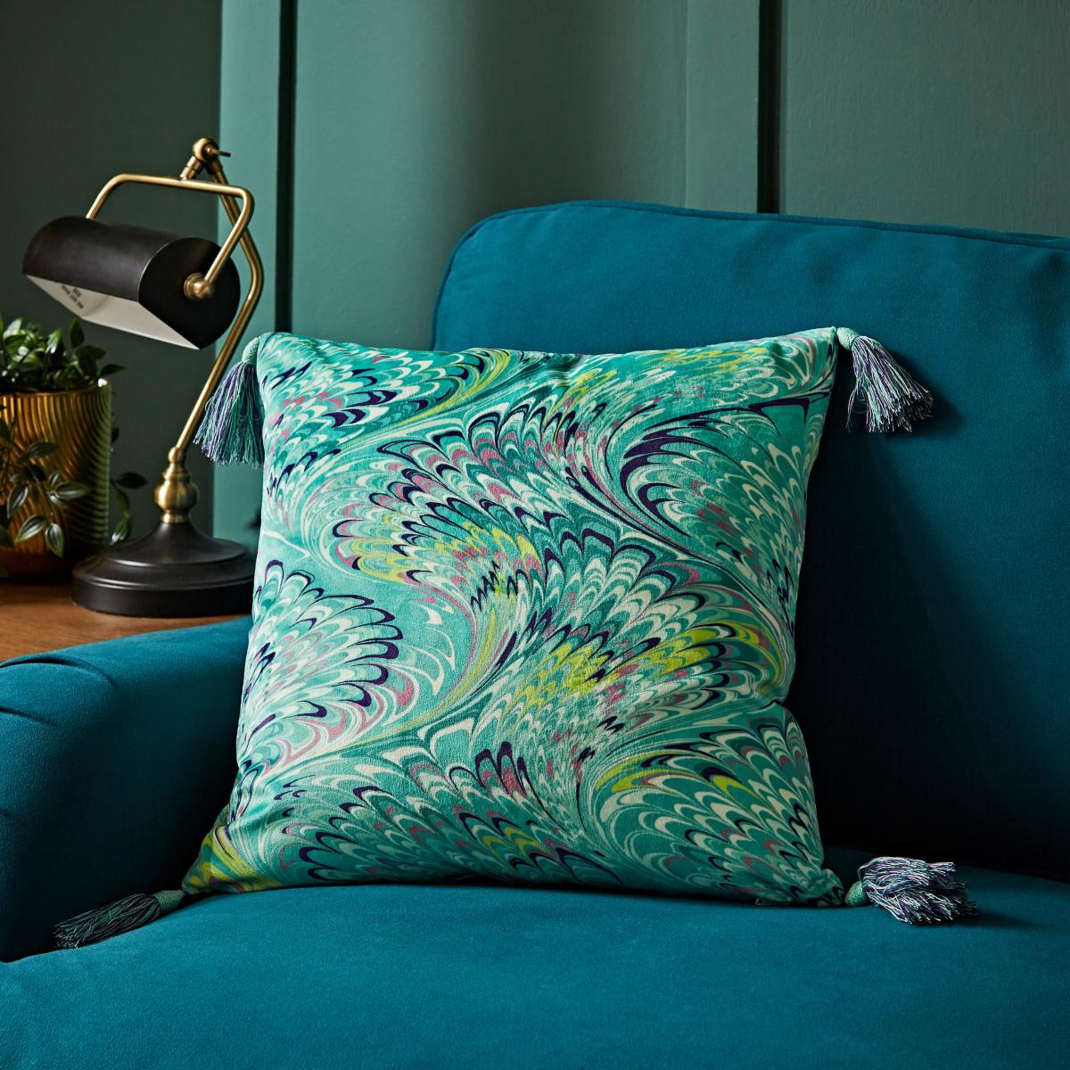 * Zip closure* Tassel detail* Luxury feather fill* Machine washable Indulge in luxury with the Feather Marble Cushion, made from sumptuous recycled velour and adorned with elegant tassel details. Complete with a zip closure and luxury feather fill, this cushion is as practical as it is beautiful. Machine washable for easy care, it’s the perfect blend of opulence and comfort.