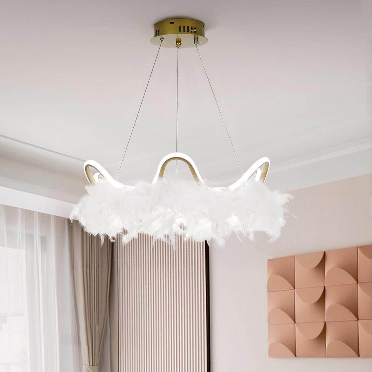 This LED feather chandelier features a unique and elegant design, combining gold and white colors for a pure aesthetic. Its cloud-like shape, adorned with a curved LED light strip that resembles a crown, creates a stunning focal point in any room. Supported by three sturdy metal wires, it ensures stability while exuding grace. The chandelier emits a gentle, eye-friendly light, bathing your space in a soft, dreamy ambiance that evokes the feeling of wandering through a magical wonderland. This striking piece not only enhances your decor but also transforms the atmosphere of your home.