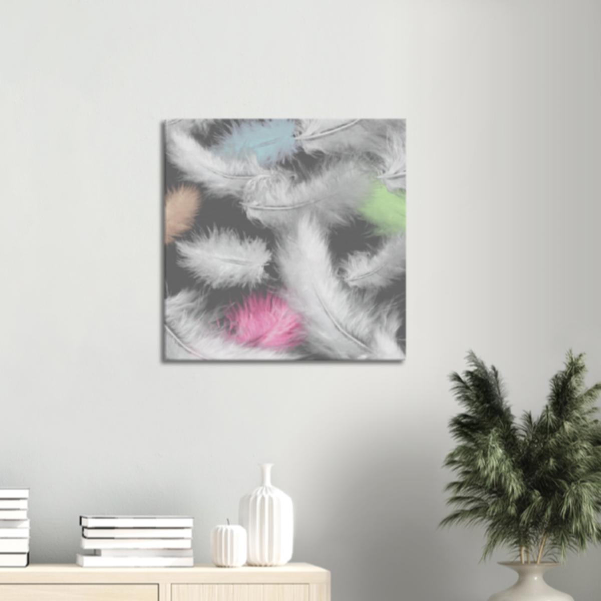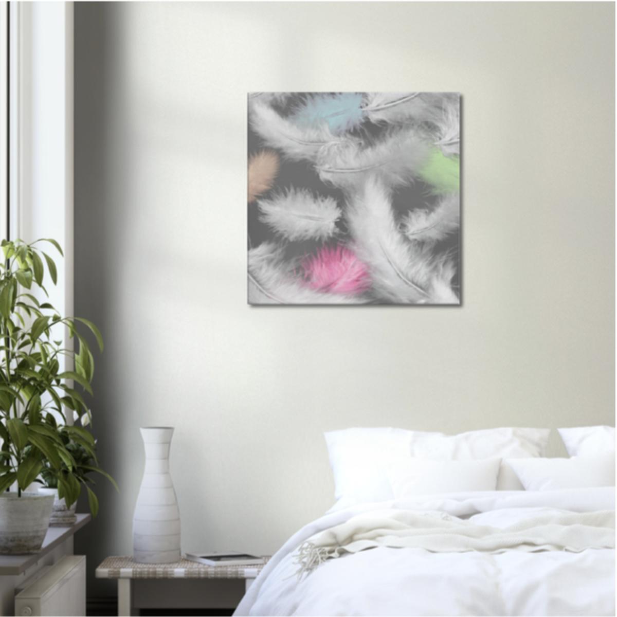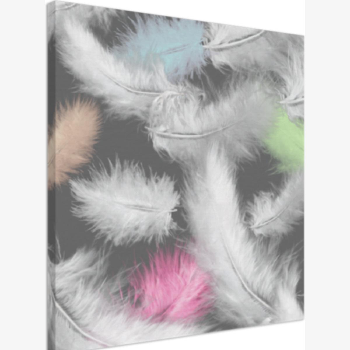 A stunning large square canvas print with a contemporary design. Perfect for any room particularly in a bedroom. Grey background is natural and this means it fits into almost any current colour. Feather print embodies a feel of comfort and softness in this relaxing enjoyable canvas. 60cms x 60cms Size