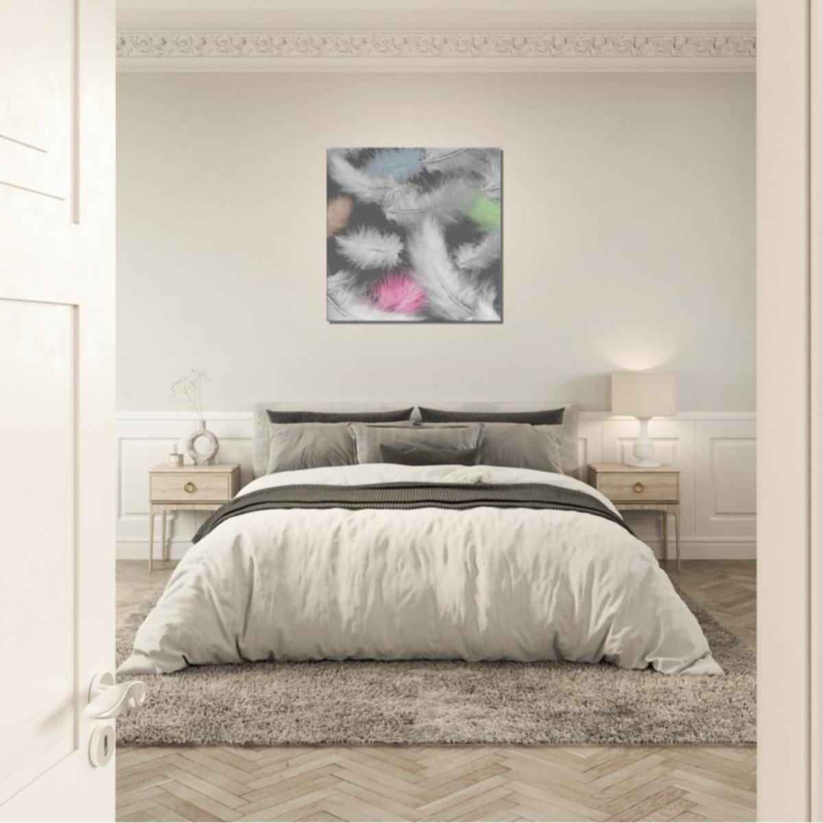 The Feathers Canvas in grey is a versatile piece that adds a soft, textured touch to contemporary and minimalist interiors. I love its subtle colour palette and delicate feather imagery, which works particularly well in neutral-toned spaces or as a calming focal point above a sofa or sideboard. Practical styling tips include pairing it with muted décor to emphasise its gentle tones, or adding a few colourful accessories-like pastel cushions or vases-to create visual interest. It also works beautifully in bedrooms or living areas where a touch of elegance and tranquility is desired. Just make sure to hang it at eye level for maximum impact and to keep the feathers looking fresh and airy.