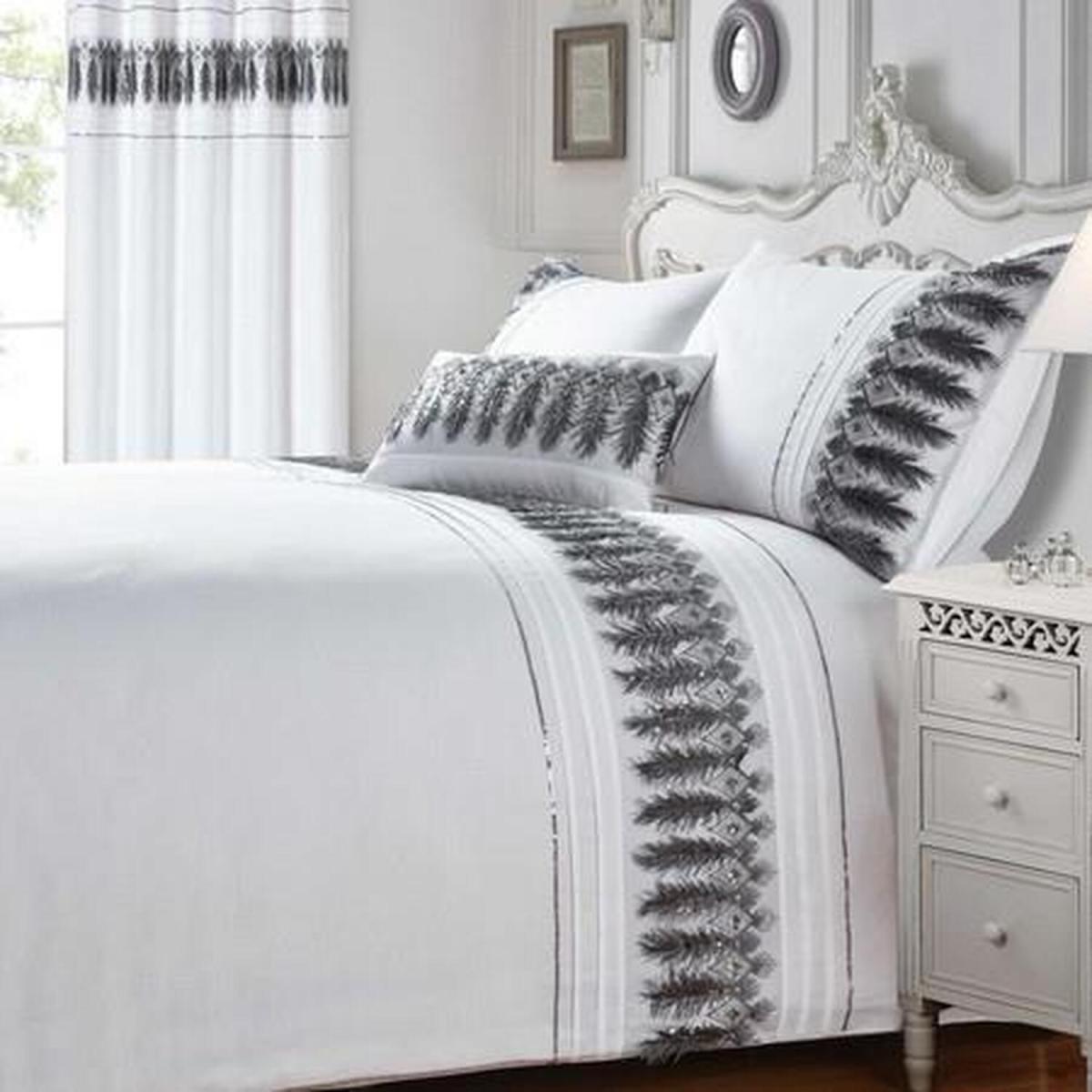 Create a luxurious and gorgeous look in your bedroom with the minimalistic white and silver 'Feathers' bedding range. Featuring a beautiful band of greysilver feathers along the top of the duvet cover and the sides of the pillowcases on a sleek white background, finished off with a sparkling sequin and diamante detailing for the added effect, this bedding will offer your room a stunningly modern look.