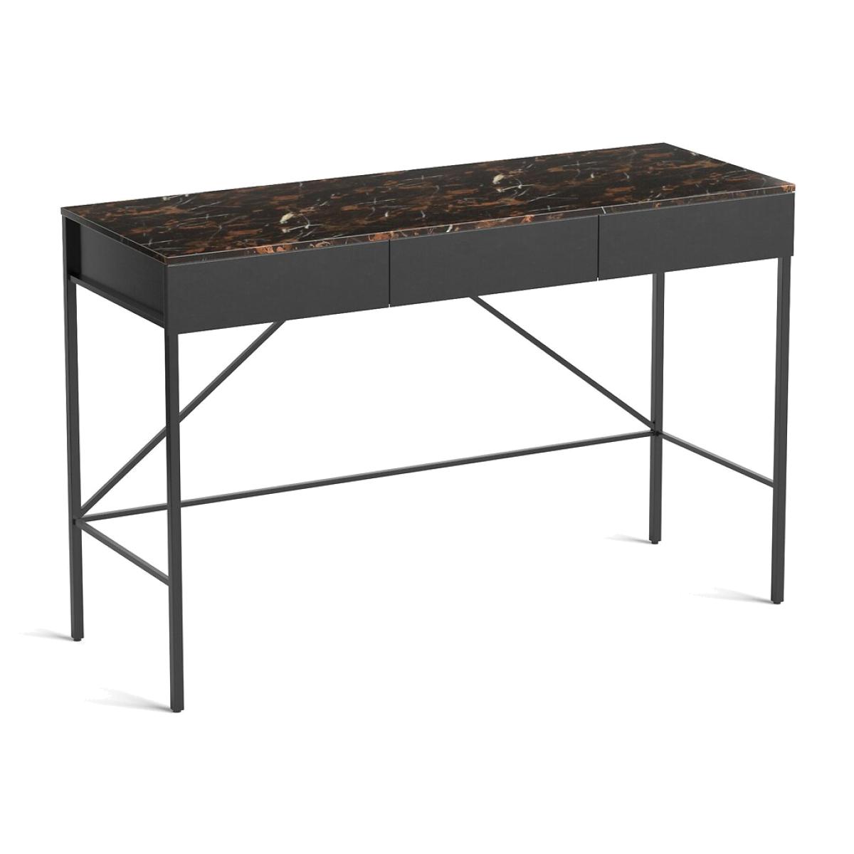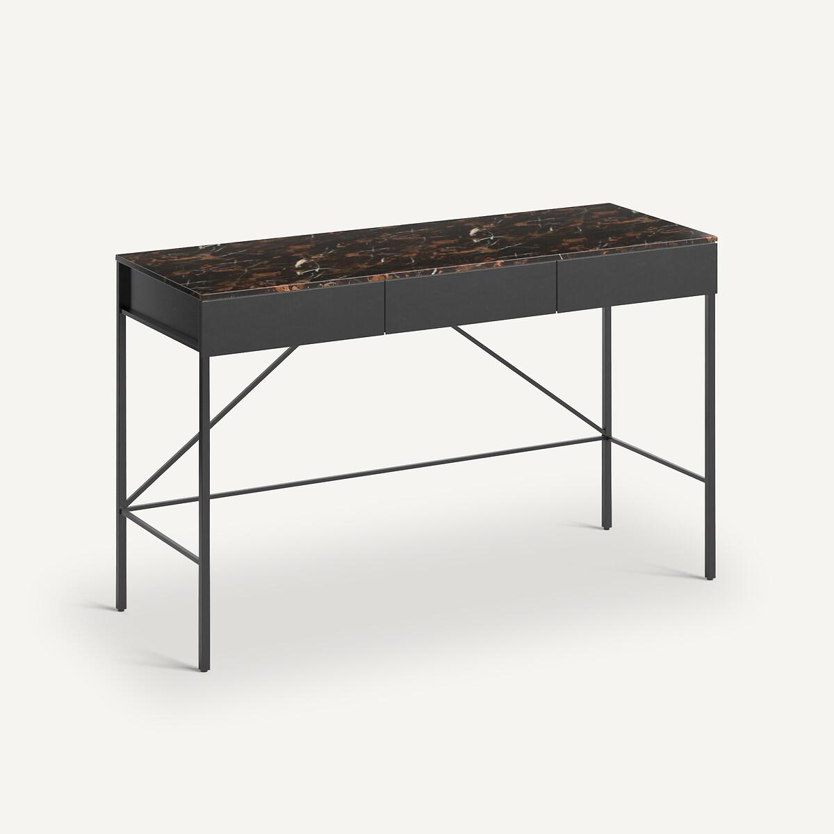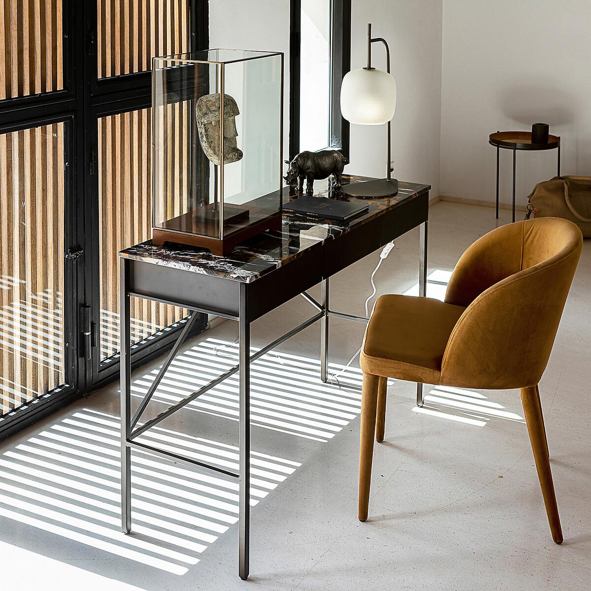 The Febee desk. A successful alliance of amber marble and metal for a desk which, in addition to its elegant line, provides storage with its three drawers.