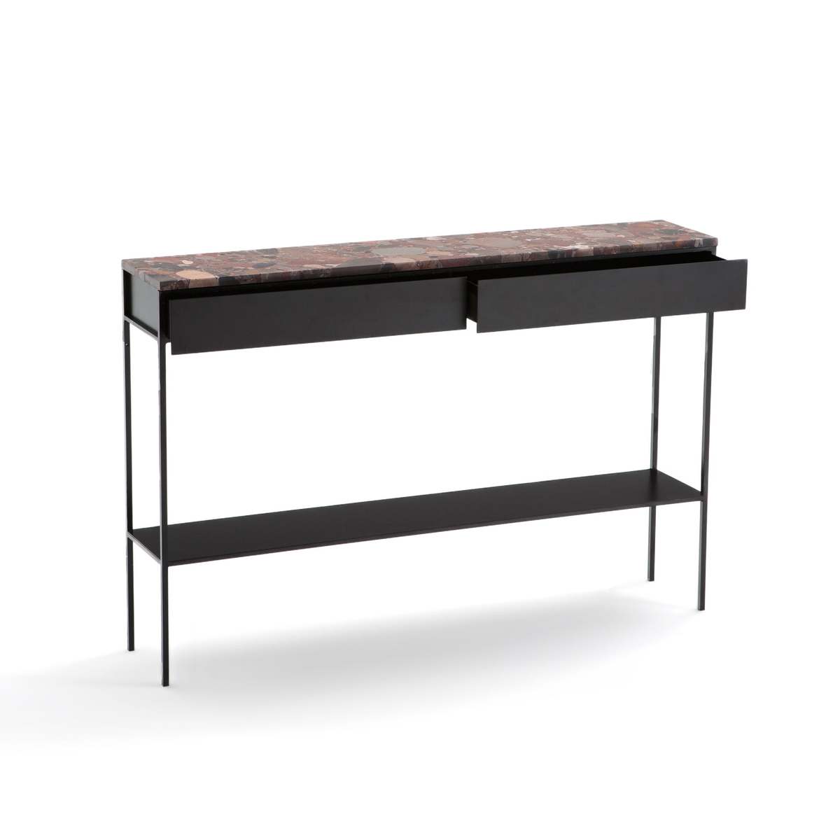 I love this console table because of its sleek, minimal design combined with a textured top that adds visual interest. It works well in both contemporary and industrial interiors, providing functional surface space without overwhelming a room. Practical styling tips include using it as a feature behind a sofa, a handy entryway piece, or even in a dining area for extra surface area. Decorate with a mix of lamps, decorative trays, or artwork leaning against the wall for a layered, curated look. Its open structure makes it adaptable to various spaces, and the understated colour palette allows it to blend seamlessly with a range of colour schemes.