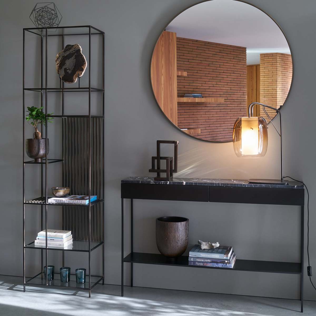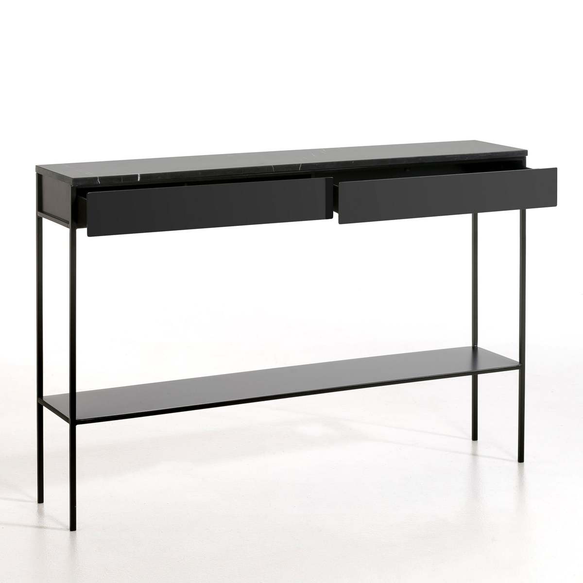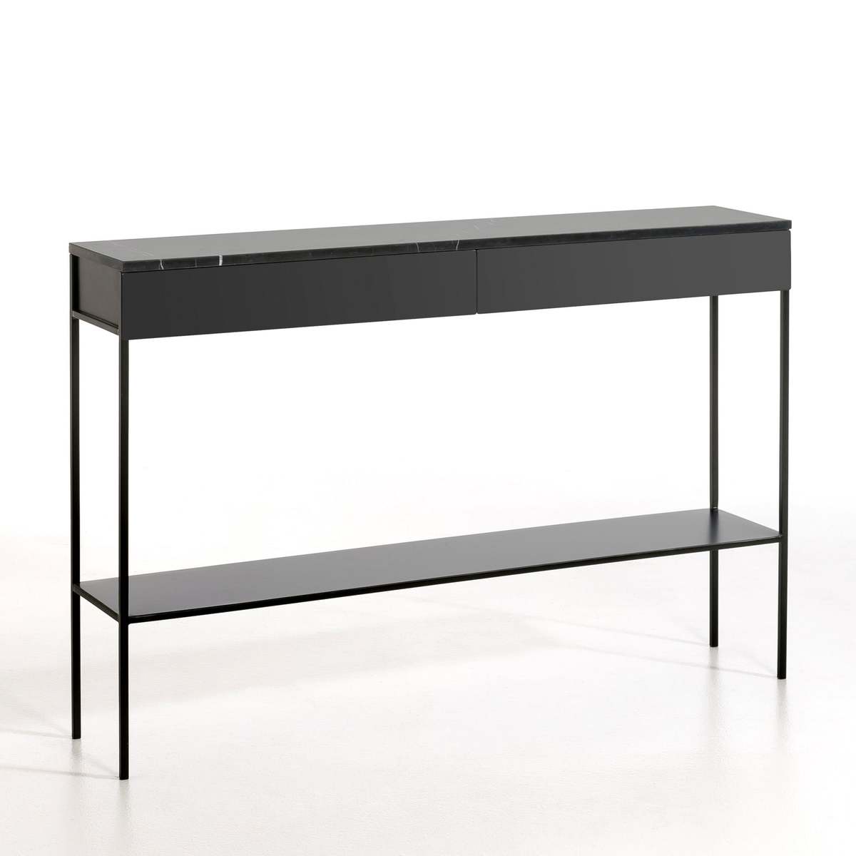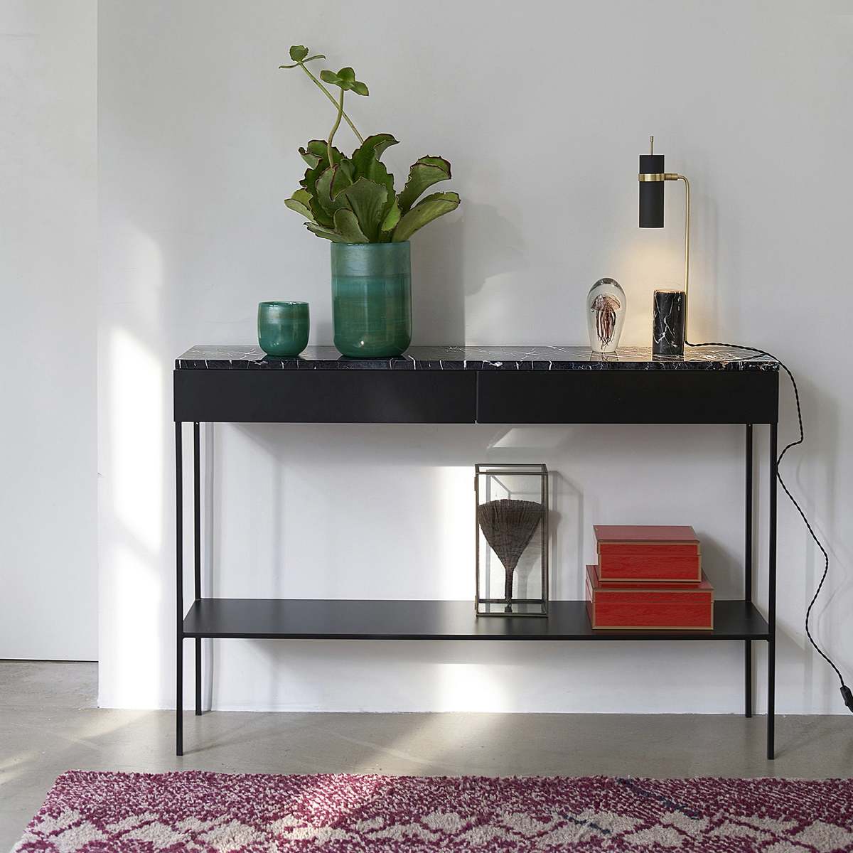 I love this marble top and metal console for its sleek, modern appeal and versatile design. It works particularly well in contemporary or minimalist interiors, adding a touch of sophistication without overwhelming the space. It’s ideal for placing behind a sofa or in an entryway, providing both style and practicality. When styling, consider layering with a few curated accessories like a tray for keys, a slender vase, or a statement lamp to add character. The marble surface also makes it easy to keep clean, while the metal frame keeps it sturdy and lightweight. Overall, this piece offers both functional surface area and aesthetic appeal, making it a great addition to various interior schemes.