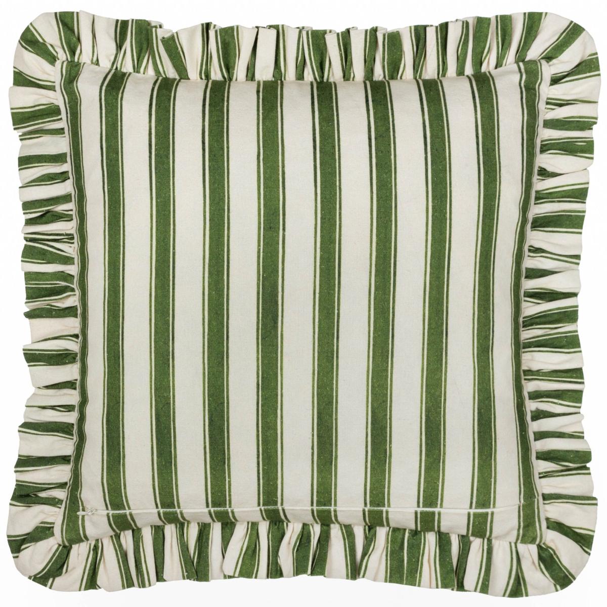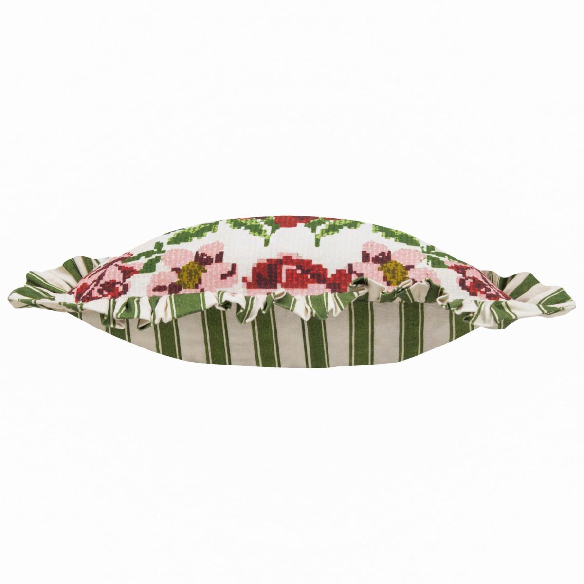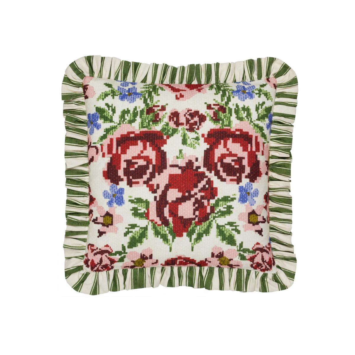* Bold floral design* Ruffle edge detailing* 100% Cotton* Different fillings available This cushion's intricate pattern, in shades of pink, mauve, and green, evokes the tranquil charm of a handcrafted tapestry, making it a beautiful statement piece for any home. The cushion is completed with a striped reverse and an elegant ruffled edge, adding a touch of refinement to its design.