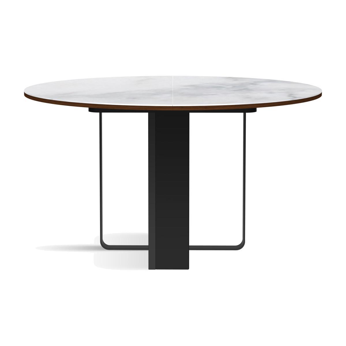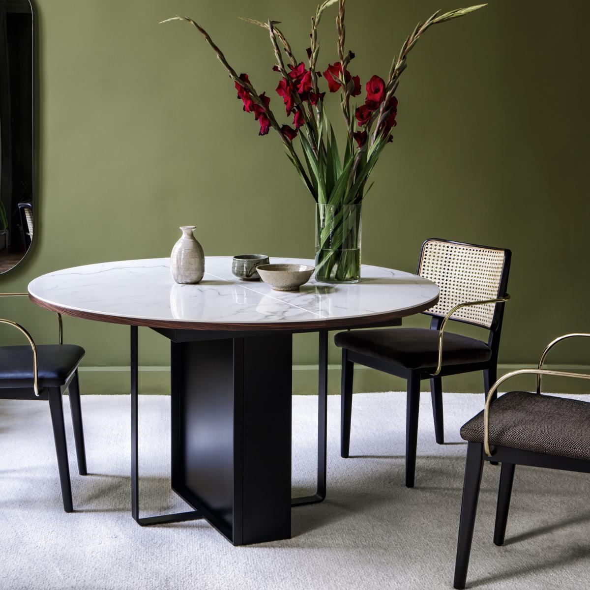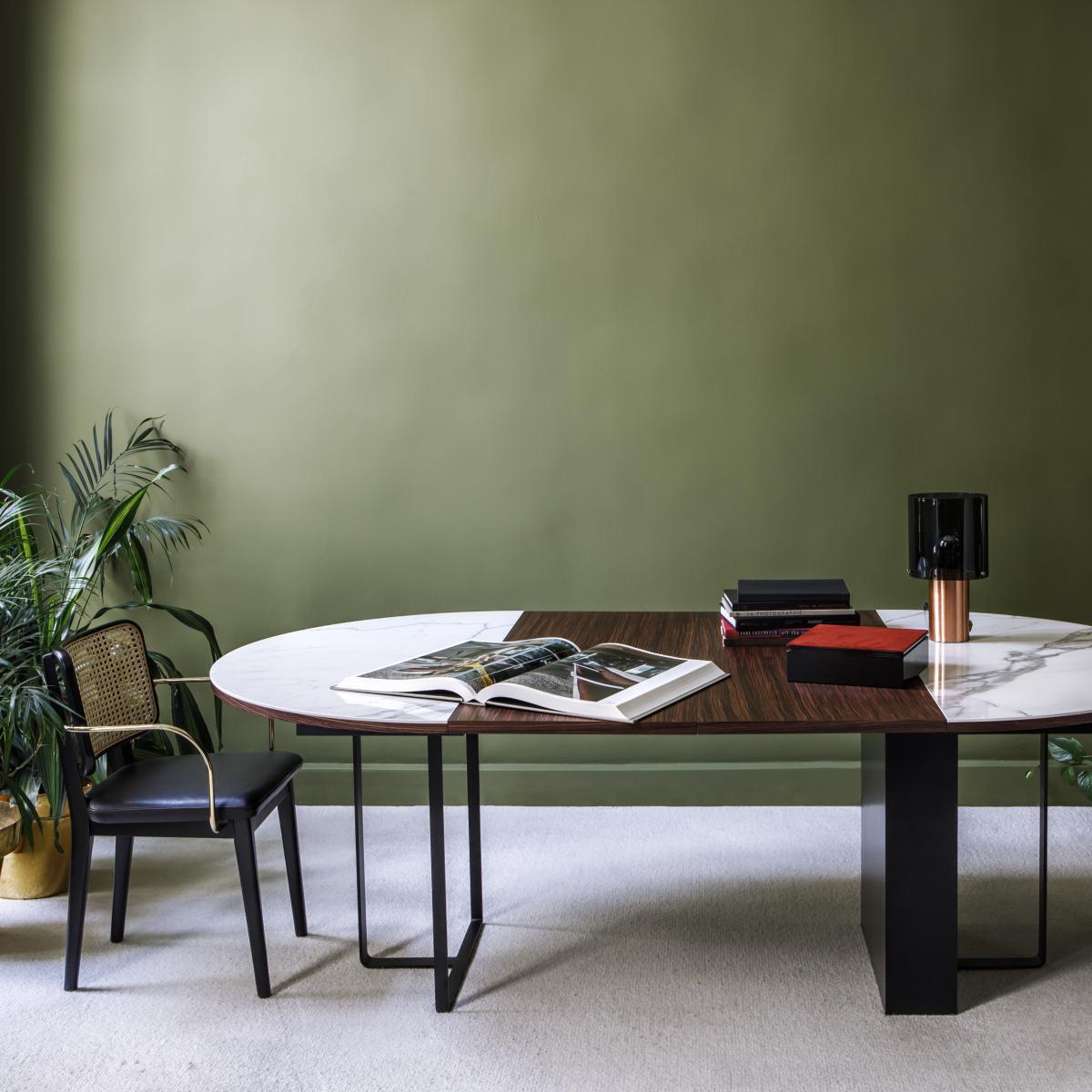 An extendable dining table capable of seating up to 10 people with rare elegance. The Felice table transcribes all the codes of the Parisian design house Red Edition: sophisticated spirit inspired by Parisian salons, mix of materials, attention to detail. This table offers a superb combination of noble materials: the marble-effect ceramic top is combined with central extensions in Rosewood. A two-material effect that’s both original and refined. Waterproof and stain-resistant, the ceramic perfectly mimics marble, while being lighter and easier to maintain. Noble and refined, the top contrasts with the modern style of the solid, geometric black metal base. An ingenious black wooden box located at the base lets you store the Rosewood extensions when you’re not using them. The Felice table top can be extended with two central extensions, going from a diameter of 130 cm to a dimension of 175 x 130 (with one extension), up to 220 x 130 (with two extensions). Without extension, the top is round, with the extensions it’s oval. Parisian brand Red Edition invites you to rediscover a French way of life with modern design codes. Its recipe: a Parisian signature, clean lines and a requirement for noble materials.